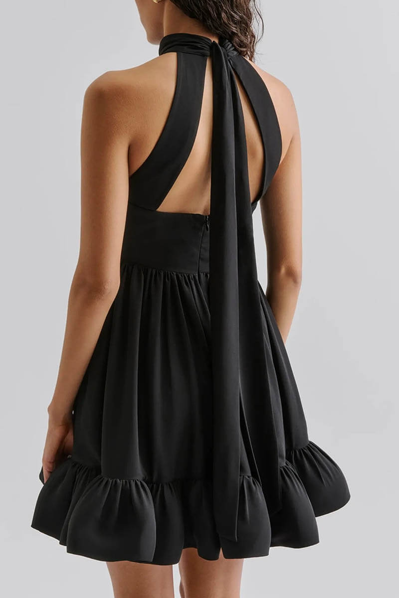 Halterneck miniklänning med öppen rygg, volangkjol och markerad midja som knyts i nacken.