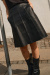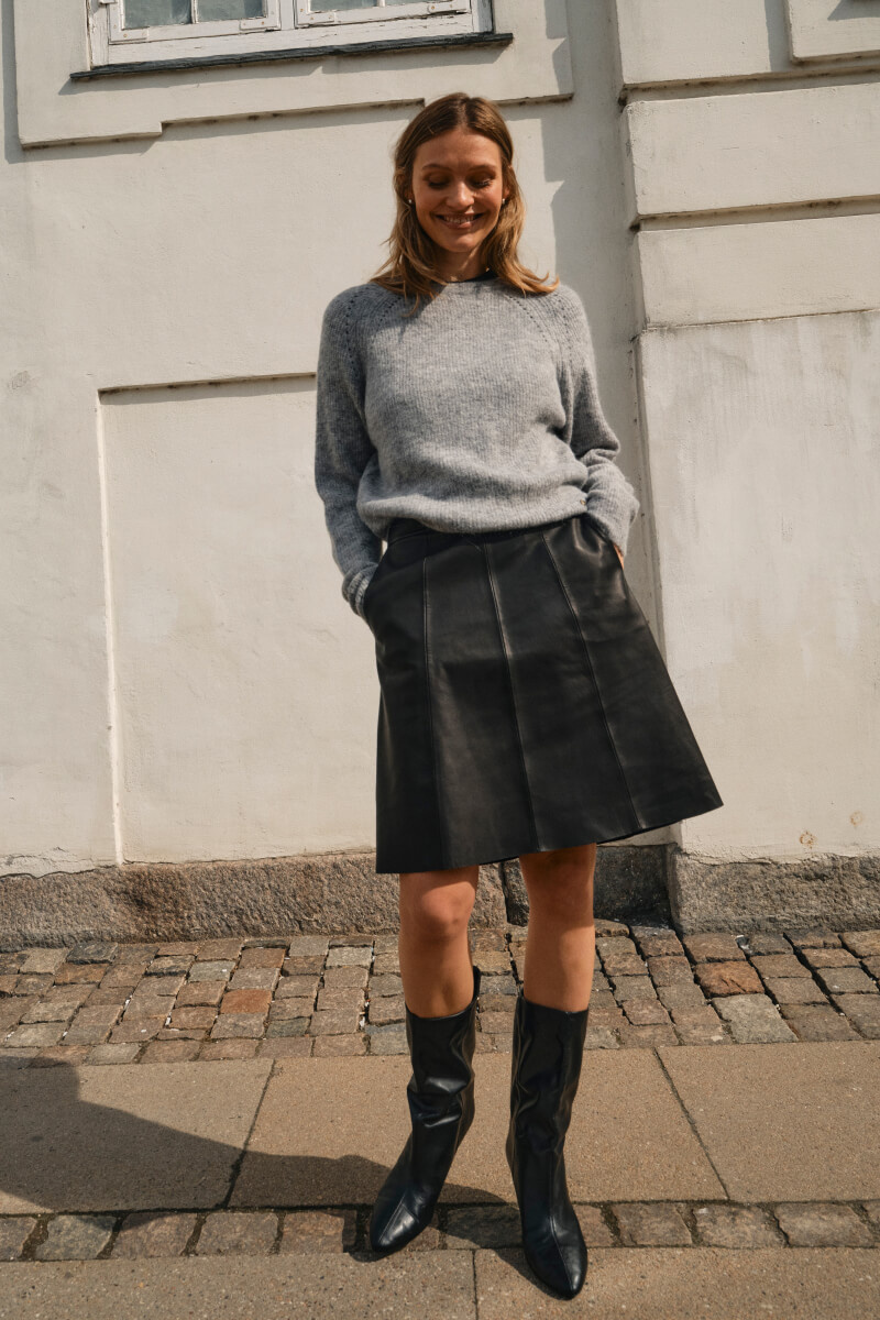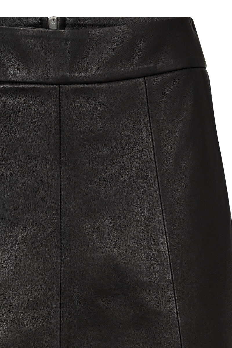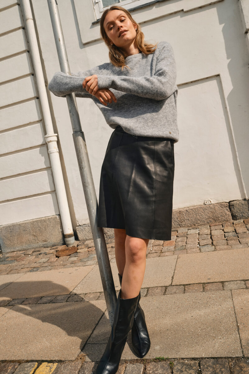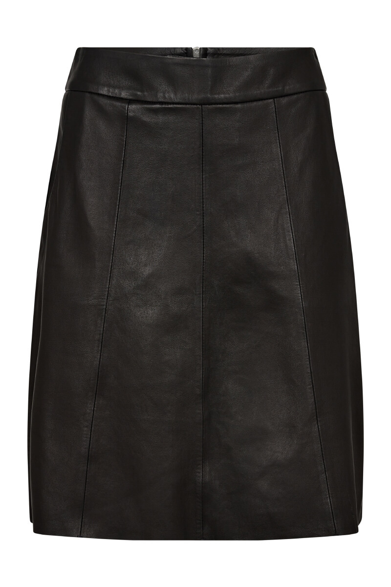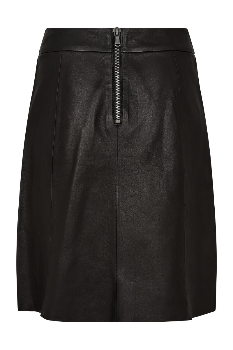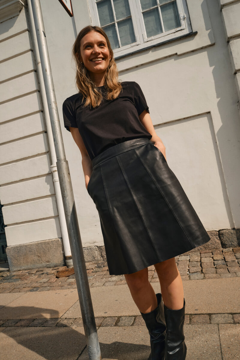 En svart kjol i mjukt läder med A-linjeform och längd ovanför knät är en tidlös stilikon. Bär den med stickad polotröja och höga stövlar för en balanserad look, eller addera en vit skjorta och loafers för modern kontrast.Svart kjol i mjukt läder med A-form, dragkedja bak, hög midja, fickor i sidan och slutar ovanför knät från MosMosh.