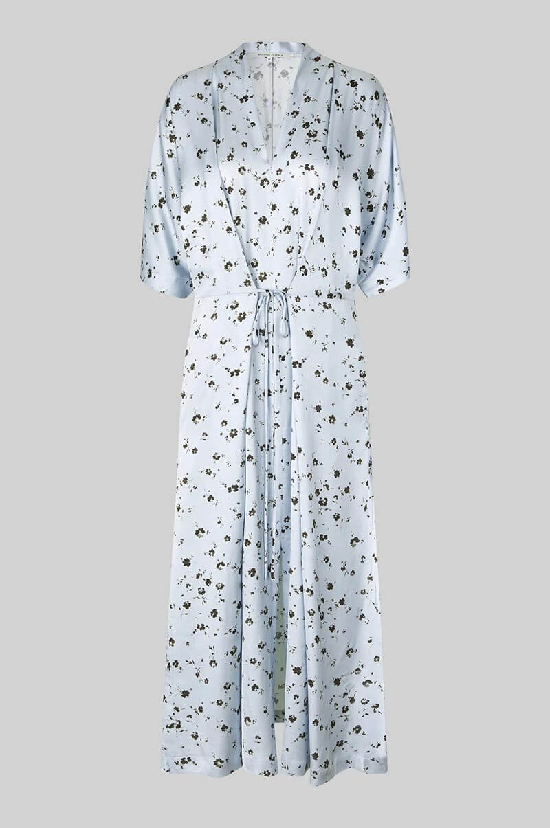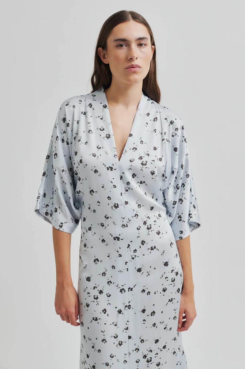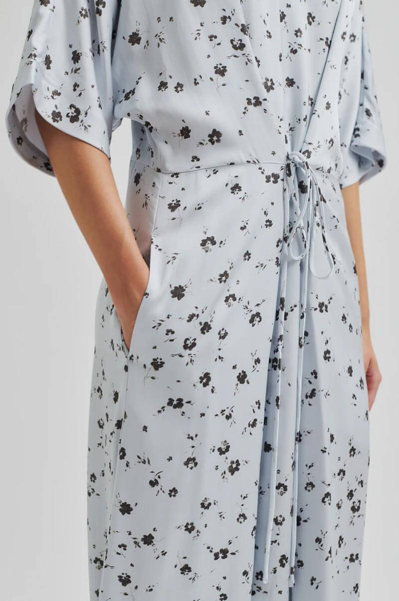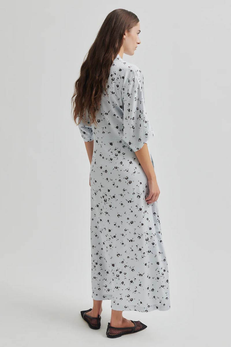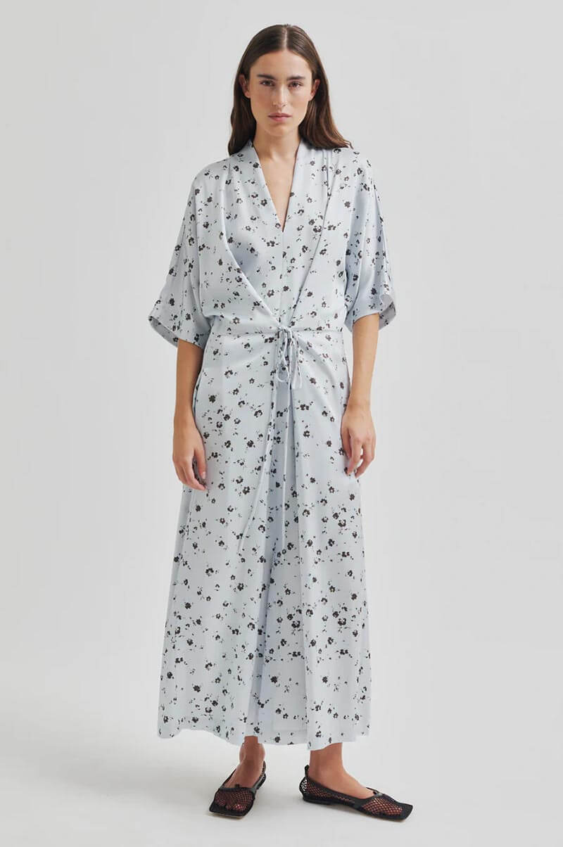 En maxiklänning i luftigt material med litet blommönster som är lika fint till festen som en sommarlunch. Du väljer hur du vill bära klänningen med knyt fram som blir lätt avslappnat med en fin drapering eller knyt bak för en mer clean look.Mönstrad klänning i en mjuk viskosblandning med v-ringning, lös passform, matchande bälte i midjan och fickor i sidan från Second Female.