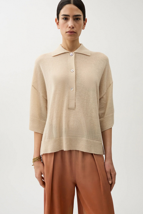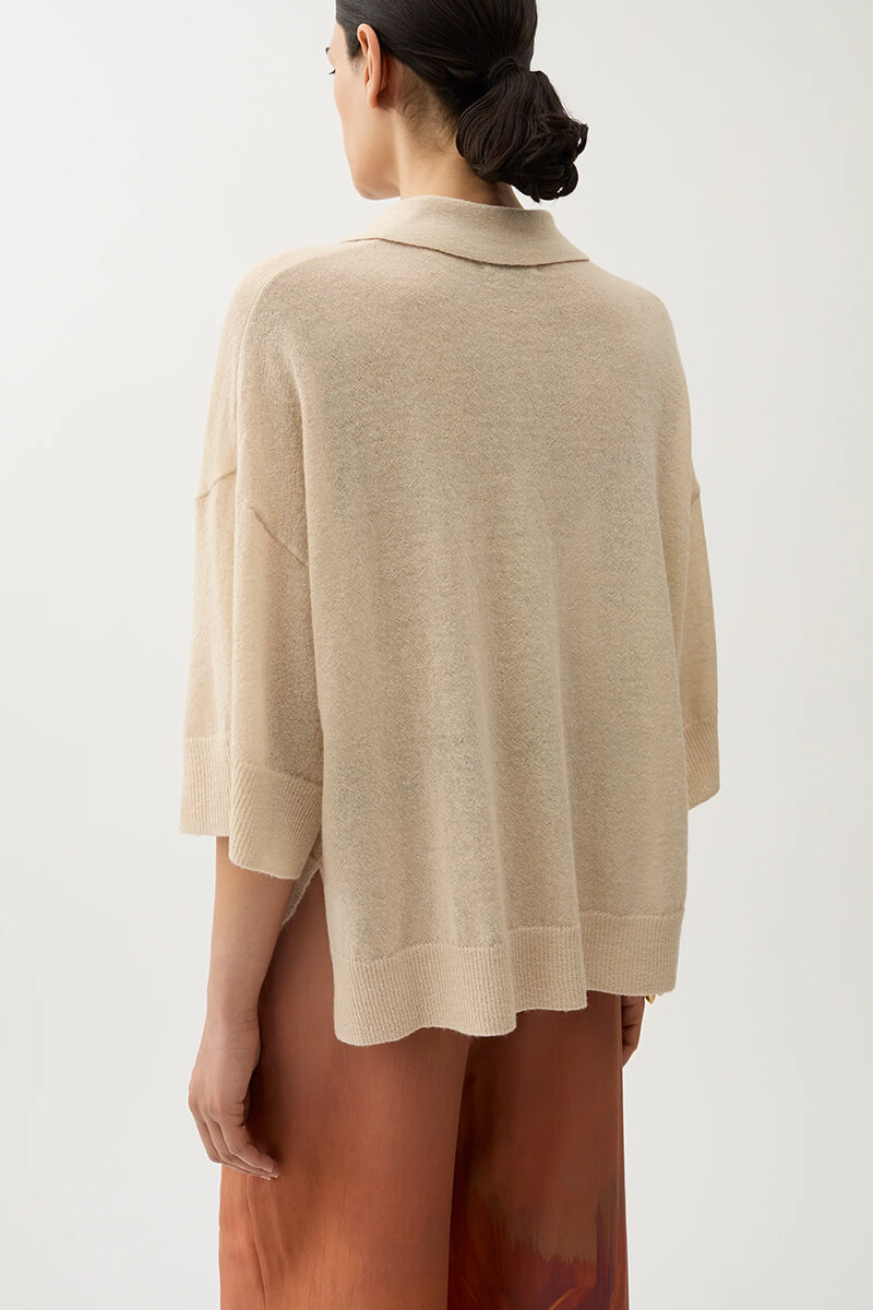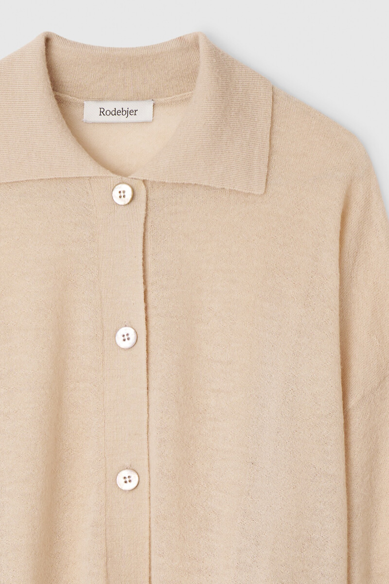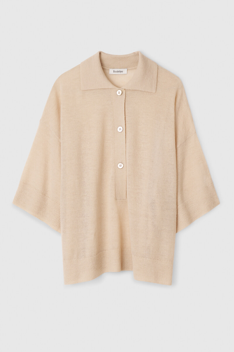 Oversized beige pikétröja – stilren, lyxigt avslappnad. Bär till vida jeans, markerat skärp och loafers för en modern preppy-look. Perfekt basplagg där minimalism – ett statement i sin enkelhet.Stickad tröja i något transparent ullblandning med en oversize passform, krage, fina knappar fram, korta vida ärmar, ribbstickade kanter och fallande axelsömmar från Rodebjer.