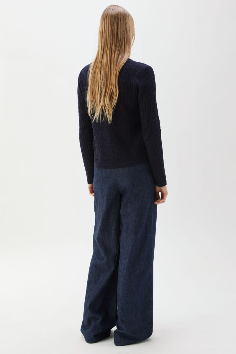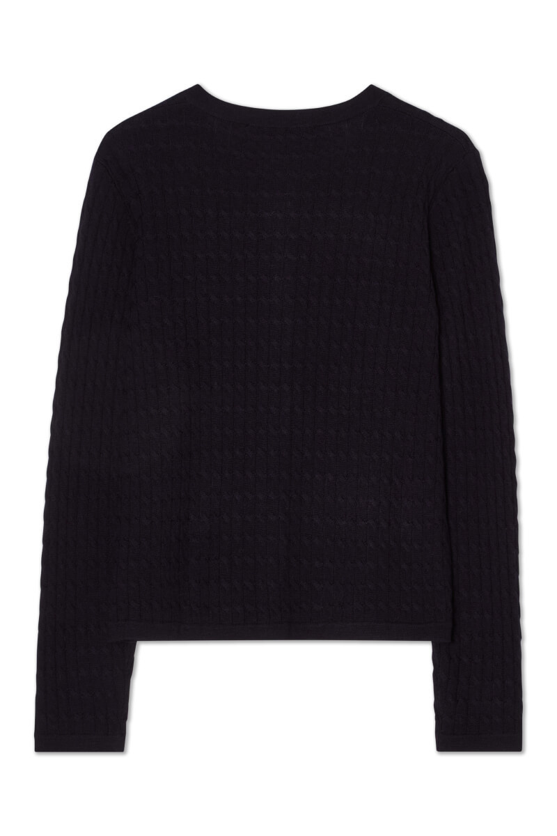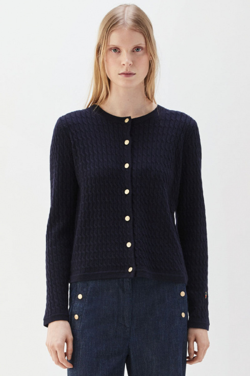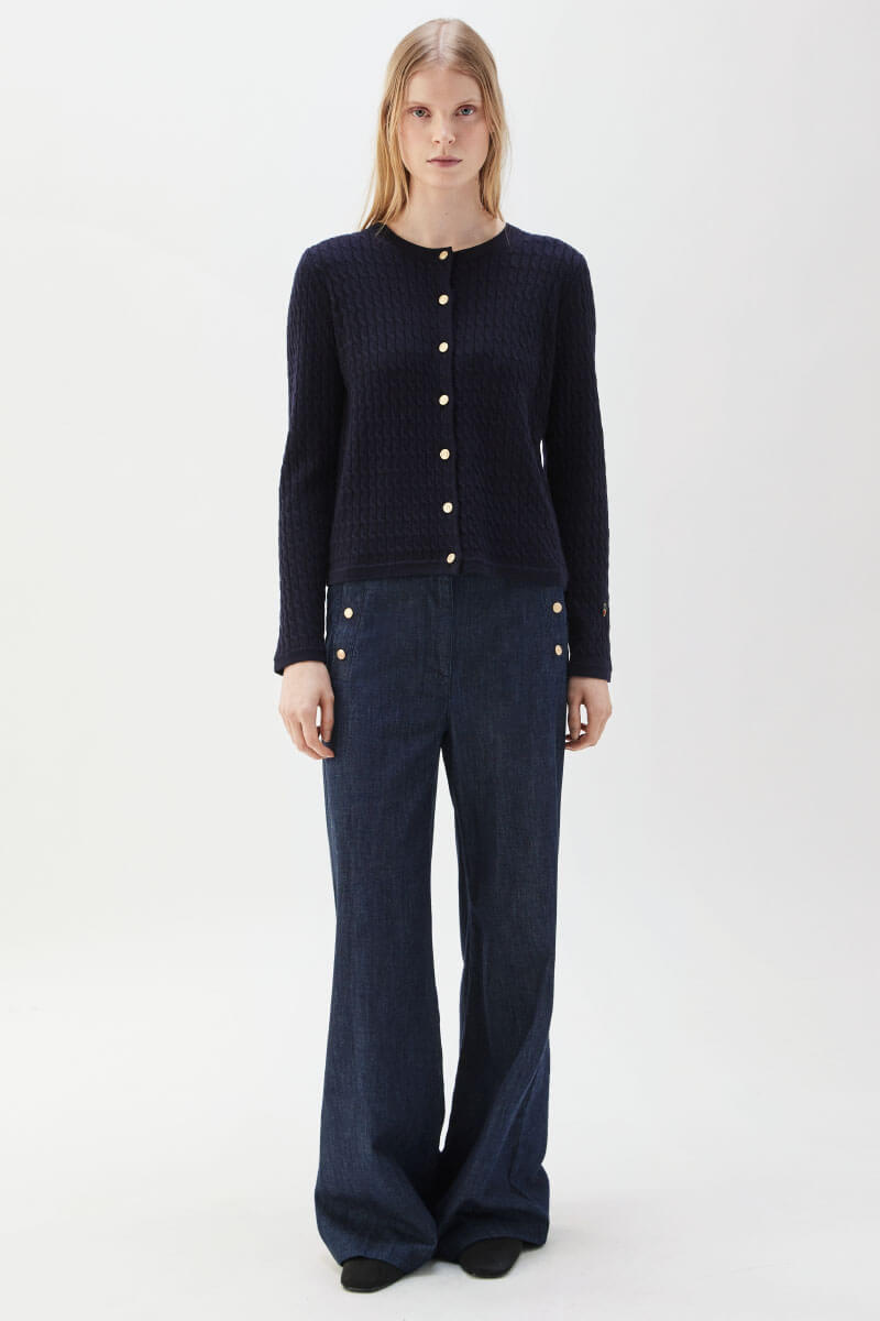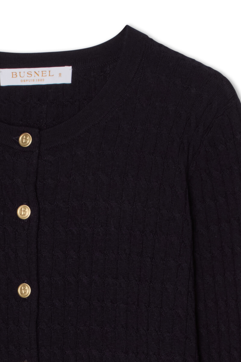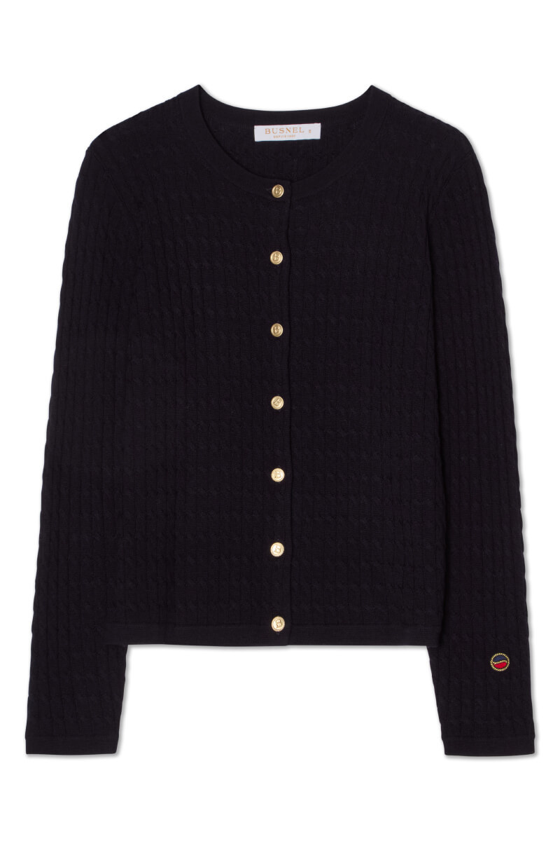 En kabelstickad kofta med rund halsringning och normal passform är en klassiker med modern känsla. Bär den knäppt över en vit skjorta för en preppy look eller öppen till jeans och loafers för en avslappnad men sofistikerad vardagsstil.Kabelstickad kofta i mjuk merinoull med normal passform, rund halsringning, stängs med guldfärgade knappar fram och liten broderad logga vid ärmslut från Busnel.