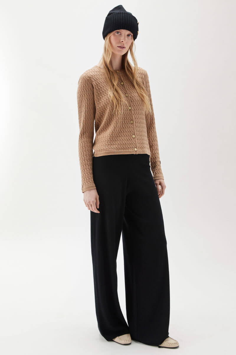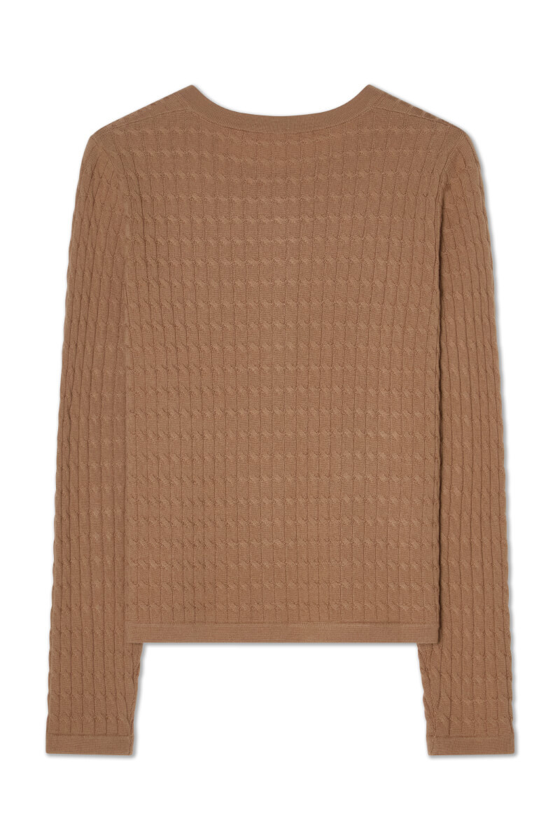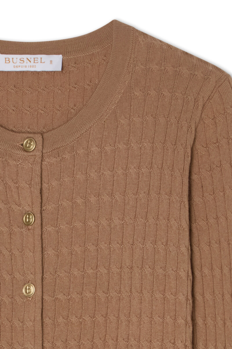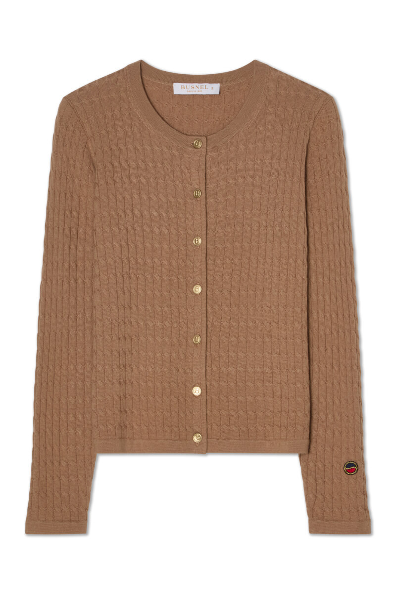 En kabelstickad kofta med rund halsringning och normal passform är en klassiker med modern känsla. Bär den knäppt över en vit skjorta för en preppy look eller öppen till jeans och loafers för en avslappnad men sofistikerad vardagsstil.Kabelstickad kofta i mjuk merinoull med normal passform, rund halsringning, stängs med guldfärgade knappar fram och liten broderad logga vid ärmslut från Busnel.
