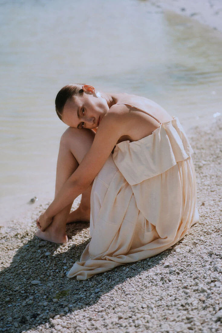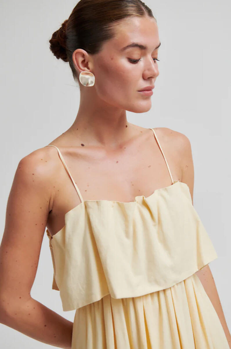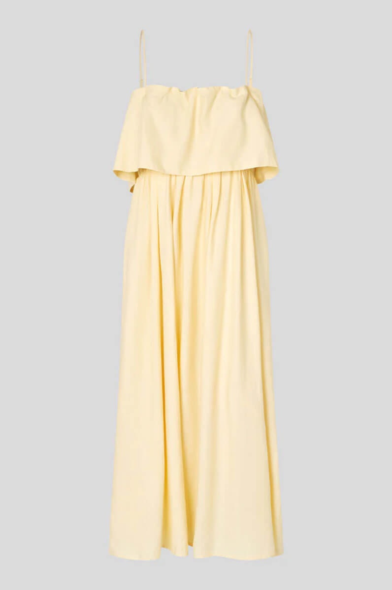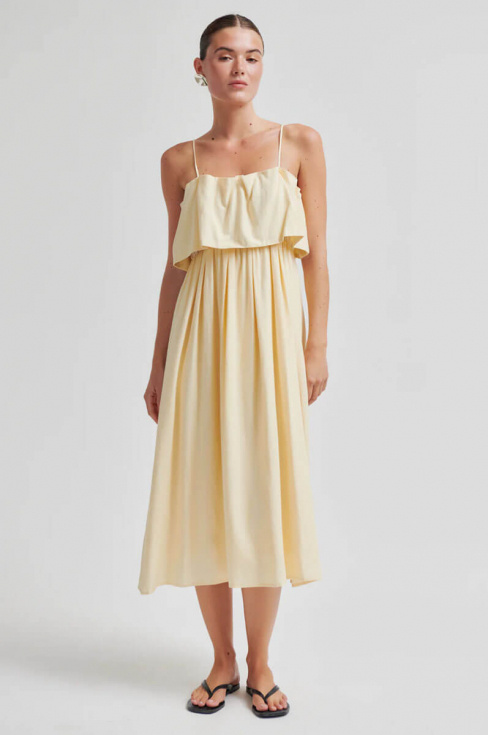 Second Female klänning med volanger i flera lager. Klänningen är tillverkad i en lätt linn- och viskosblandning. Den har tunna, justerbara axelband samt resår på insidan av överkanten. Volangdetalj över bysten för extra volym. Helfodrad.