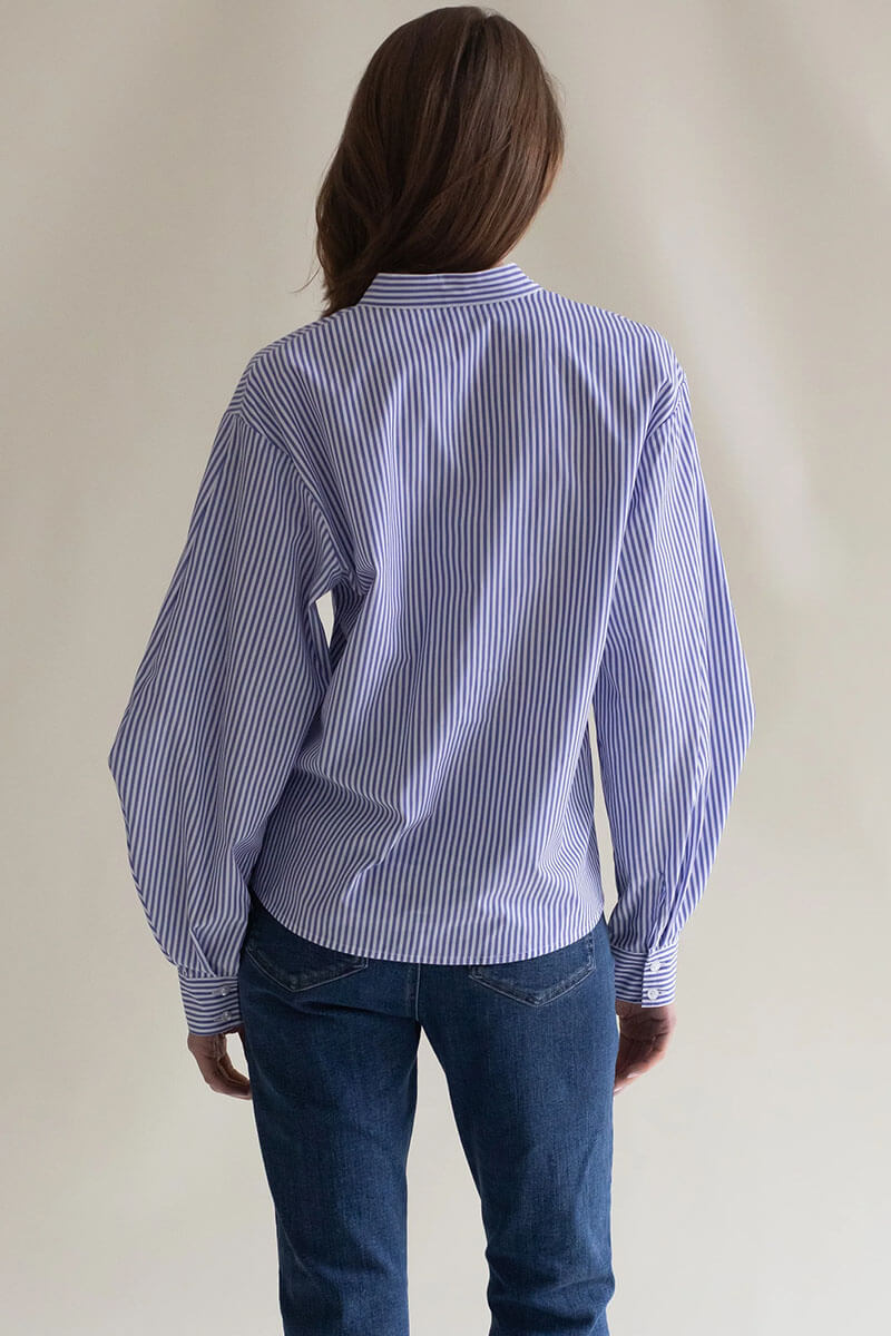 Denna skjorta i krispig bomull kombinerar klassiskt formspråk med en modern twist och erbjuder en elegant, avslappnad silhuett. Med voluminösa ärmar, subtil midjeformning och en ren, kragefri halsringning blir skjortan ett stilrent och mångsidigt plagg i garderoben.