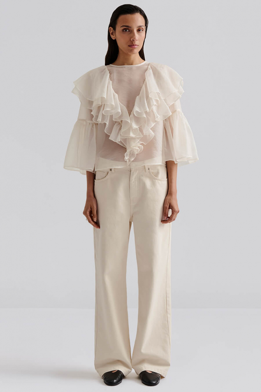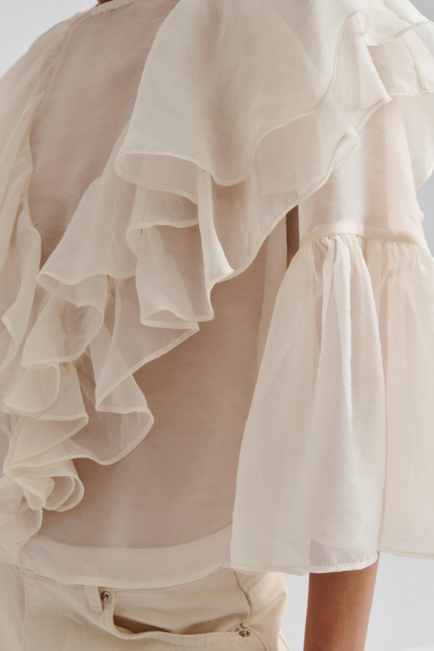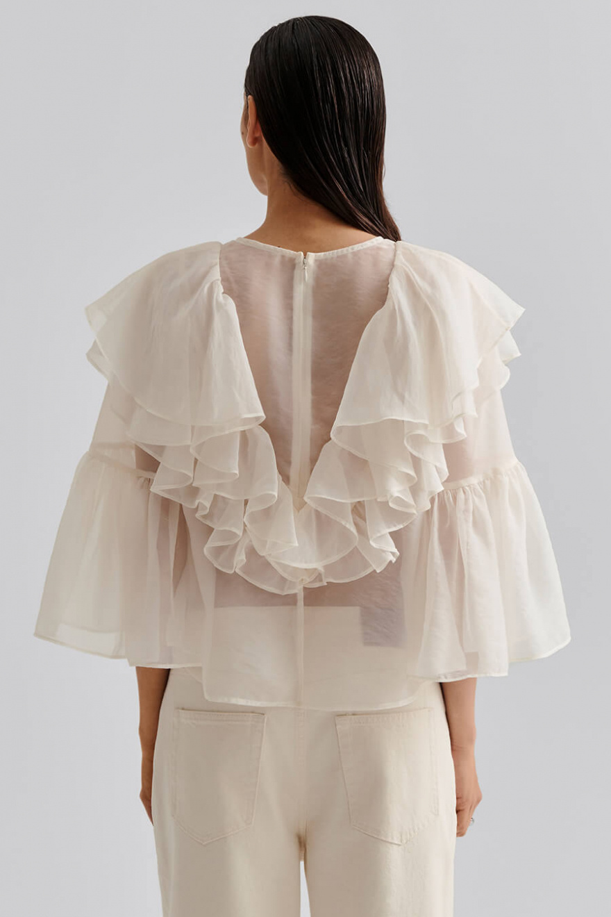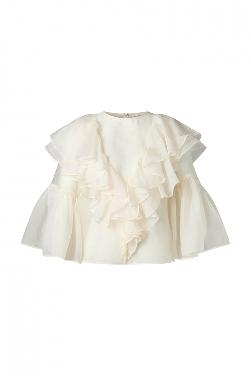 En blus i organza som flirtar med dramatik. Volangdetaljer och en hög halsringning ger en sofistikerad känsla, medan den lösa passformen gör den lika elegant som enkel att bära. Perfekt när du vill addera något extra till looken.Blus i organza med volangdetaljer, halvlång ärm, hög halsringning, stängs med gömd dragkedja bak och lös passform från Malina.