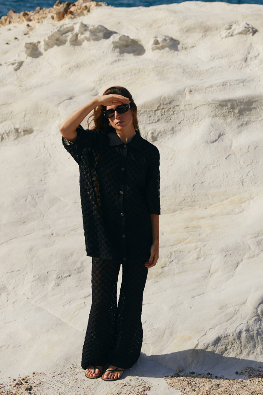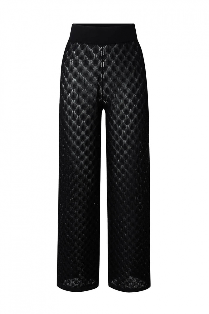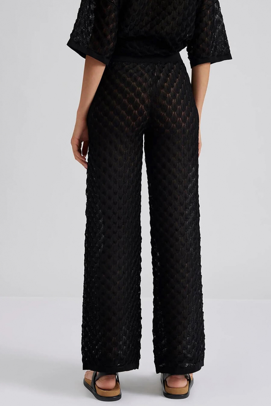 Svarta virkade byxor med hög midja och vida ben – en dröm i textur och silhuett. Lika självklara på stranden som i stan, stylade med en oversized skjorta eller en enkel topp. En tidlös investering för sommaren!Virkade byxor i en viskosblandning med hög midja, elastisk midjeband, vida ben och något transparenta från Malina.