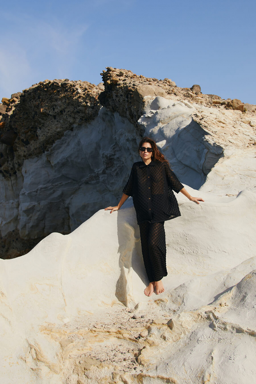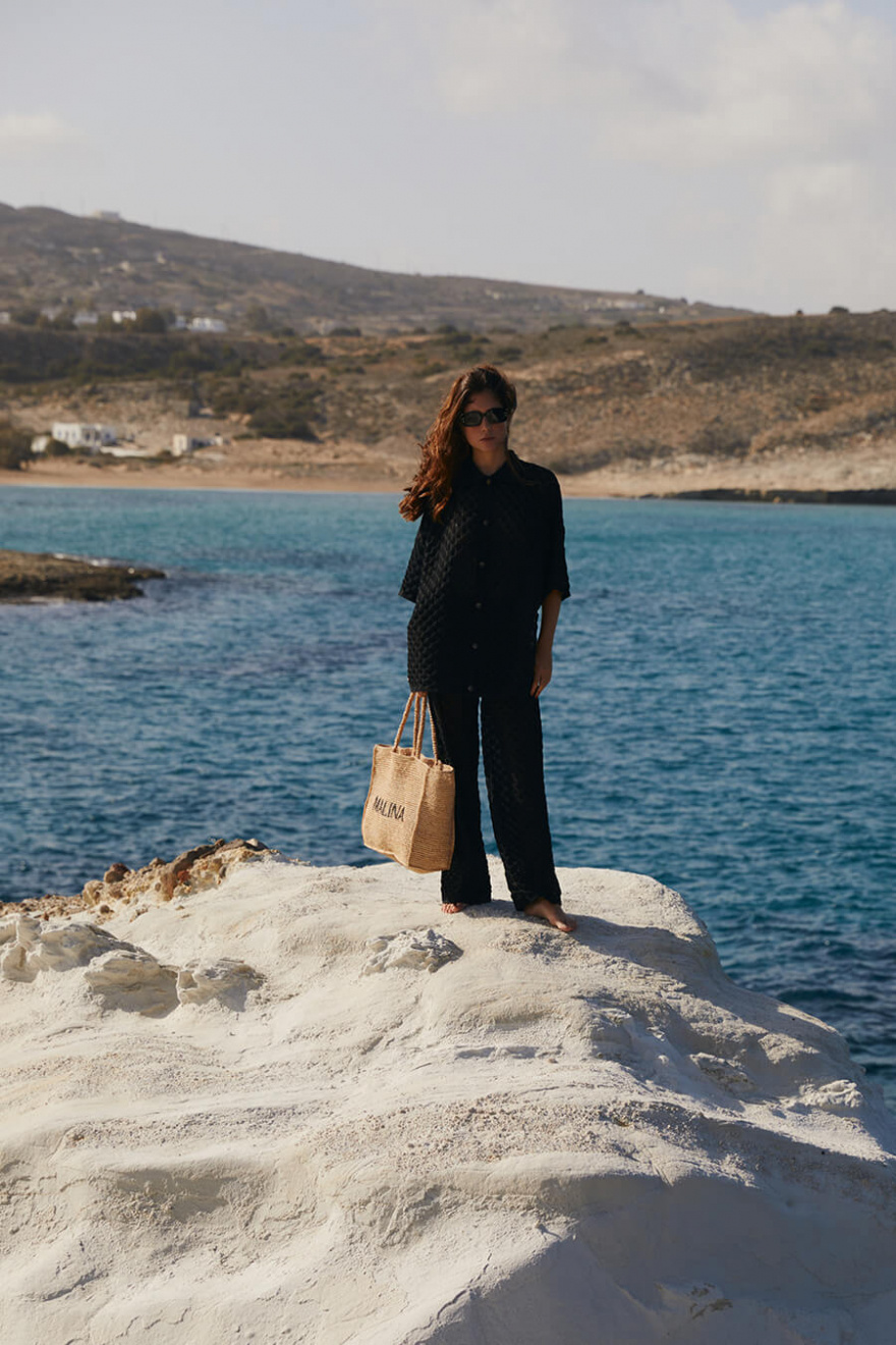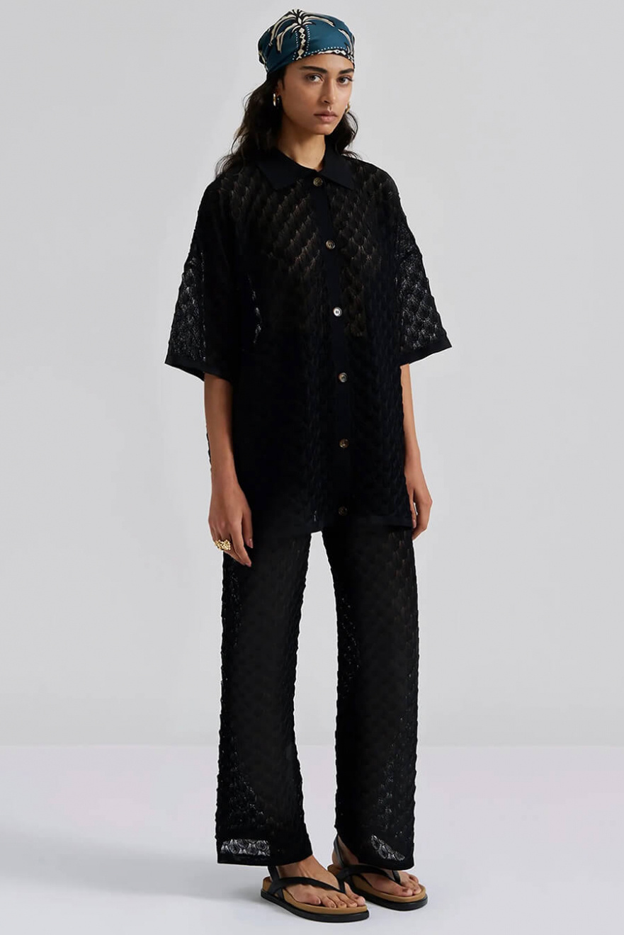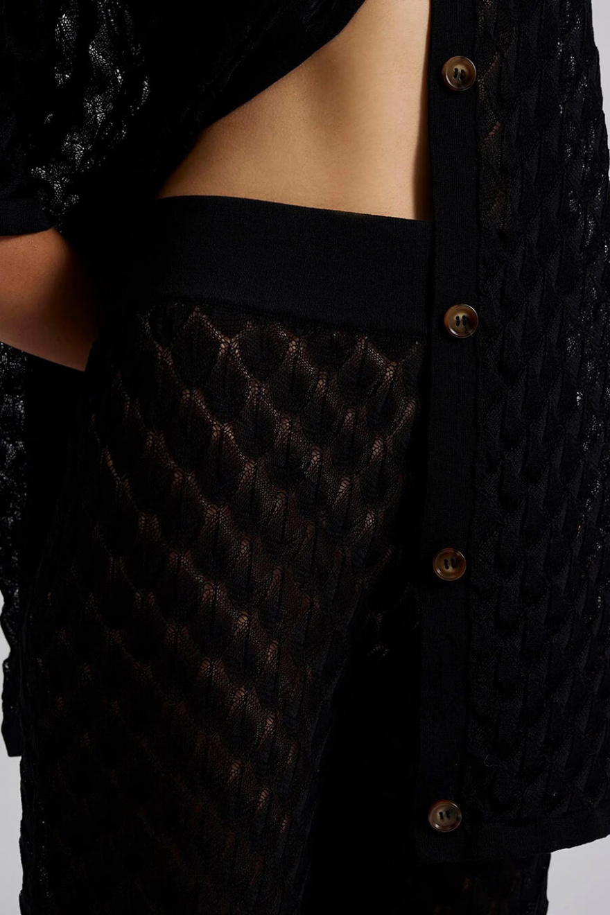 Svarta virkade byxor med hög midja och vida ben – en dröm i textur och silhuett. Lika självklara på stranden som i stan, stylade med en oversized skjorta eller en enkel topp. En tidlös investering för sommaren!Virkade byxor i en viskosblandning med hög midja, elastisk midjeband, vida ben och något transparenta från Malina.