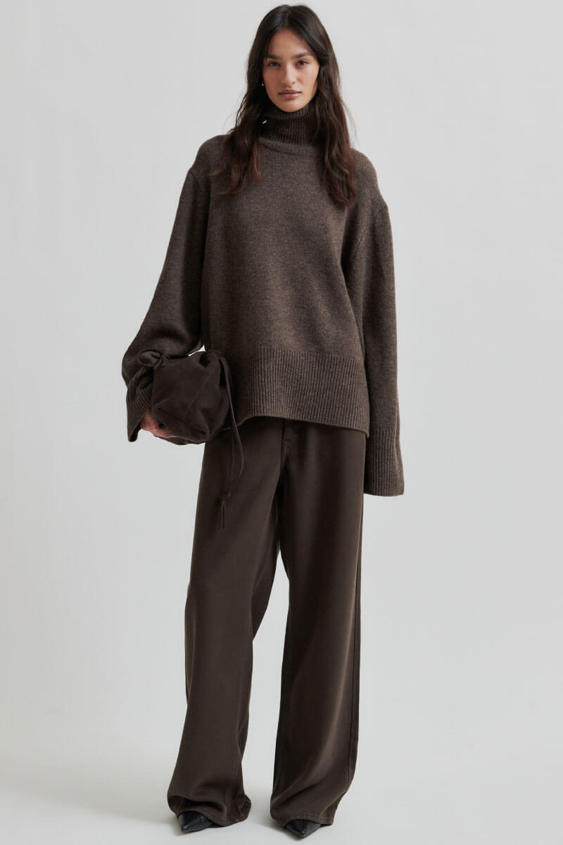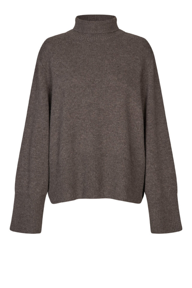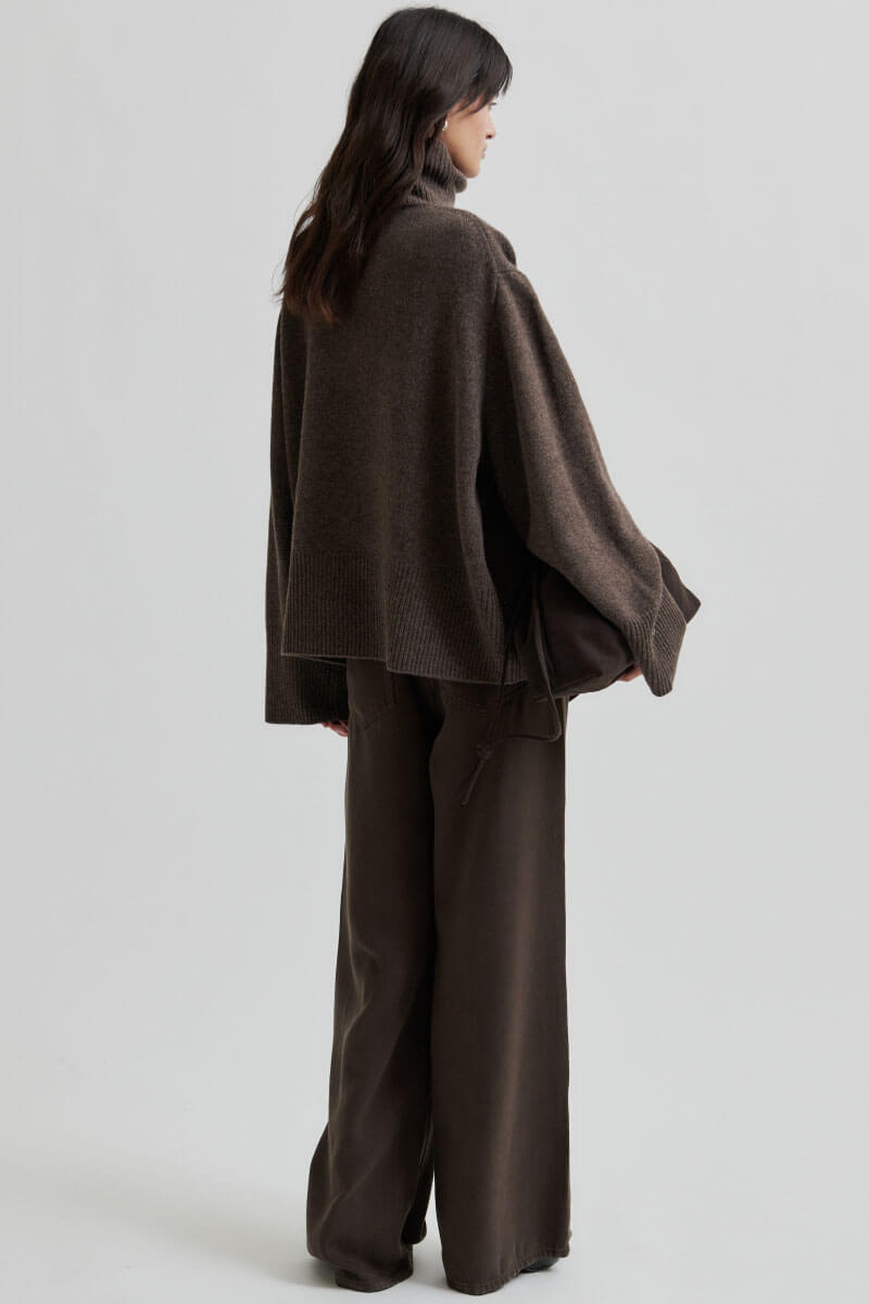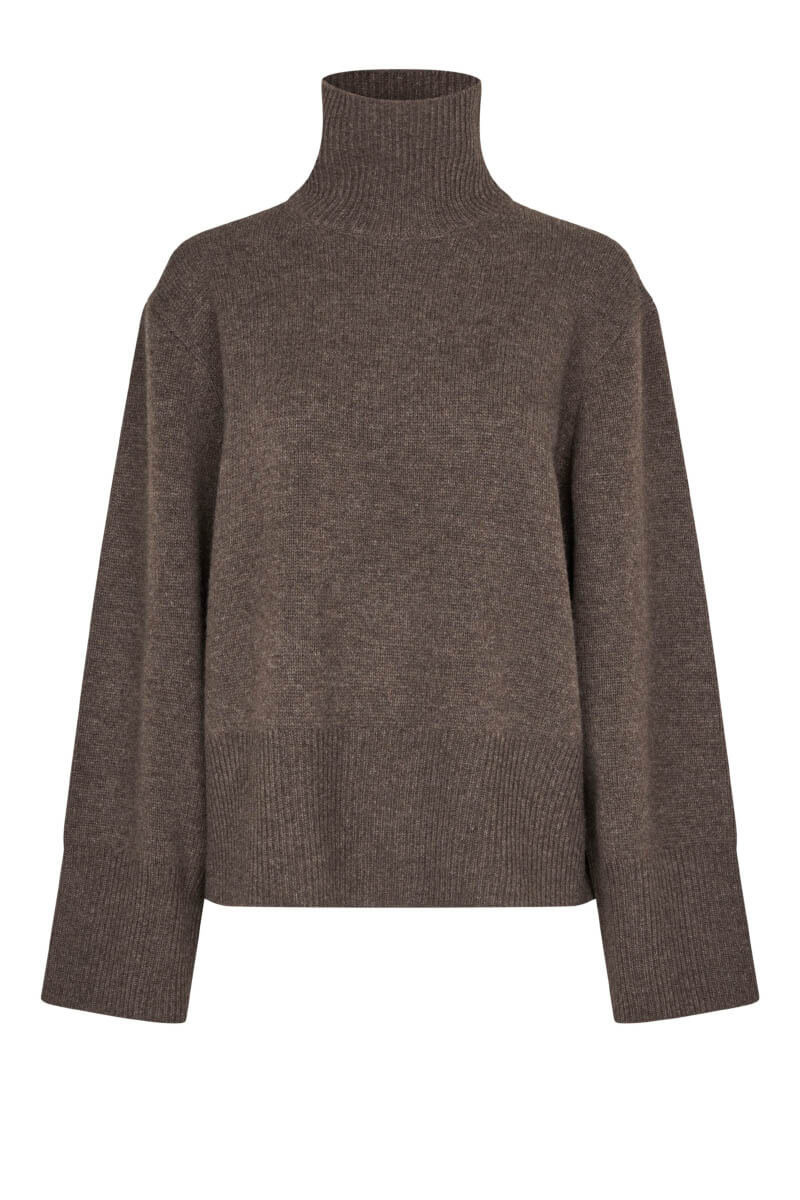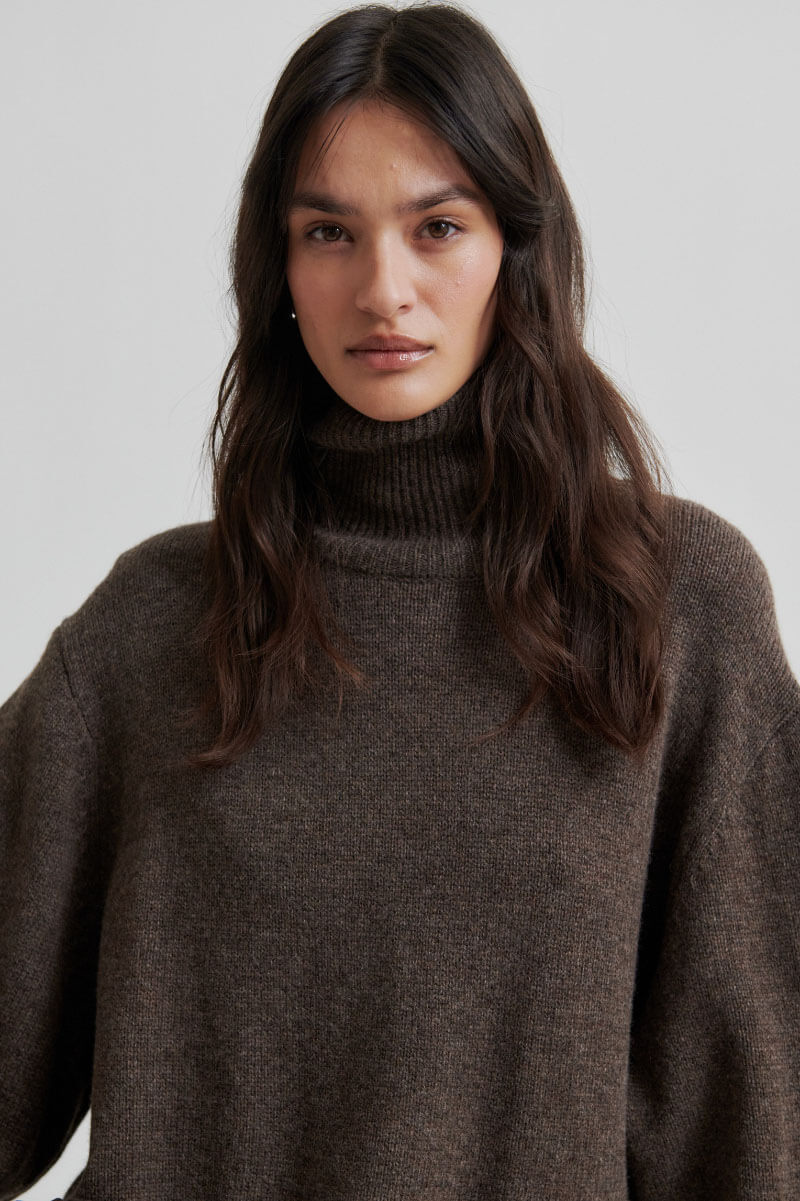 Styla den bruna tröjan med ullbyxor och loafers för en mjuk höststil, eller med raka jeans för en avslappnad twist. Den jordnära tonen ger värme och djup, medan den lösa passformen skapar en elegant, bekväm känsla.Stickad tröja i ull med lös passform, polokrage, fallande axelsömmar och ribbstickade kanter från Second Female.