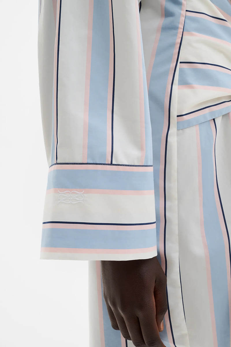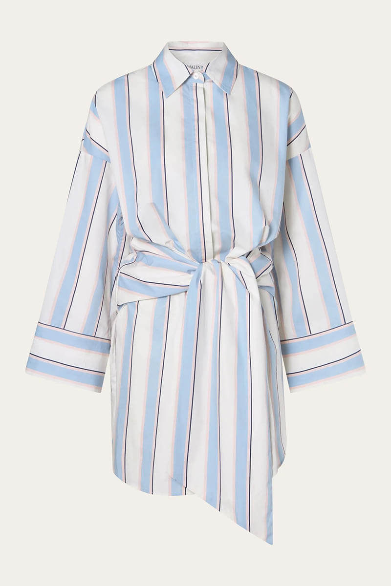 Randig skjortklänning i bomullspoplin med klassisk krage, dekorativ knytning i midjan och breda manschetter med broderad logotyp från Malina.