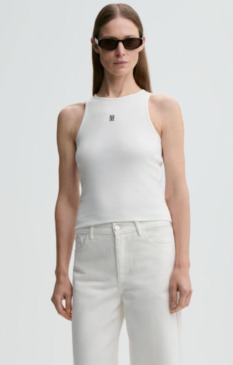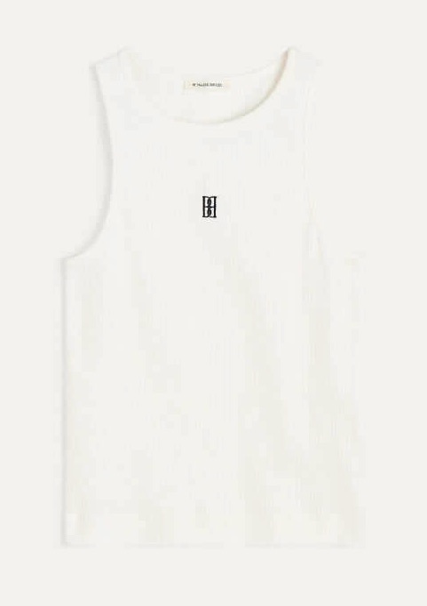 Den slim fit-skurna silhuetten framhäver figuren på ett elegant sätt, medan det broderade monogrammet framtill adderar en exklusiv och genomtänkt detalj. Färgen Soft White gör toppen tidlös och lätt att matcha med allt från jeans och kjol till kostymbyxor.