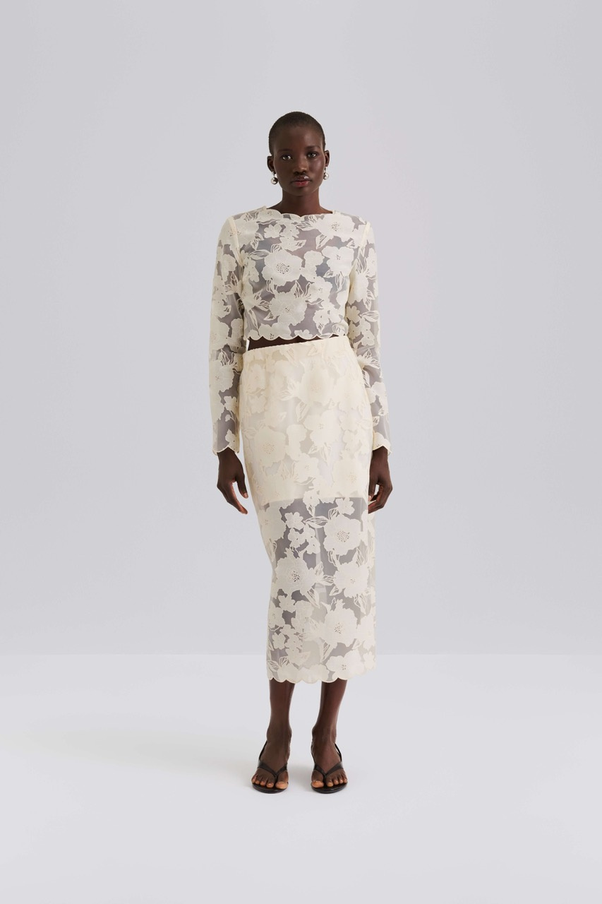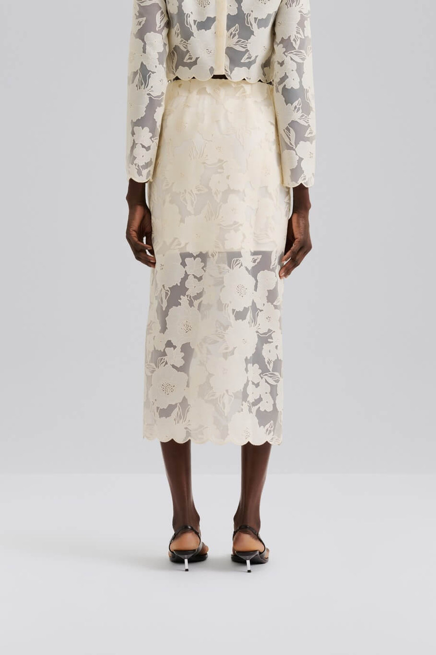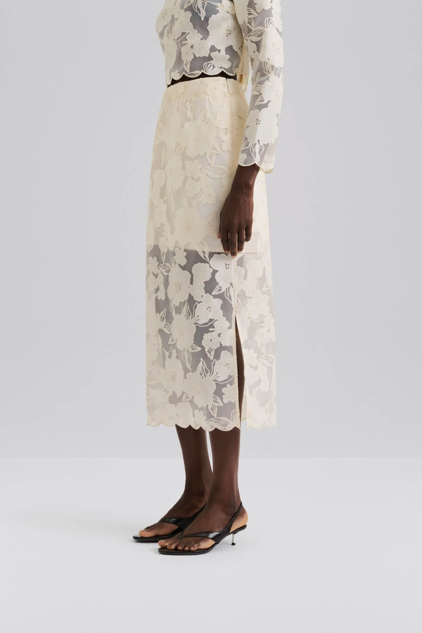 En romantisk midikjol i skir, blommig spets som rör sig elegant med varje steg. Den vågiga fållen och den diskreta slitsen i sidan skapar en feminin silhuett, perfekt för både sommarens fester och eleganta middagar. Bär med en enkel topp eller sidenblus för en tidlöst chic look.