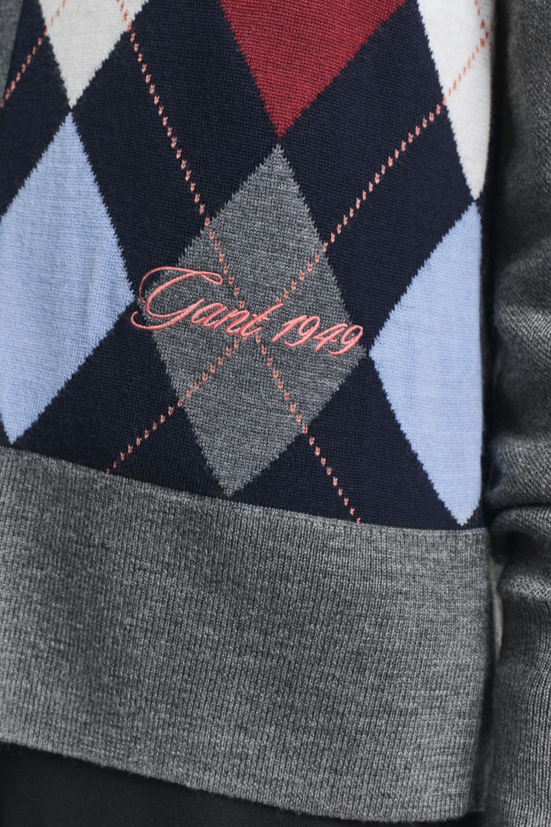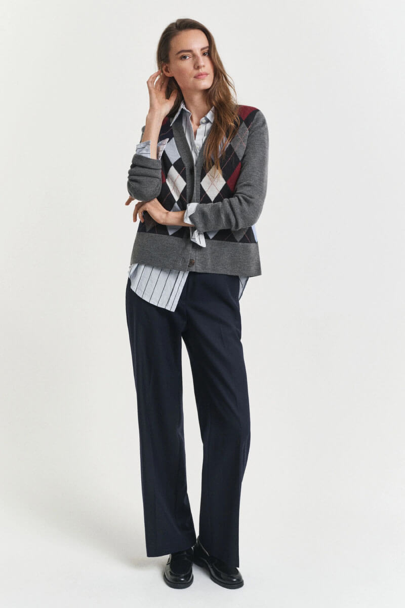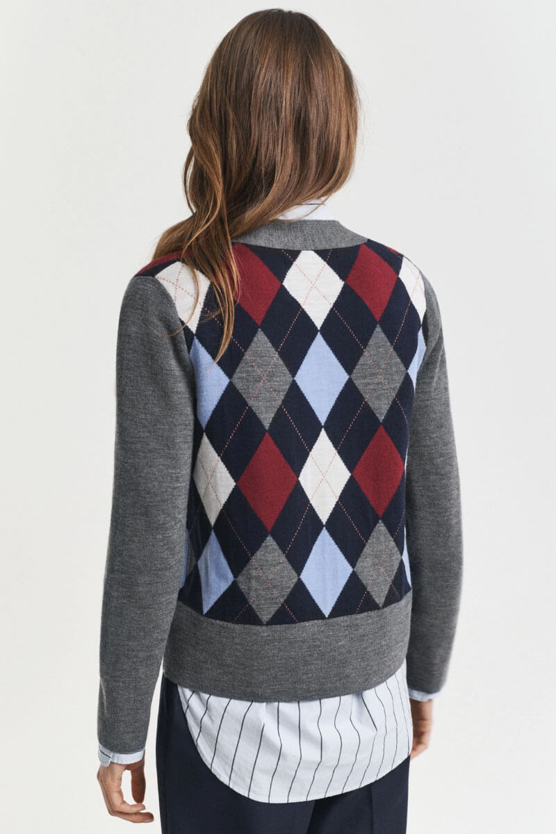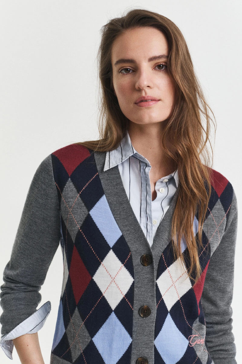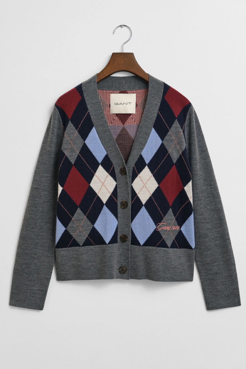Grå kofta med stilrent argylemönster i marin, vinrött och ljusblått. Bär den knäppt till vida kostymbyxor för en sofistikerad vardagslook, eller öppen över sidenblus och jeans för en avslappnad men elegant look med preppy twist.Argylemönstrad kofta i merinoull med v-ringning, rak passform, ribbstickade kanter och stängs med knappar fram från Gant.