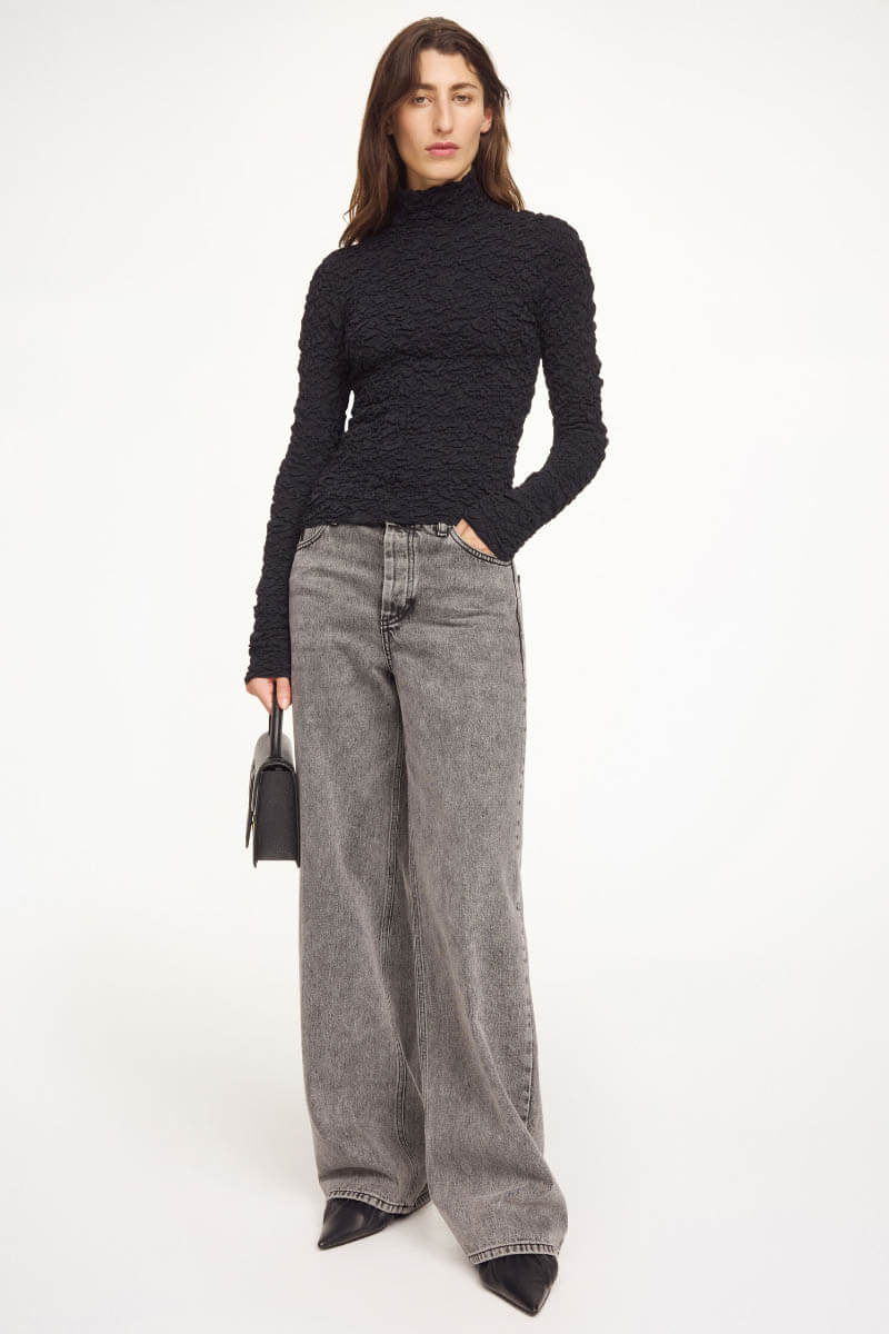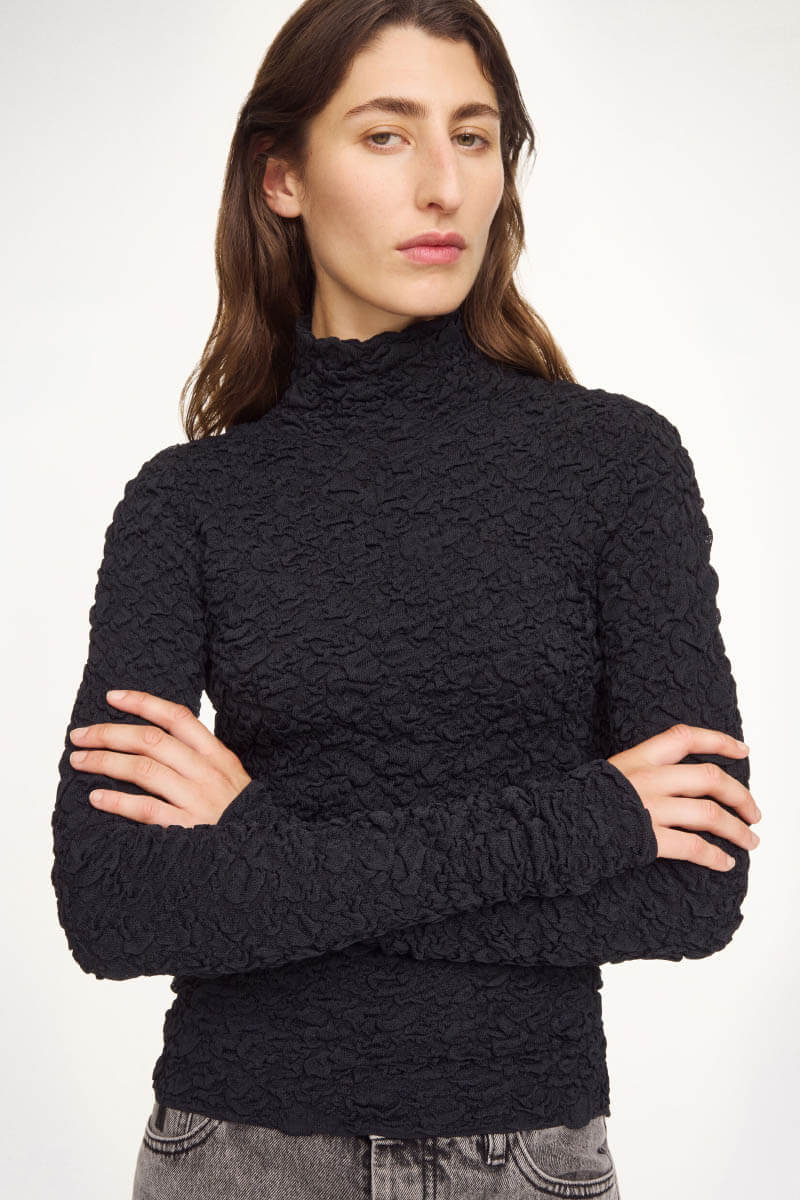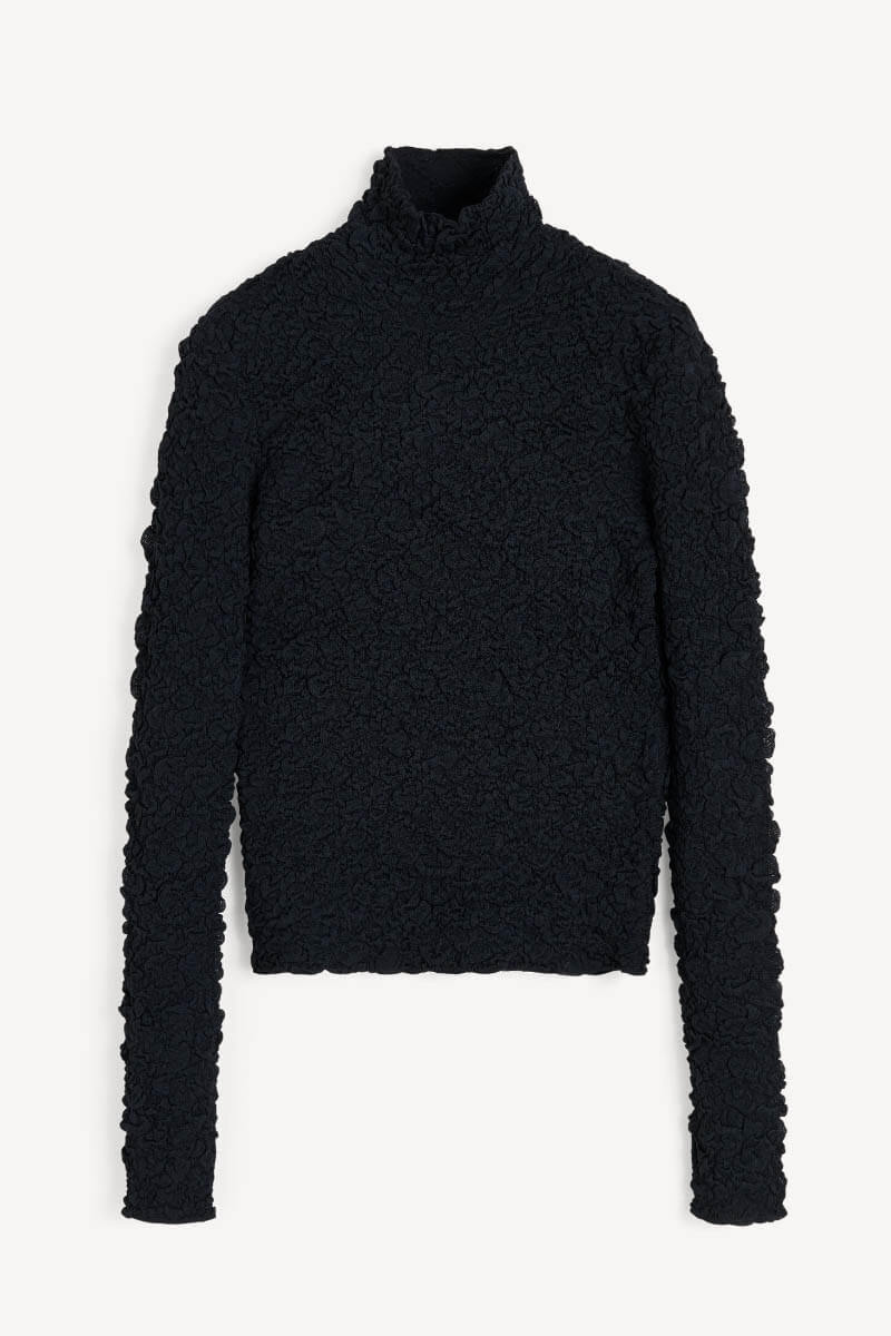 En mångsidig topp som enkelt smälter in i din befintliga garderob. Blusen kan stylas både för kontoret och kvällens middagar. Den är tillverkad i ett stretchigt, taktilt material och har en smickrande silhuett med polokrage och förlängda ärmar. Den semitransparenta strukturen ger en elegant men modern känsla.