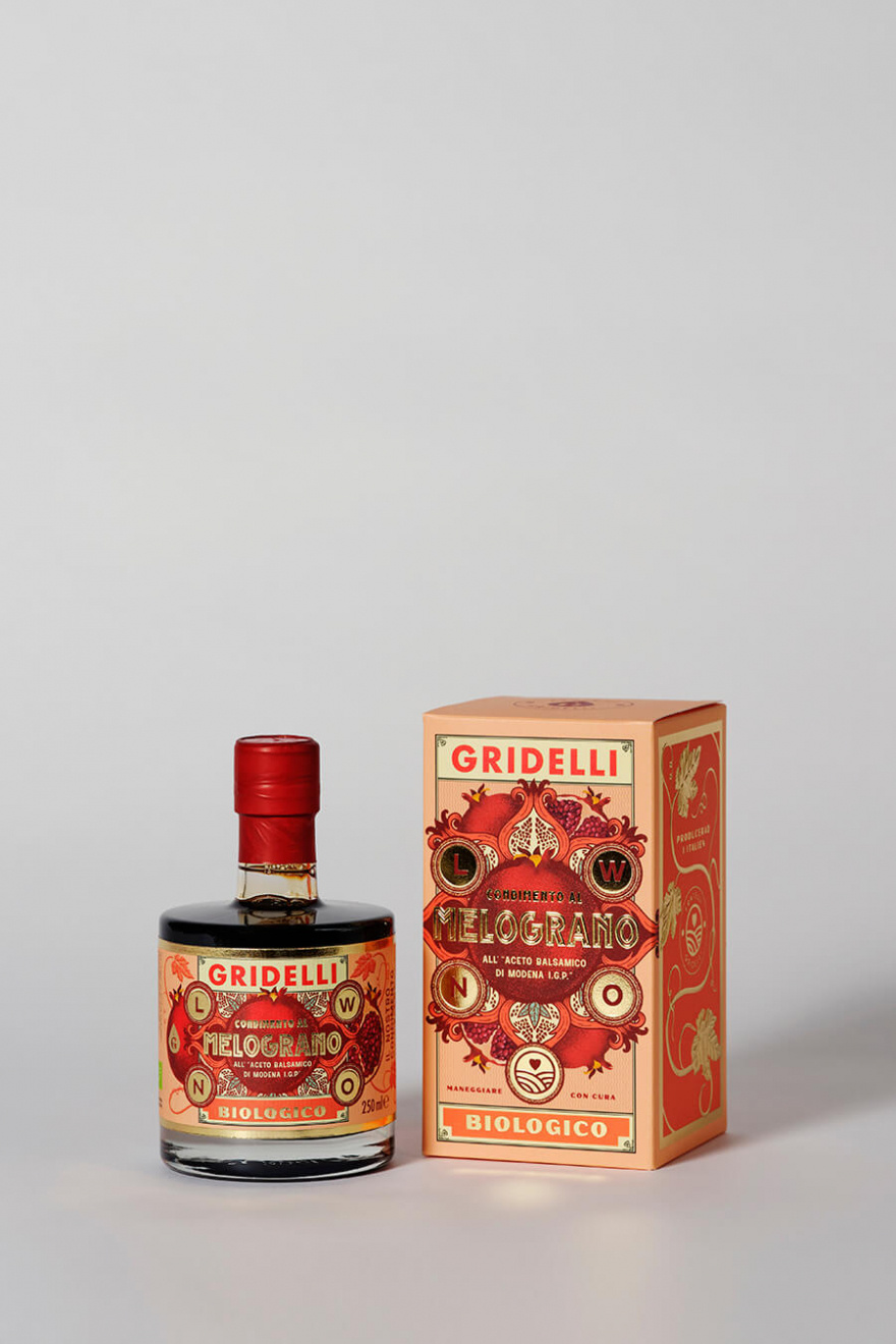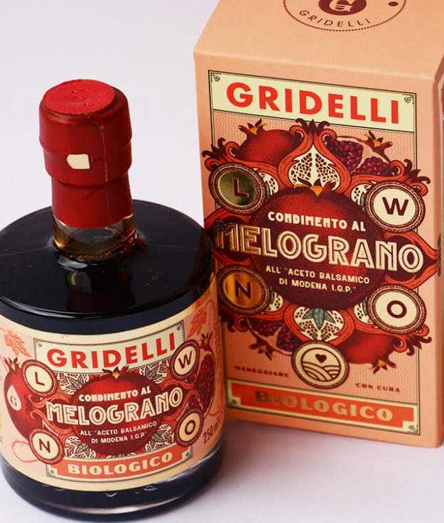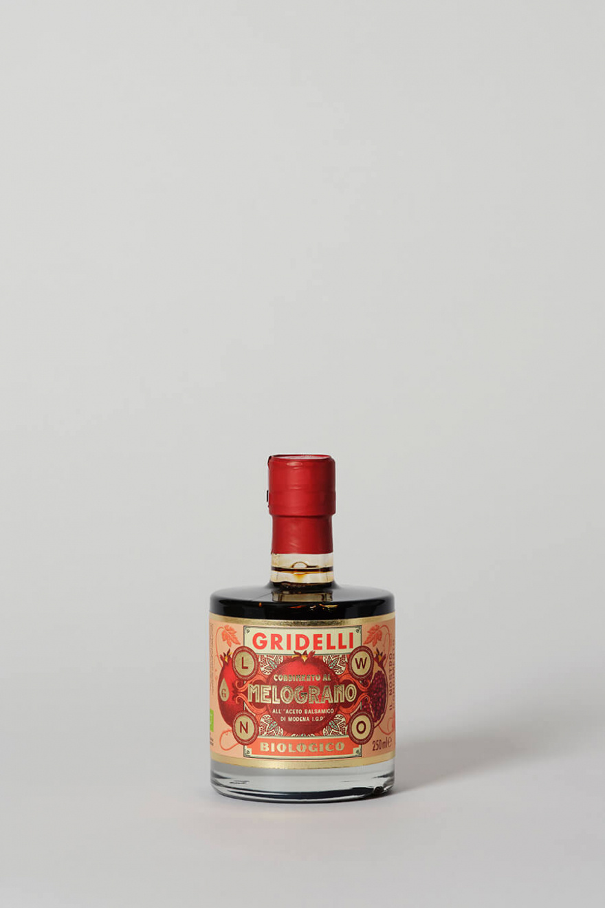 Otroligt god ekologisk balsamico som är gjord med granatäpple och helt utan färgämnen eller övriga tillsatser från Gridelli.Inte nog med att alla Gridellis produkter har en vacker design som gör den till en fin inredningsdetalj i köket så är dom även av högsta kvalitet. Ringla denna mumsiga balsamico över salladen, till ostbrickan, desserter, frukt eller till drinkar.