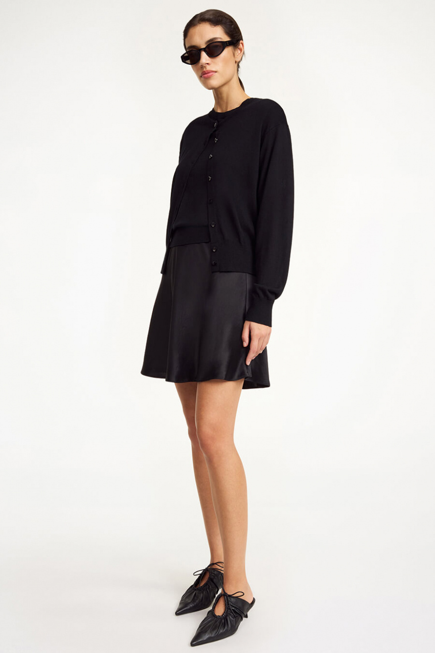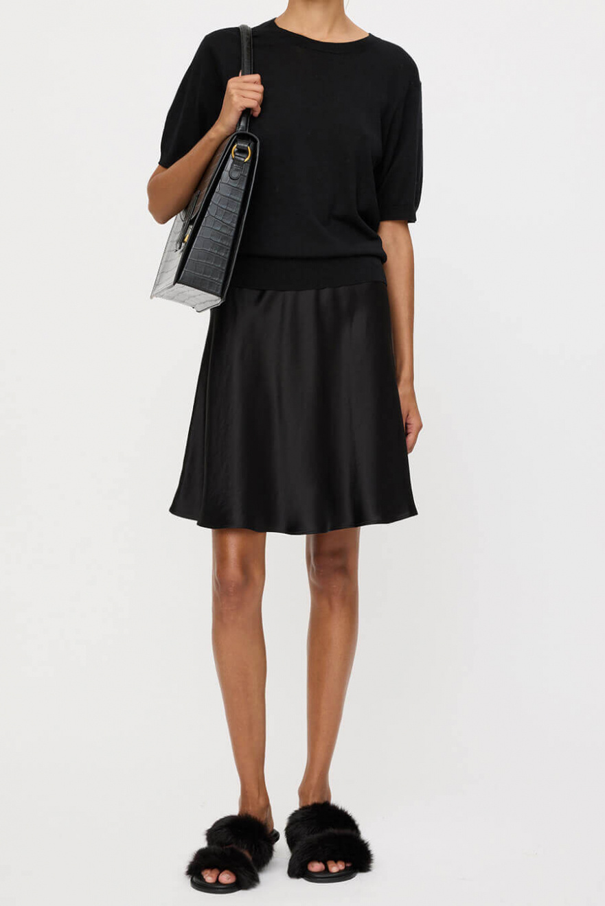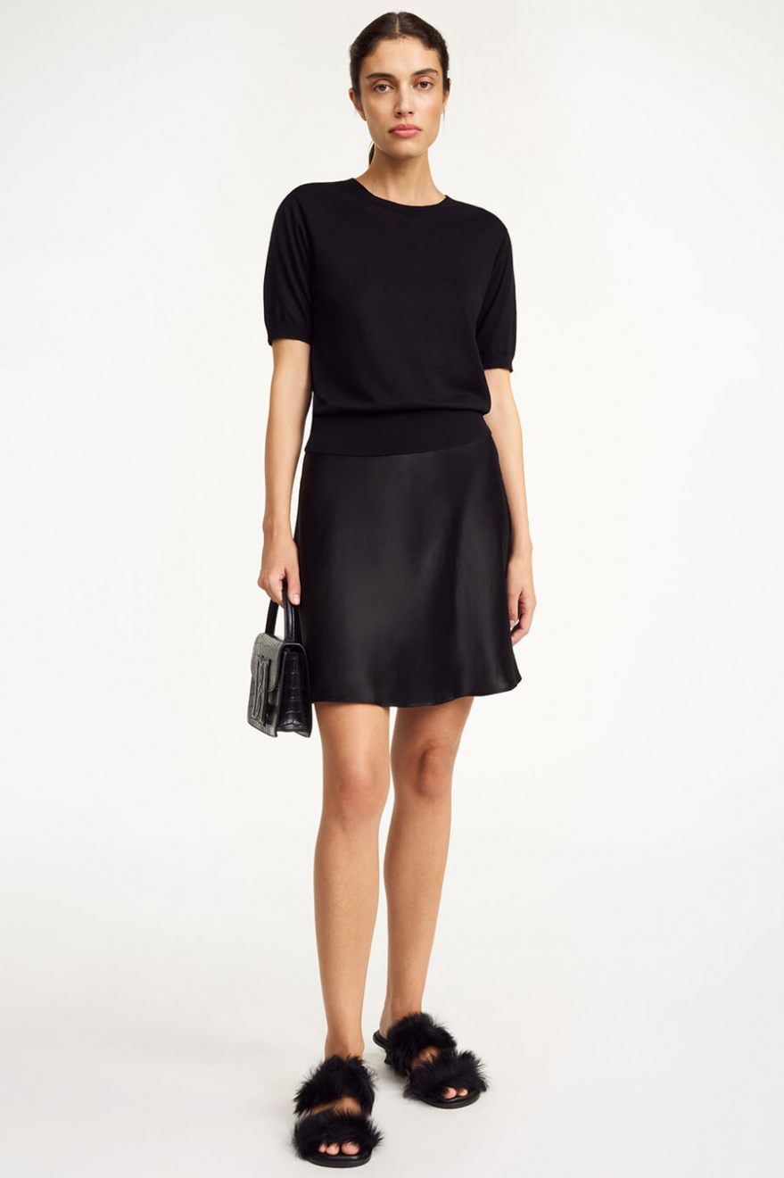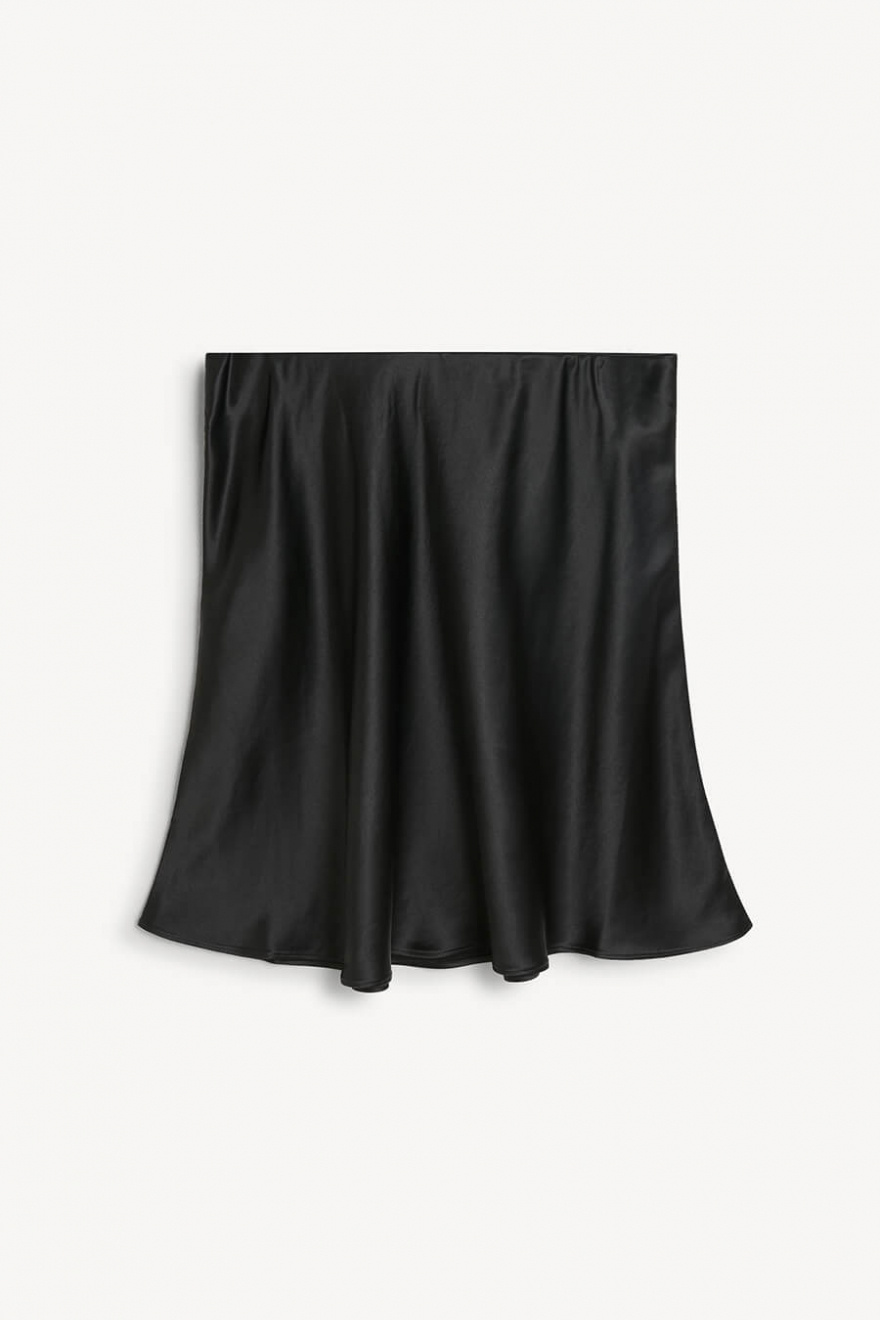 Den svarta korta satinkjolen är allt du behöver för en look som andas både elegans och edge. Med sin glänsande finish och smickrande silhuett funkar den lika bra till stickat på dagen som med klackar på kvällen. Ett måste i garderoben!Skimrande mini kjol med gömd elastisk midjeband, normal passform och A-formad från By Malene Birger.
