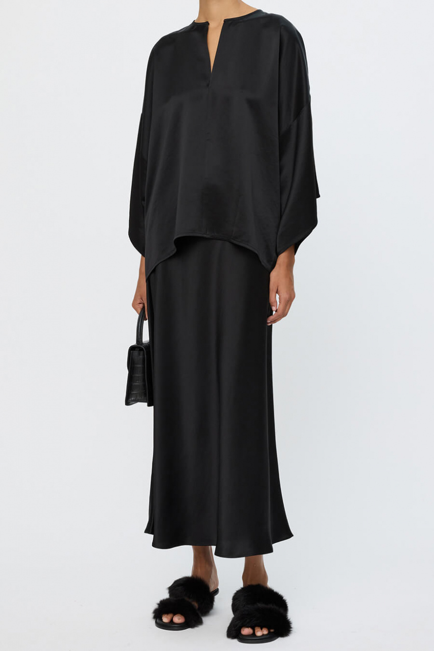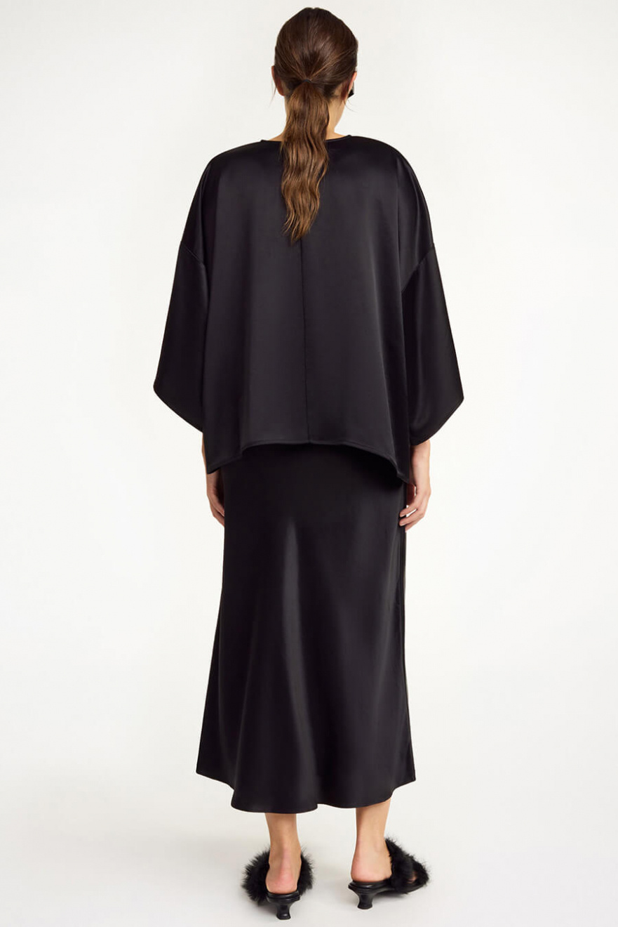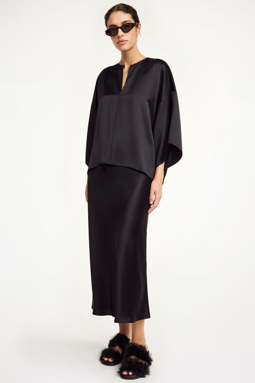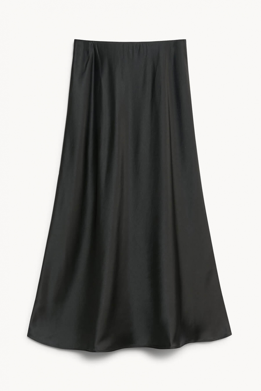 Den svarta satinkjolen är definitionen av tidlös elegans. Lika snygg till vardag som till fest – bara byt sneakers mot klackar! Den skimrande satinfinishen och smickrande passformen gör den till en nyckelplagg i varje garderob.Skimrande midi kjol med gömd elastisk midjeband, normal passform och A-formad från By Malene Birger.