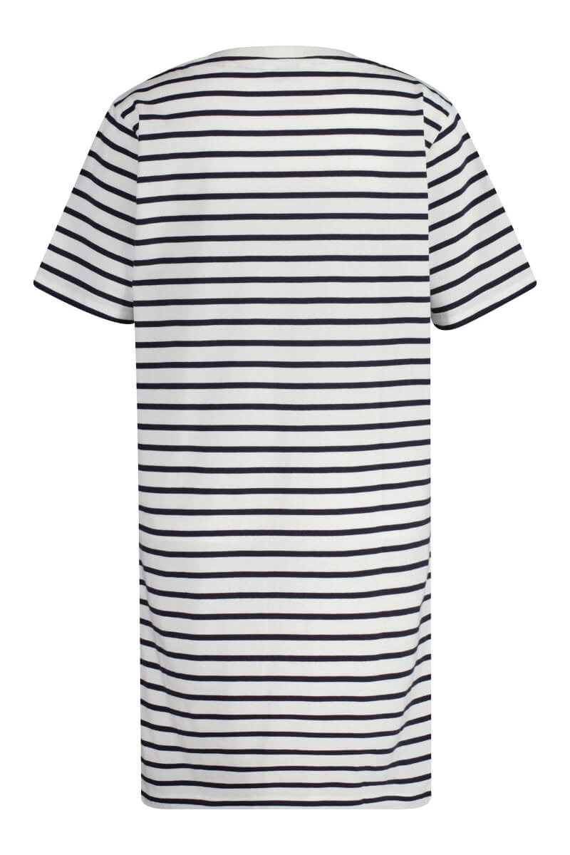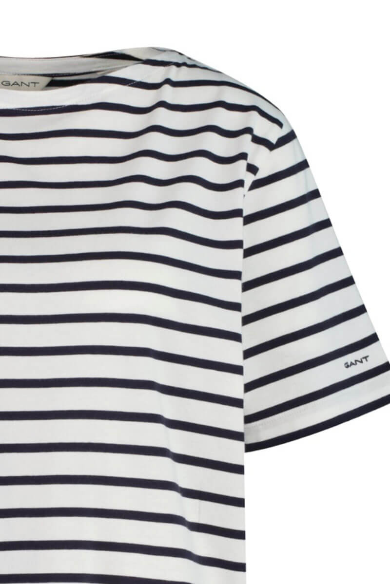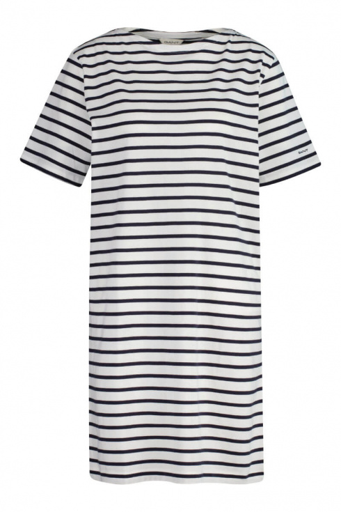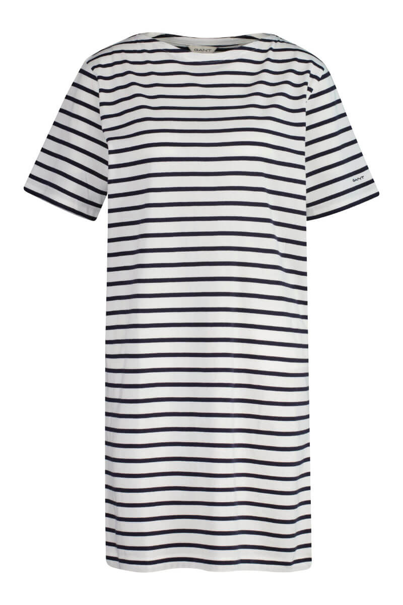 En klänning som andas semester i varje söm. Den avslappnade silhuetten och det diskreta mönstret gör den till ett självklart val för allt från morgonkaffe till middagar i skymningen. Stil möter enkelhet.Randig klänning i bomull med båtringning, avslappnad passform, korta ärmar med borderad logga från Gant.