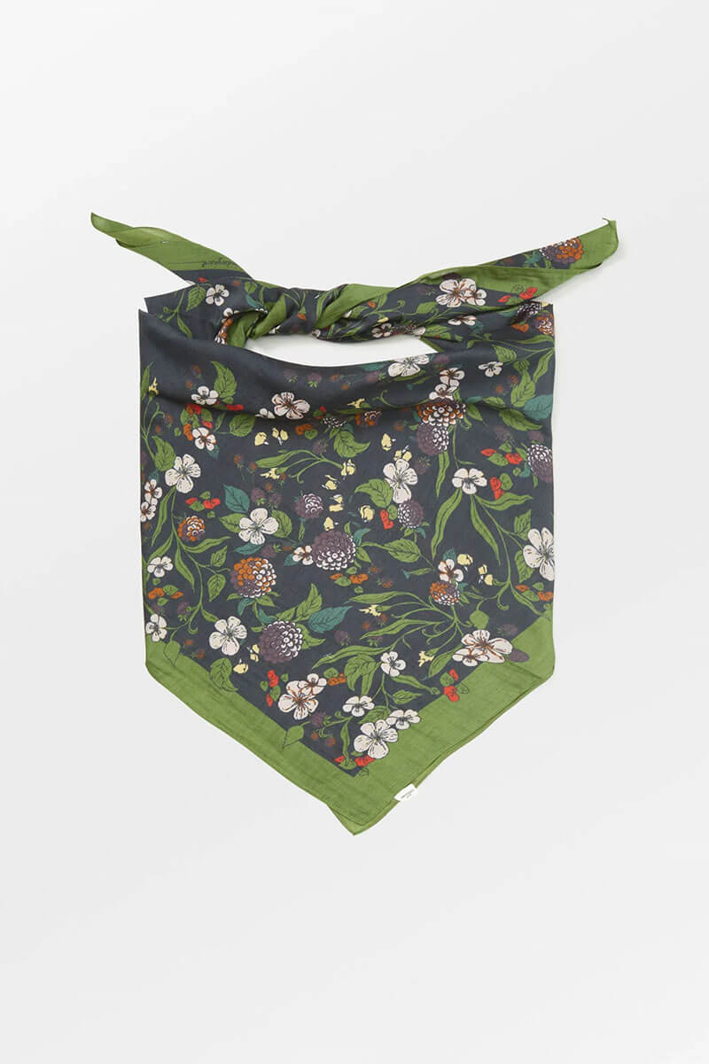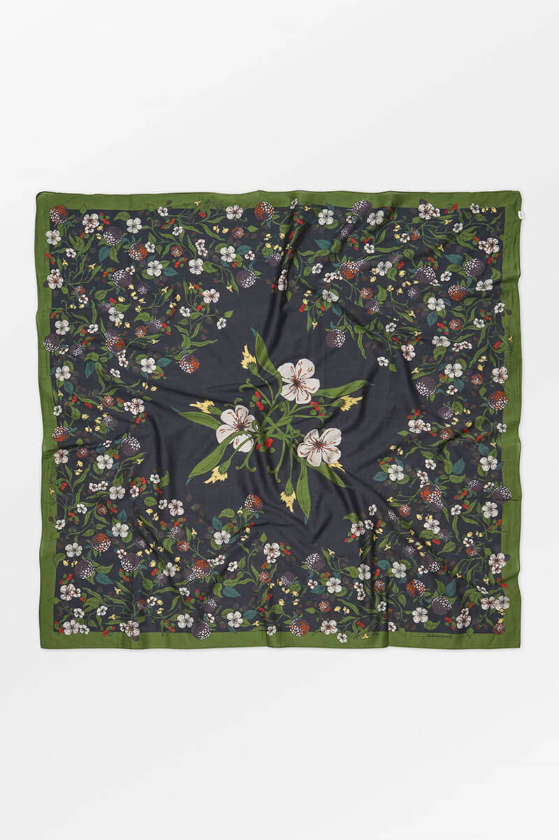 En charmig scarf i mjuk mix av bomull och silke (80 % bomull, 20 % silke). Den livfulla designen med blommor, bär och randiga kanter ger en sofistikerad detalj till vilken outfit som helst. Perfekt att bära runt halsen eller elegant drapera över axlarna – lika fin till vardags som till fest.