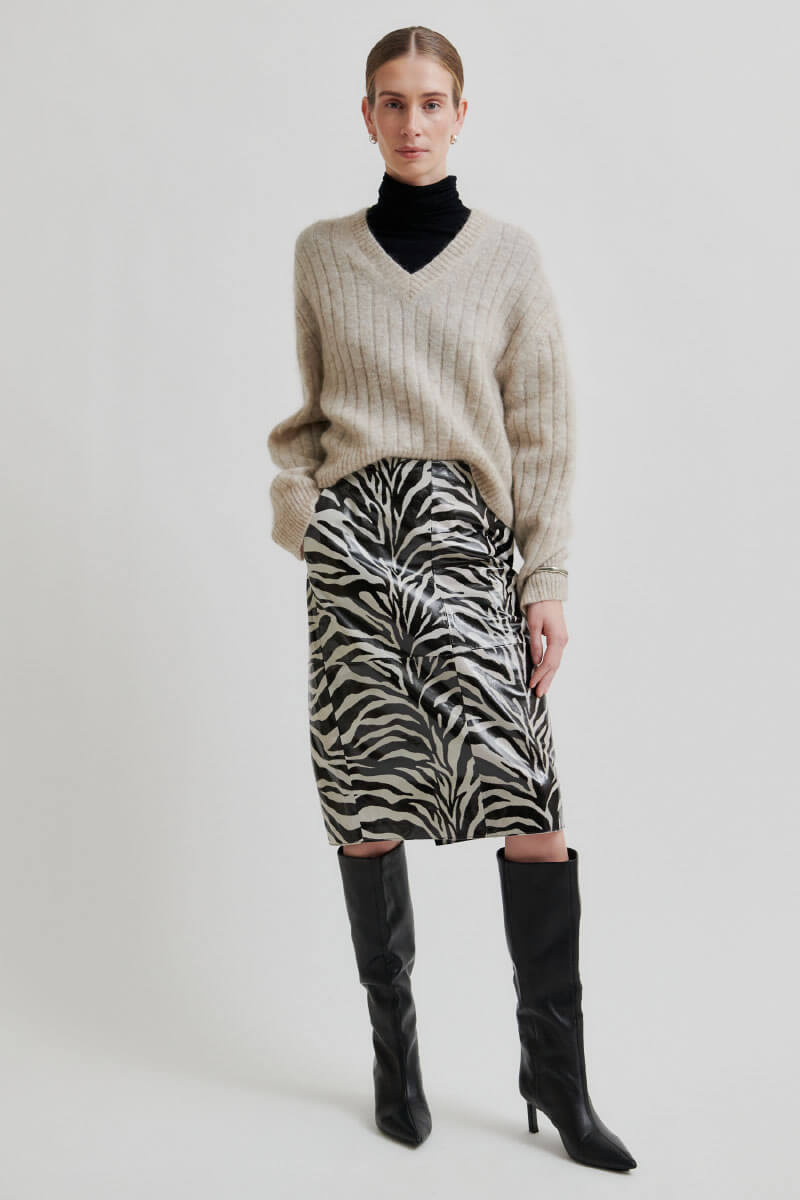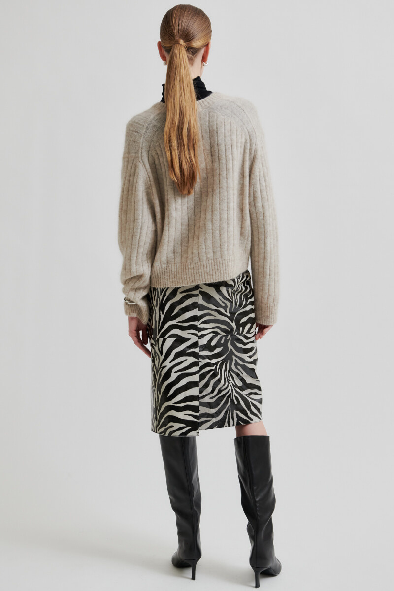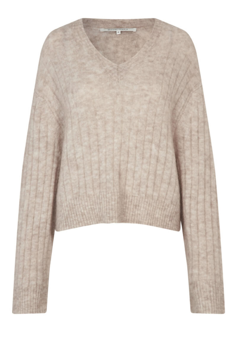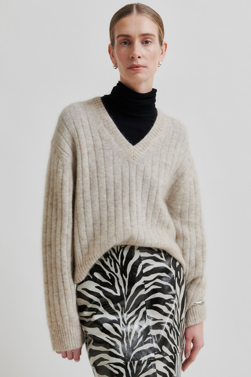 Beige ribbstickad tröja i lös passform – en tidlös bas i neutral färg. Styla med raka kostymbyxor och ballerinas för en avslappnad men skräddad silhuett. Elegant stickat möter vardagschic höststil.Ribbstickad tröja i en fluffig mohairblandning med v-ringning, lös passform, fallande axelsömmar och ribbstickade muddar från Second Female.