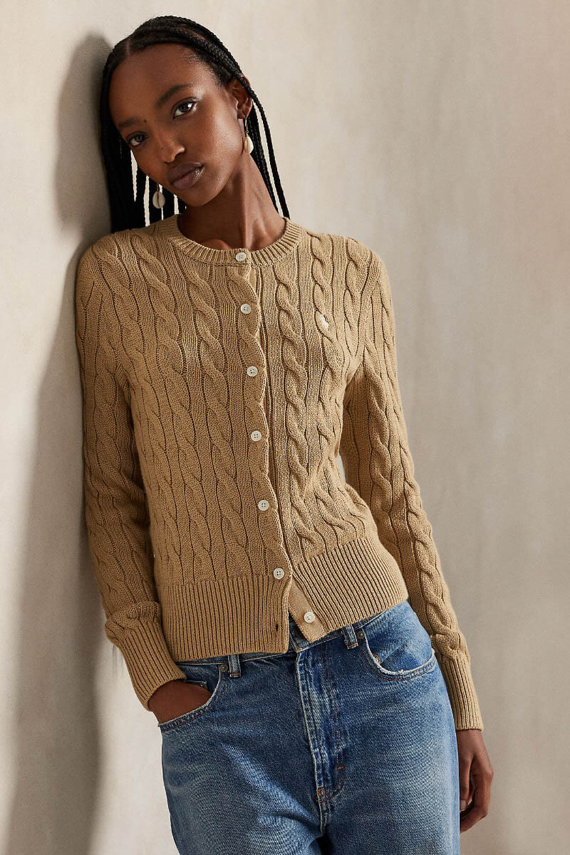 Den perfekta kabelstickade koftan i mjuk bomull – tidlös, lätt och lika självklar över en silkig klänning som till jeans. Smickrande passform, klassisk rund hals och fina detaljer. En klassiker du kommer bära om och om igen.Kabelstickad kofta i mjuk bomull med rund halsringning, stängs med knappar fram, ribbstickade kanter, smal passform och liten broderad logga fram från Polo Ralph Lauren.