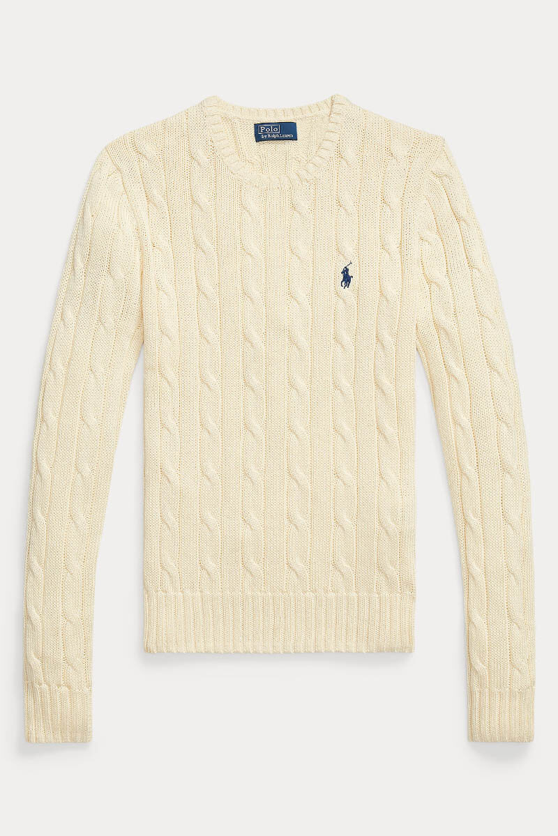 En kabelstickad tröja i mjuk bomull är definitionen av lyx. Bär den över en vit skjorta med raka jeans och loafers, eller kombinera med sidenkjol och kappa för en look som är både avslappnad och sofistikerat elegant.Kabelstickad topp i bomull med smal passform, rund halsringning, broderad logga fram och ribbstickade kanter från Polo Ralph Lauren.