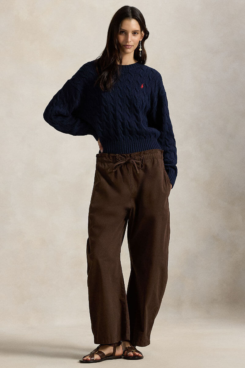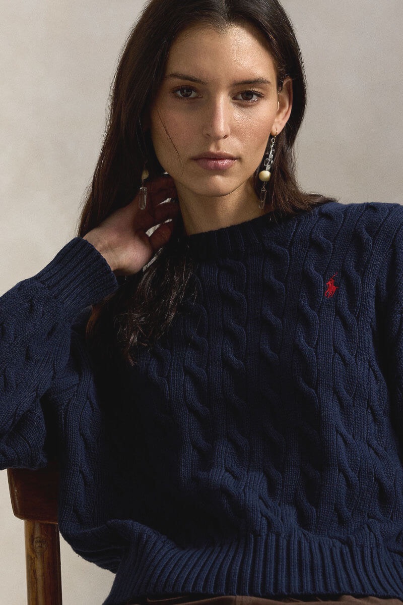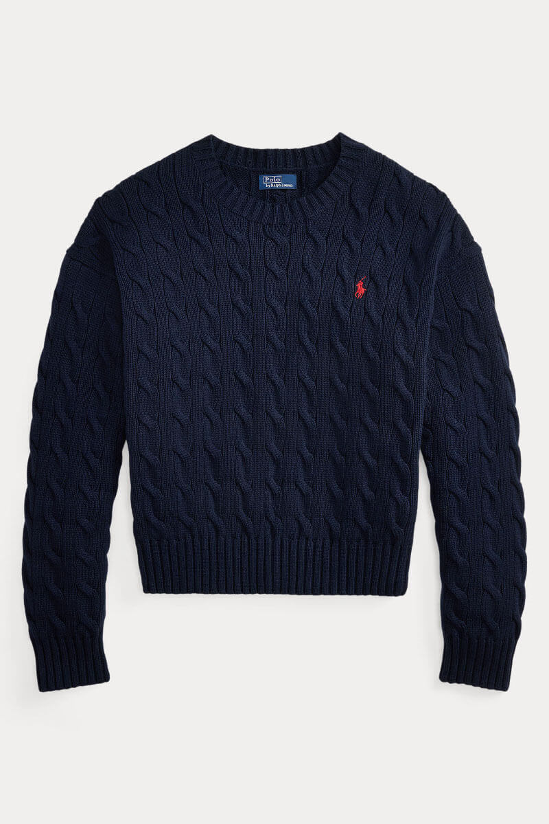 Cable-knit cotton crewneck sweater, Hunter navy