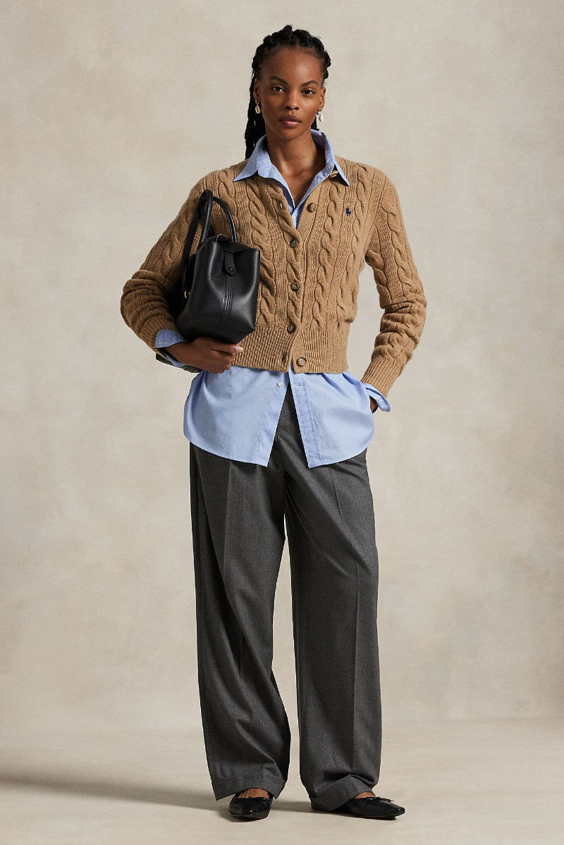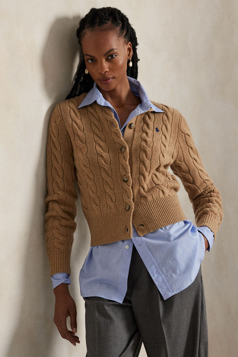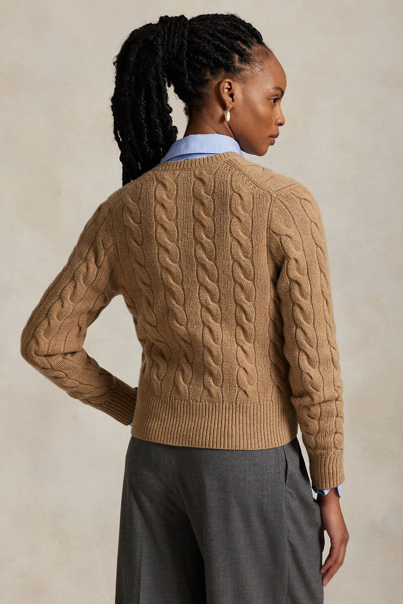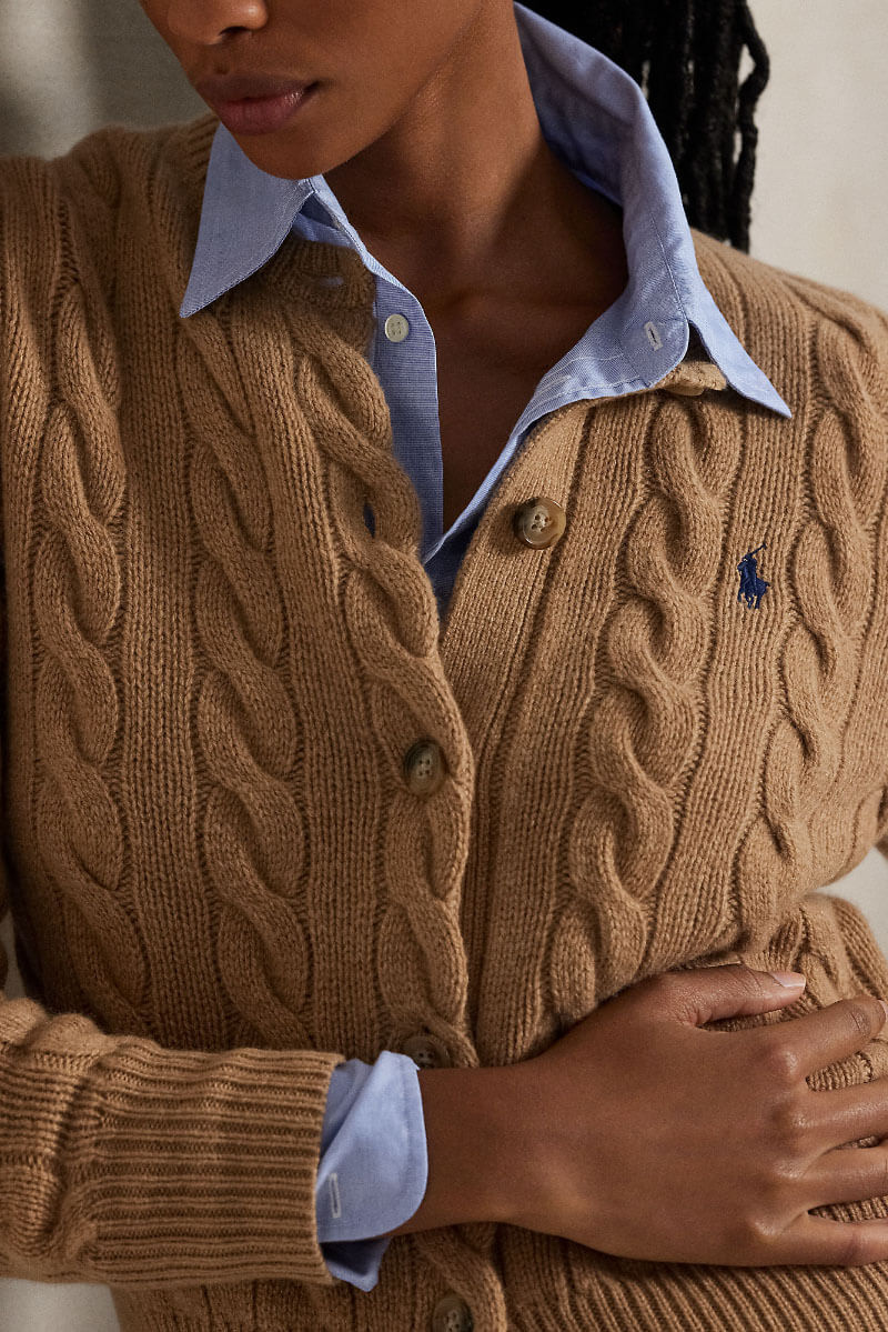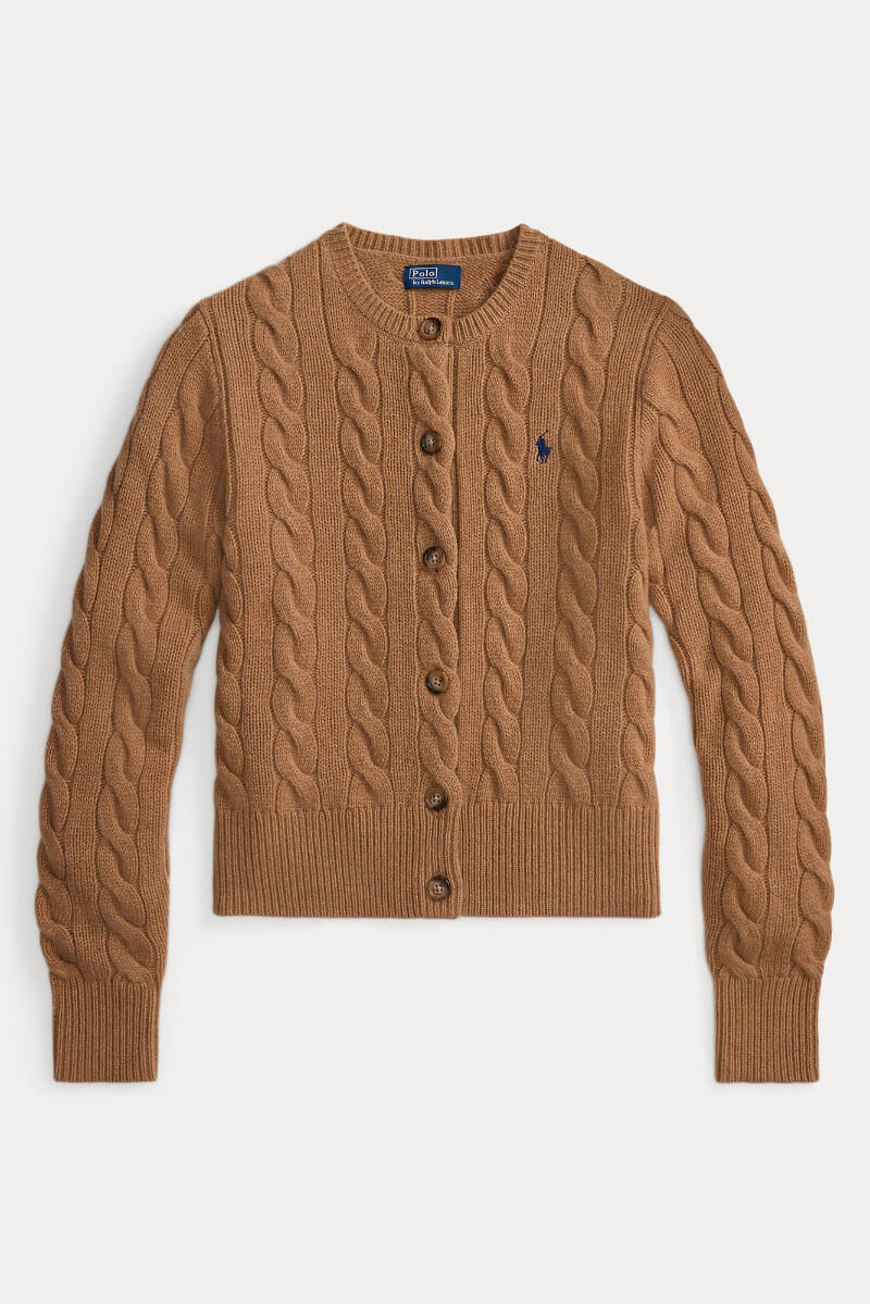 Brun stickad kofta med v-ringning och generös passform som ger ett mjukt intryck utan att kännas slätstruken. Styla med svart ribbat linne, silvriga örhängen och dressade byxor för en look som andas varm minimalism.Kabelstickad kofta i en ull- och kashmirblandning med rund halsringning, smal passform, ribbstickade kanter, stängs med knappar fram och en broderad logga fram från Polo Ralph Lauren.