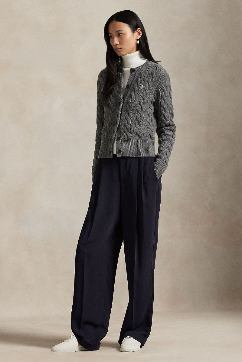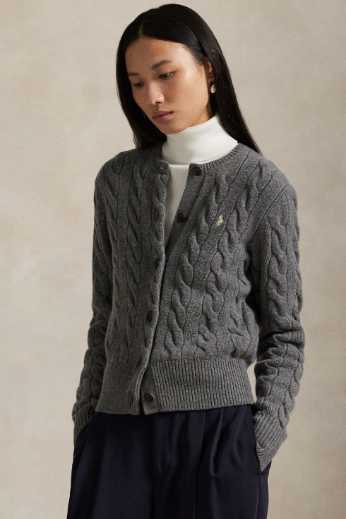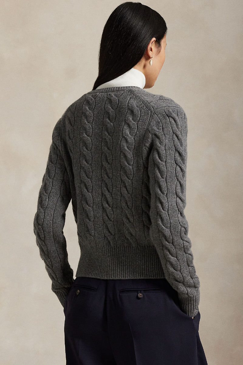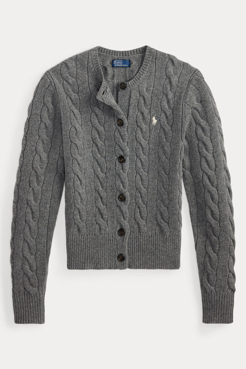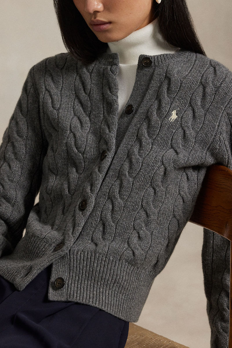 Grå kabelstickad kofta i ull och kashmir – en stilren investering. Bär öppen över vit t-shirt och raka jeans, addera smycken och sneakers. Den mjuka texturen ger kontrast till skarpa snitt och sätter en avslappnat elegant ton.Kabelstickad kofta i en ull- och kashmirblandning med rund halsringning, smal passform, ribbstickade kanter, stängs med knappar fram och en broderad logga fram från Polo Ralph Lauren.