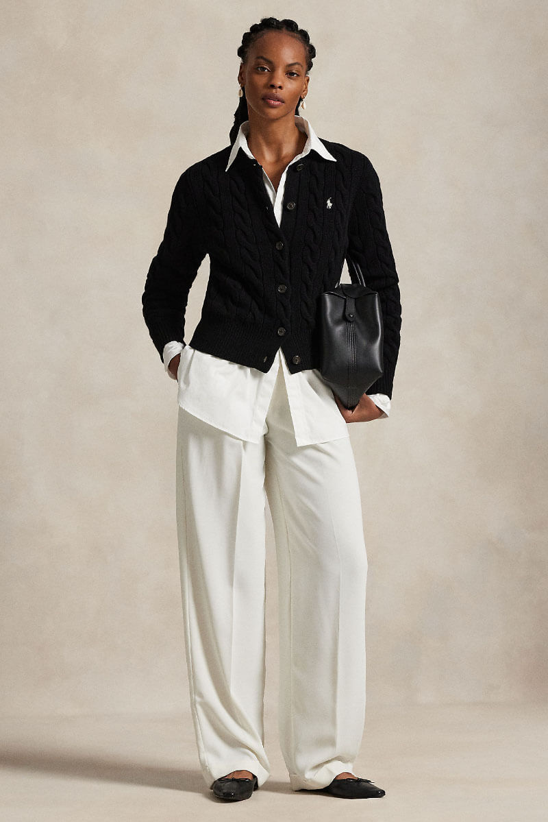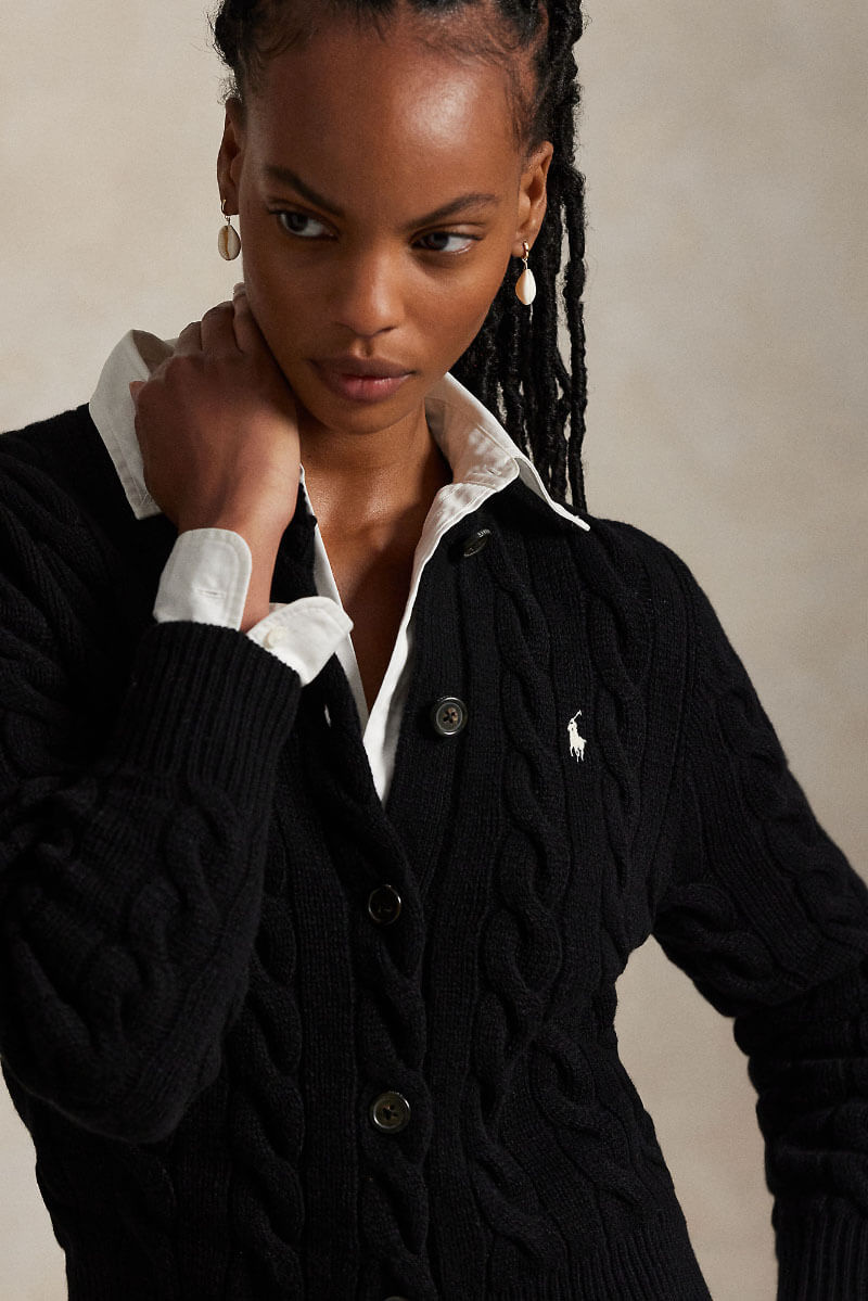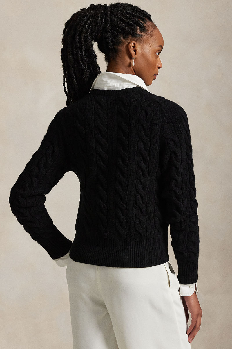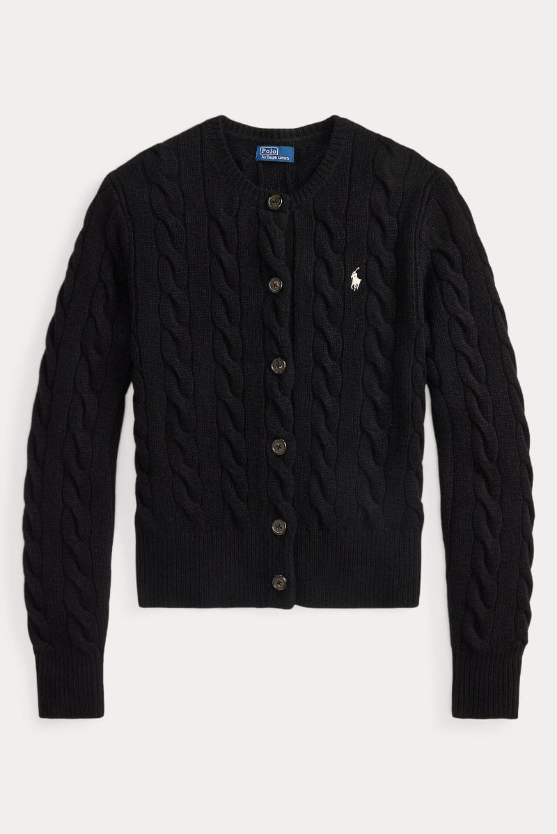 Svart kabelstickad kofta i ull och kashmir – en stilren investering. Bär öppen över vit t-shirt och raka jeans, addera smycken och boots. Den mjuka texturen ger kontrast till skarpa snitt och sätter en avslappnat elegant ton.Kabelstickad kofta i en ull- och kashmirblandning med rund halsringning, smal passform, ribbstickade kanter, stängs med knappar fram och en broderad logga fram från Polo Ralph Lauren.