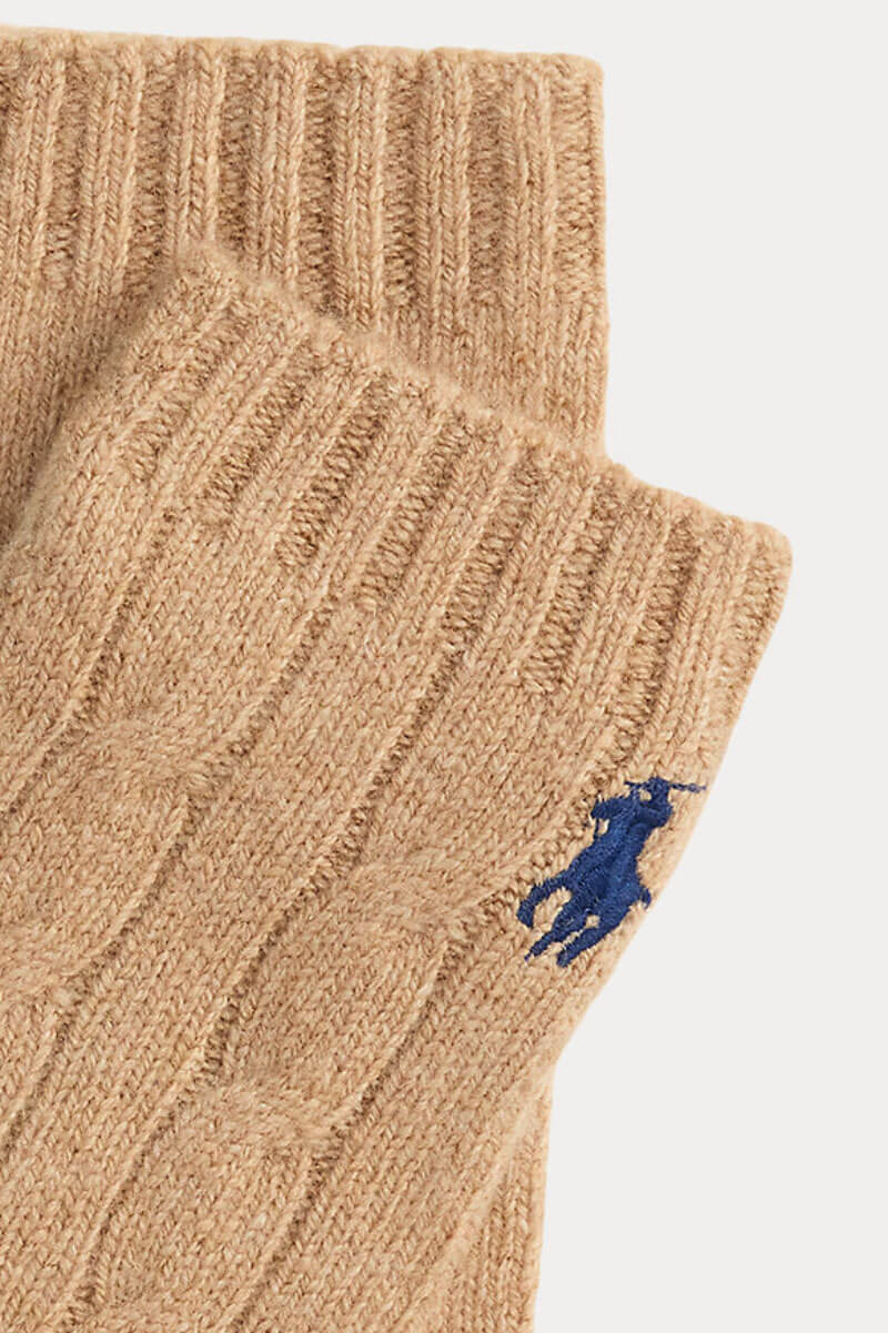 Kabelstickade vantar i mjuk kvalitet – bärs med matchande mössa och kappa i ull för en genomtänkt vinterlook. Klassisk men aldrig tråkig. De skulpterade stickade detaljerna lyfter varje ytterplagg med diskret elegans och varm funktion.Kabelstickade fingervantar i en mjuk ull- och kashmirblandning med uppvikt kant, broderad logga fram och ofodrad från Polo Ralph Lauren.