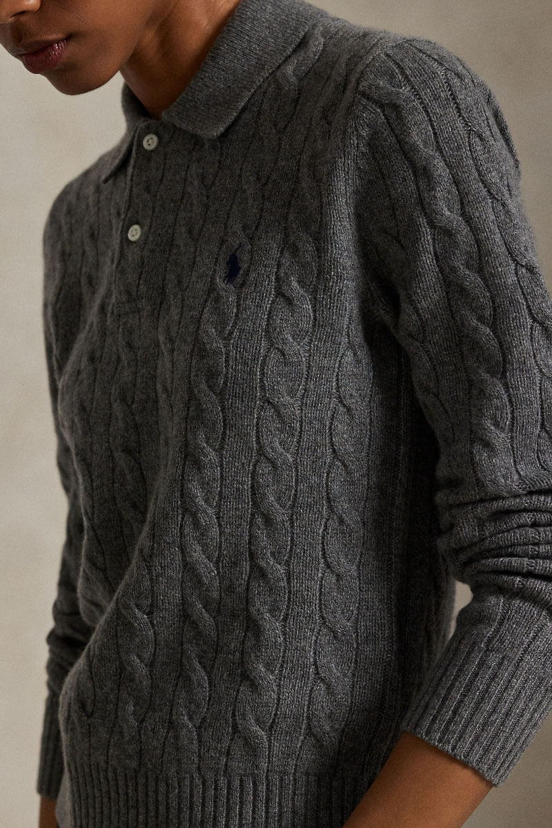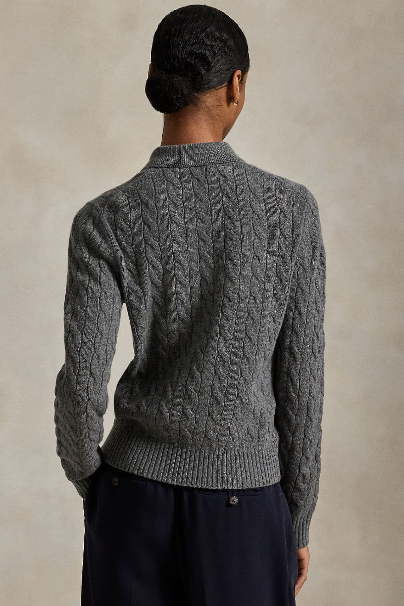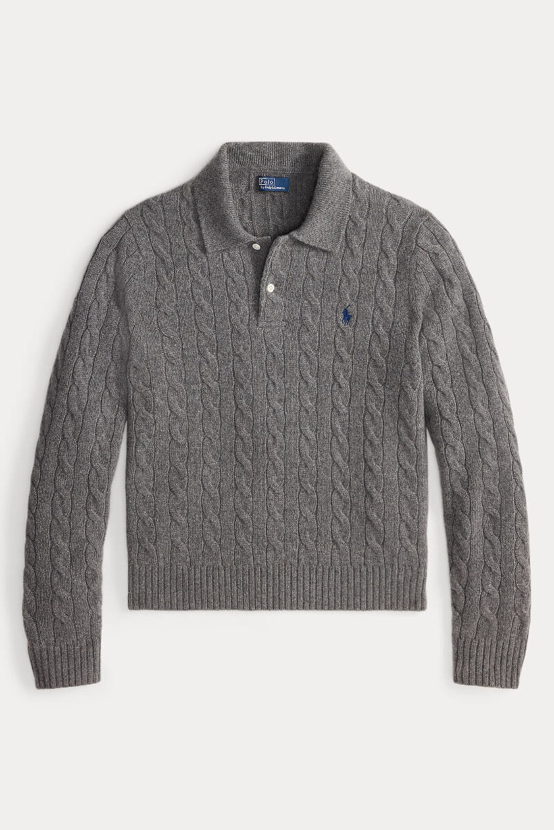 Den klassiska kabelstickningen med en tidlös polokrage och knappar möts i denna tröja, stickad i en mjuk blandning av ull och cashmere. De markerade kabelmönstren ger både struktur och elegans, medan den rena designen gör tröjan mångsidig och enkel att bära säsong efter säsong.