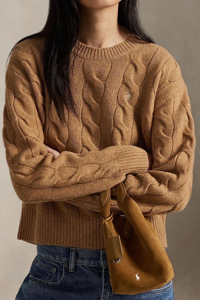 En modern klassiker i ny siluett. Denna stickade tröja har en kortare, cropped passform som ger ett trendigt uttryck och framhäver midjan – perfekt att bära till hög midja eller lager på lager. De större, tydliga kabelstickningarna ger en rustik men elegant känsla och adderar struktur och djup till din outfit.