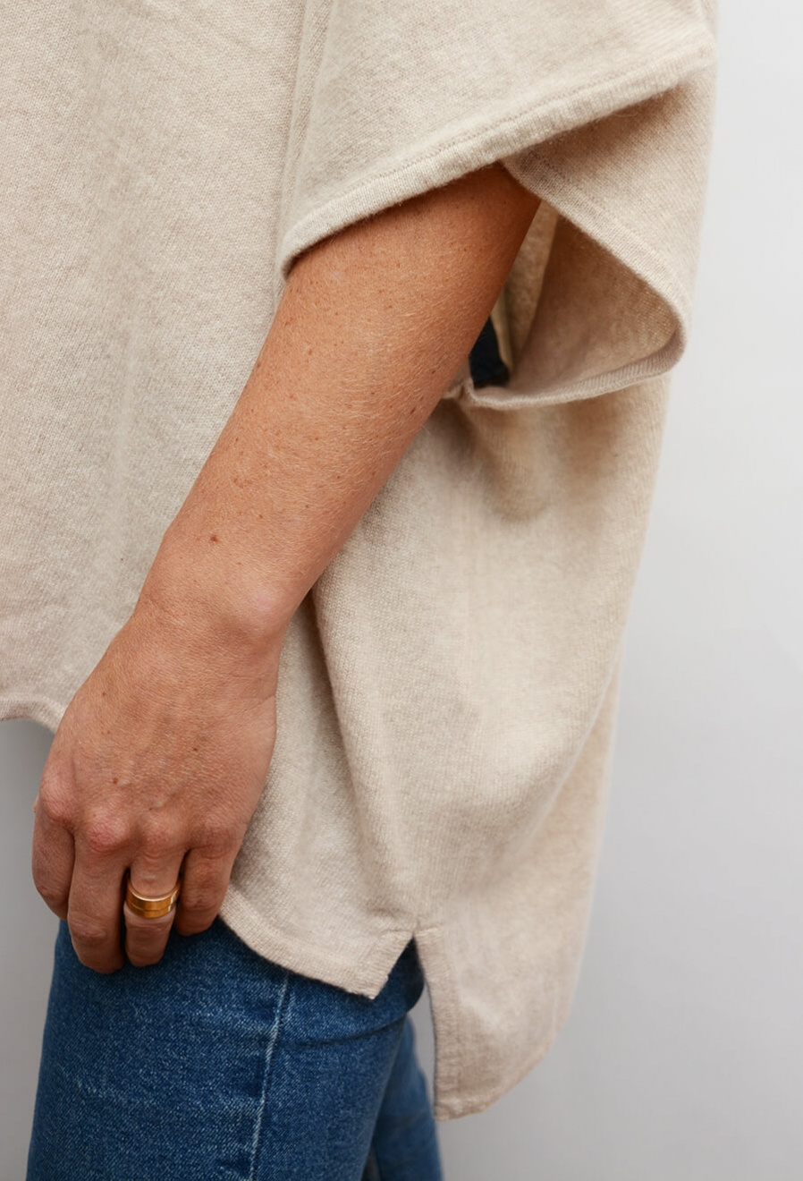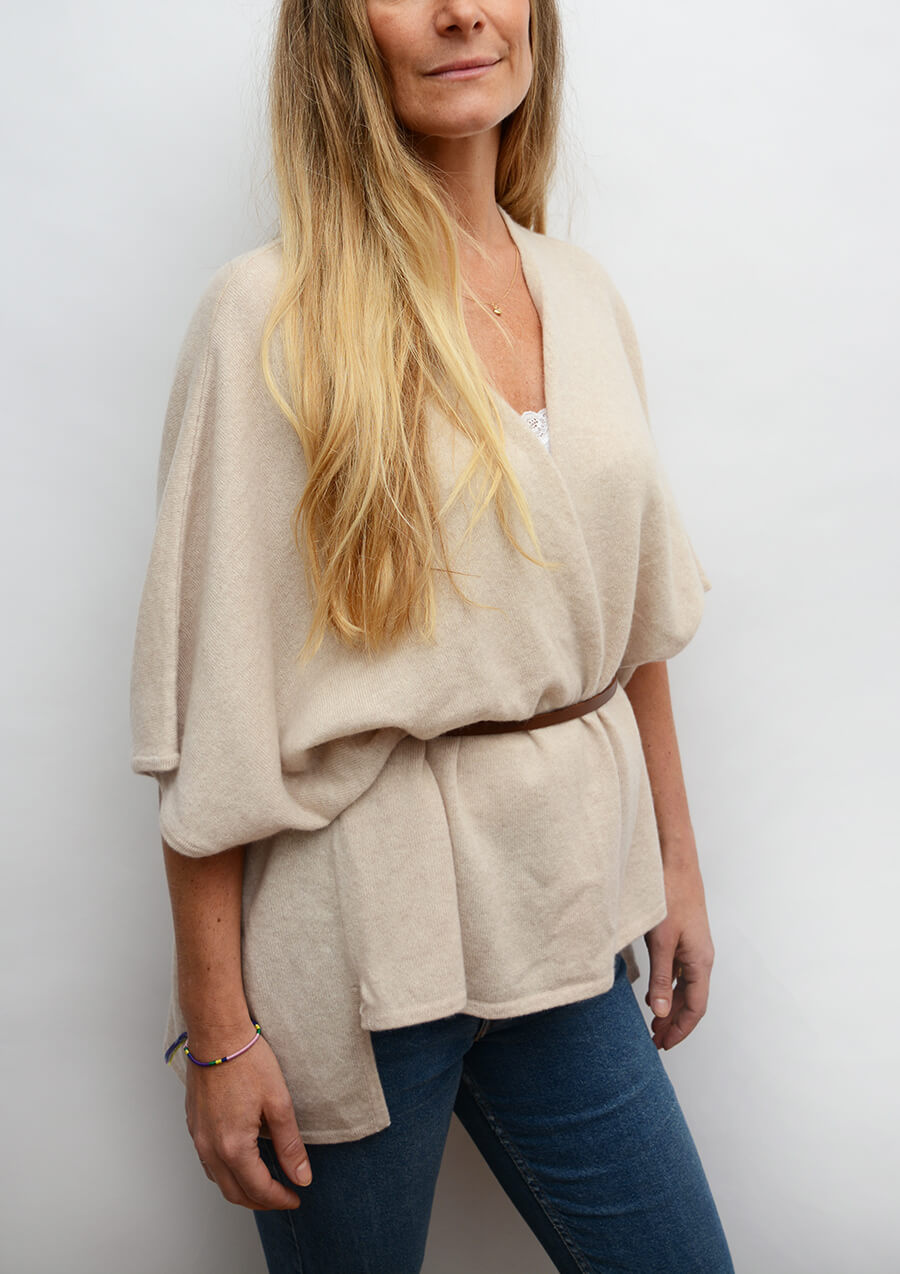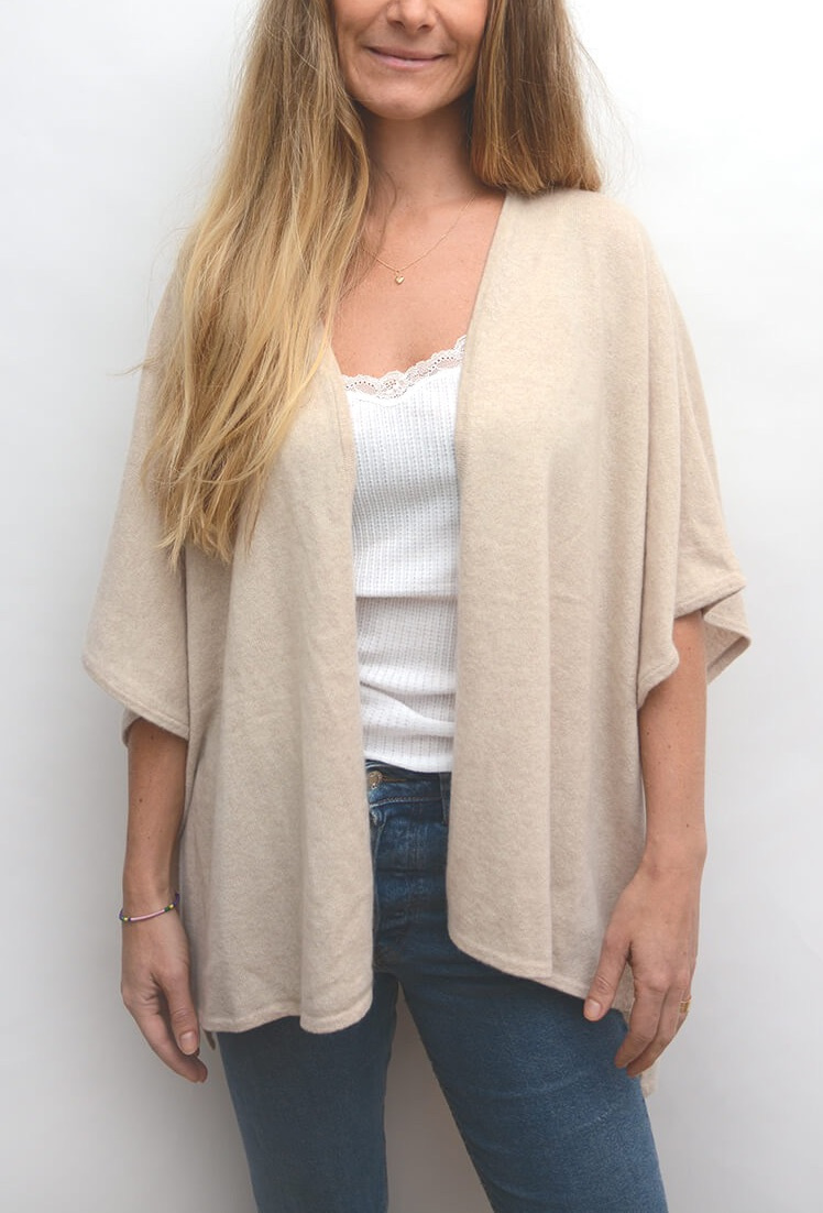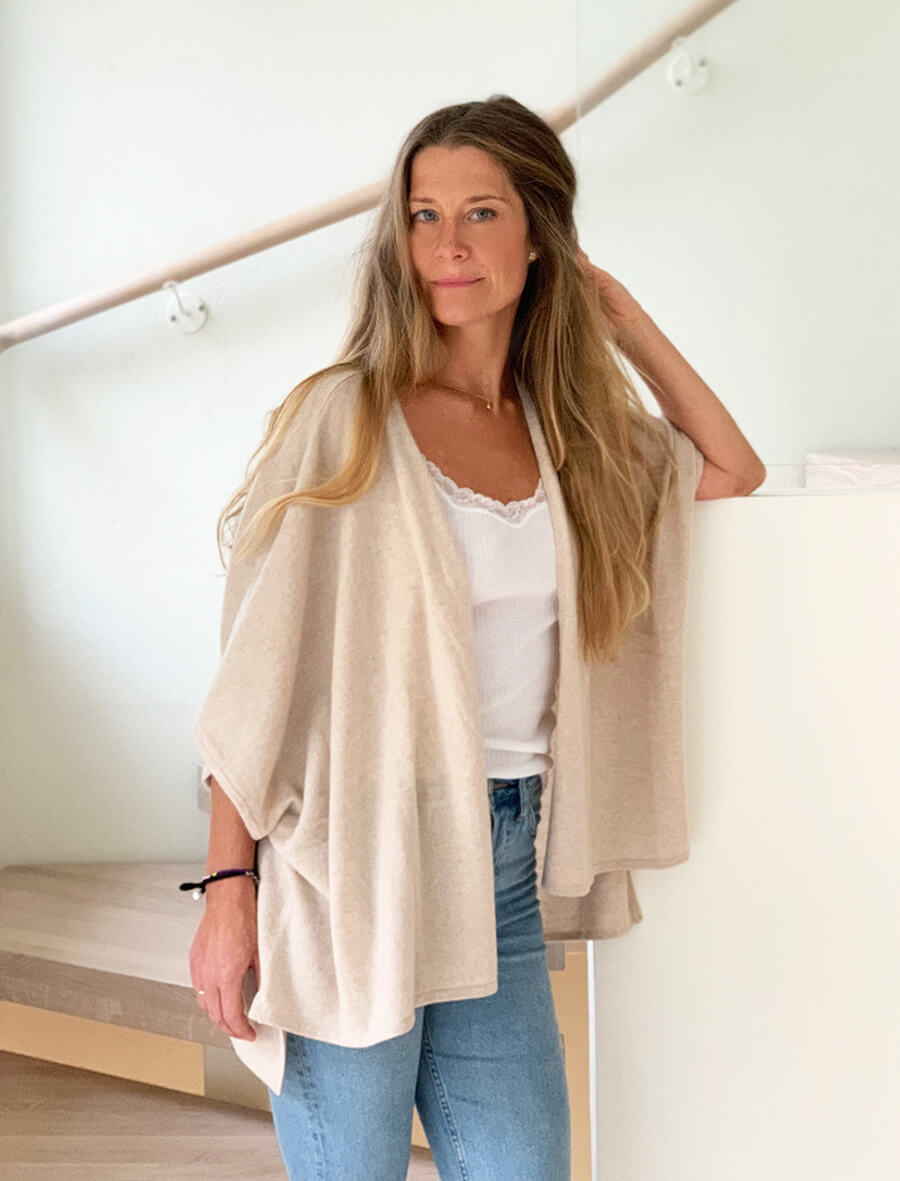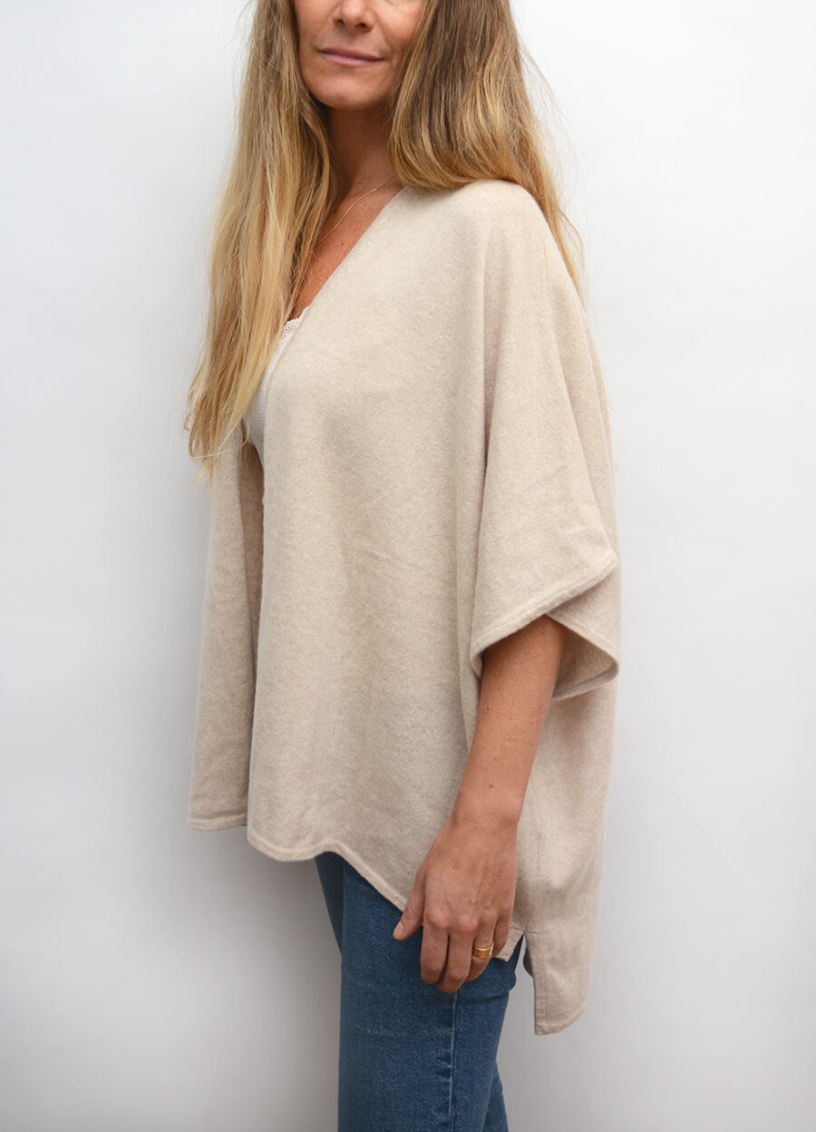 Ett plagg du bär som en kofta, poncho i lyxig cashmere. Öppen och längre bak.Rymd i plagget. Finns i storlek S/M eller M/L.