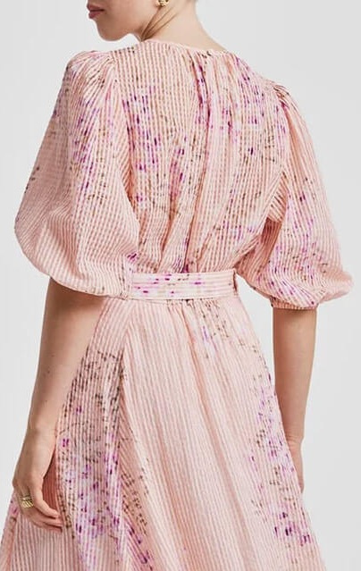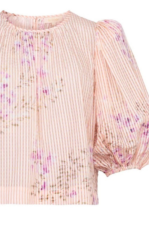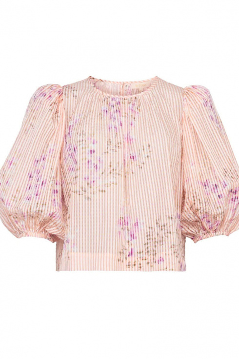 Toppen har en avslappnad passform med rund halsringning och armbågslånga ärmar med elastiska muddar, vilket ger en ledig men samtidigt feminin silhuett. I nacken finns en dekorativ nyckelhålsöppning som stängs med en knapp och tillför en elegant detalj.