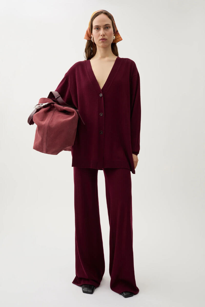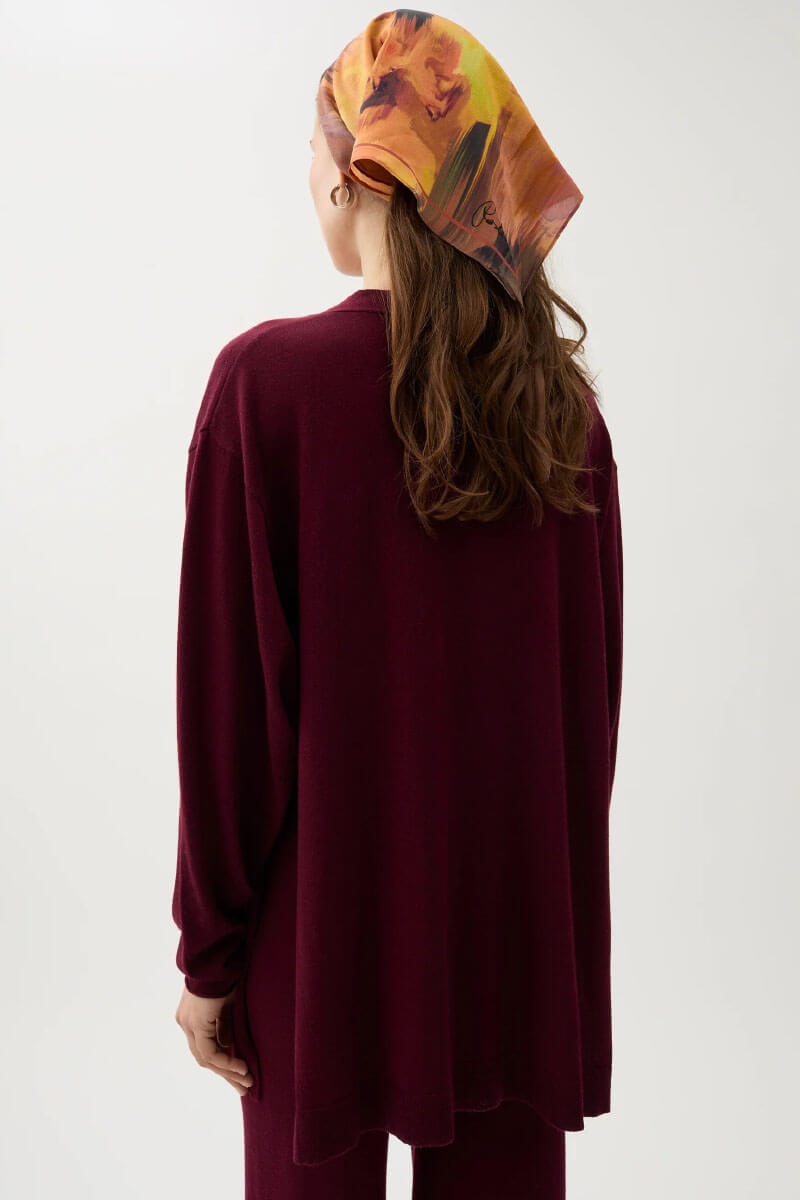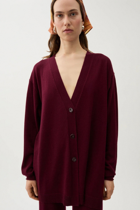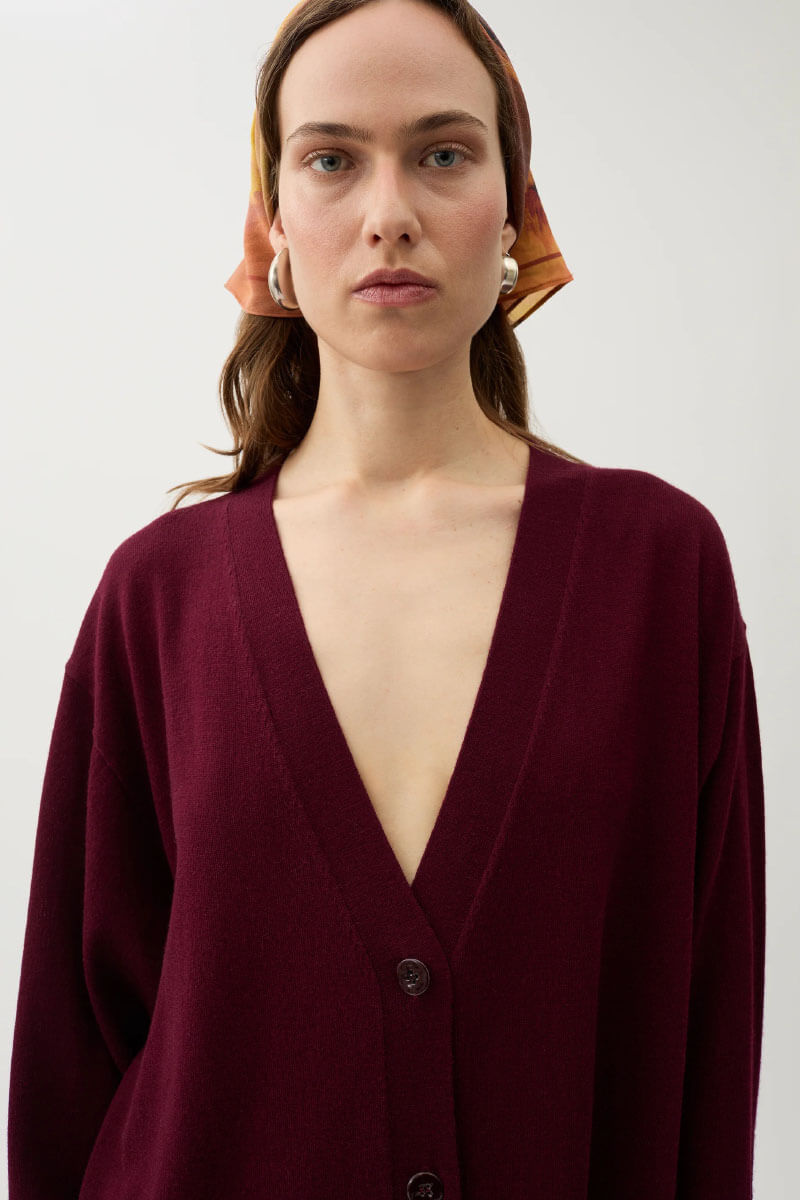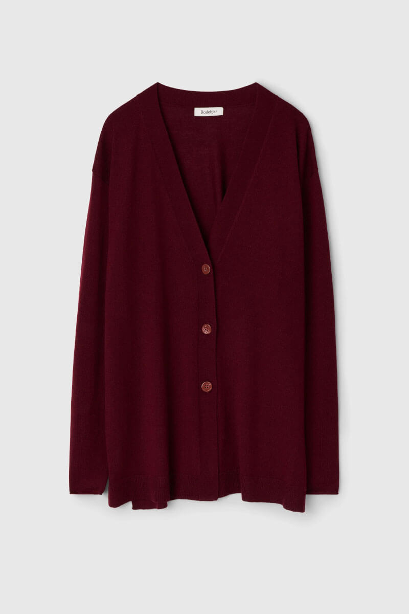 Vinröd stickad kofta med lös passform – perfekt att slänga över en vit t-shirt och kostymbyxor, eller knäppa över en sidenkjol för balans mellan rustikt och romantiskt. Värmen, färgen och känslan gör jobbet!Stickad kofta i merino ull med v-ringning, ribbstickade kanter, lös passform, stängs med knappar fram och fallande axelsömmar från Rodebjer.