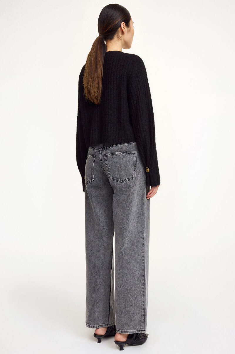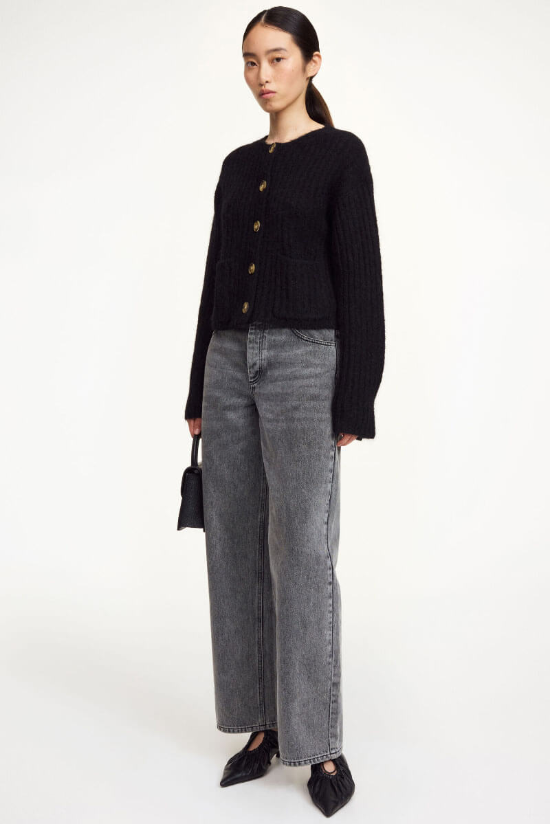 Svart ribbstickad kofta med knappar och fickor – tänk slarvigt öppen över ett linne och silkesbyxor, eller knäppt som topp till jeans med hög midja. Den lediga passformen ger en avslappnad look som ändå känns genomtänkt och mjuk.Stickad kofta i en ullblandning med rund halsringning, vida ärmar, något kort modell, fallande axelsömmar, fickor fram och ledig passform från By Malene Birger.
