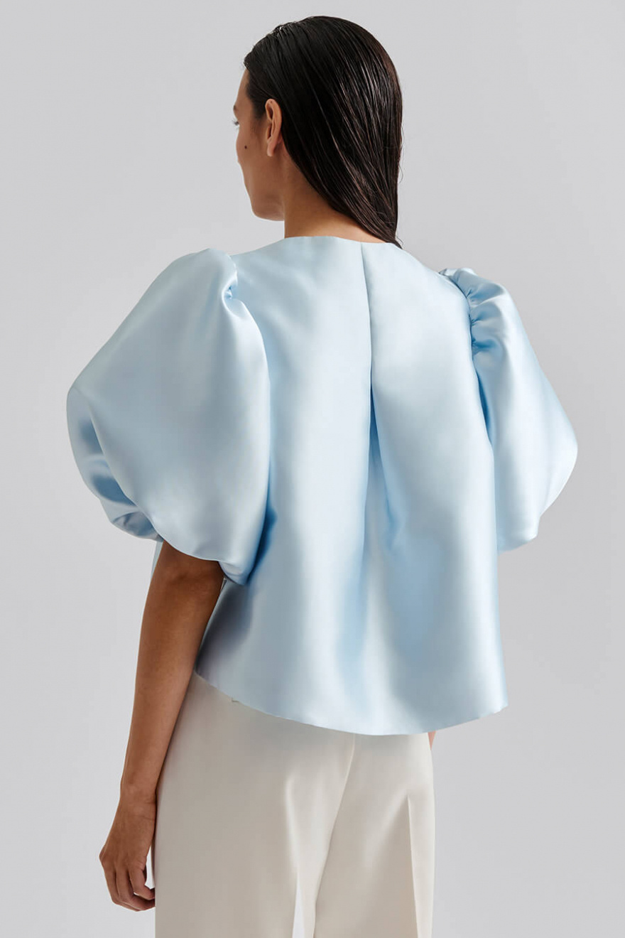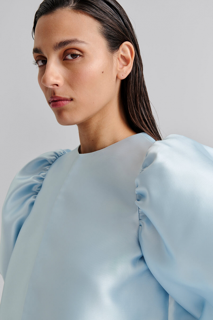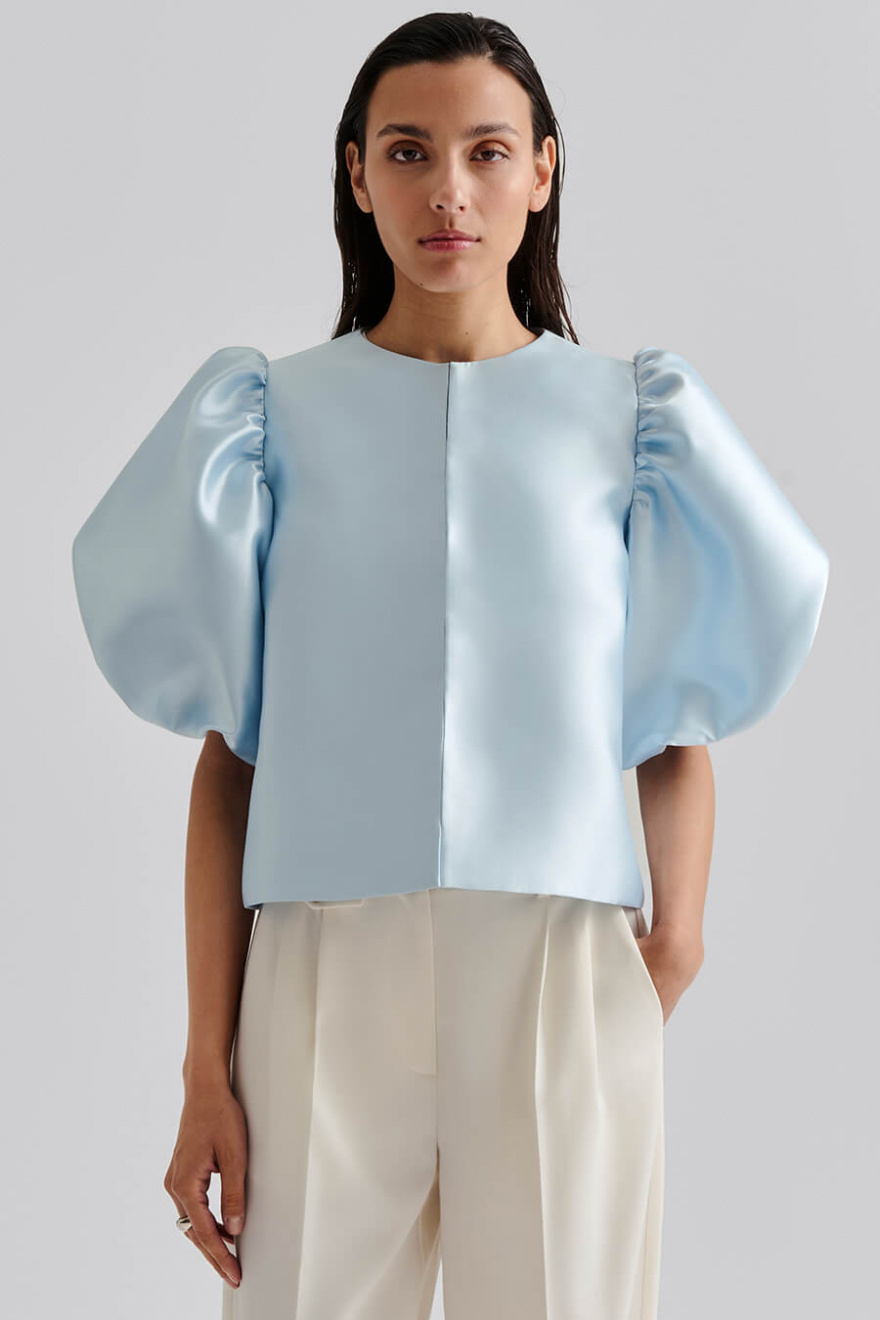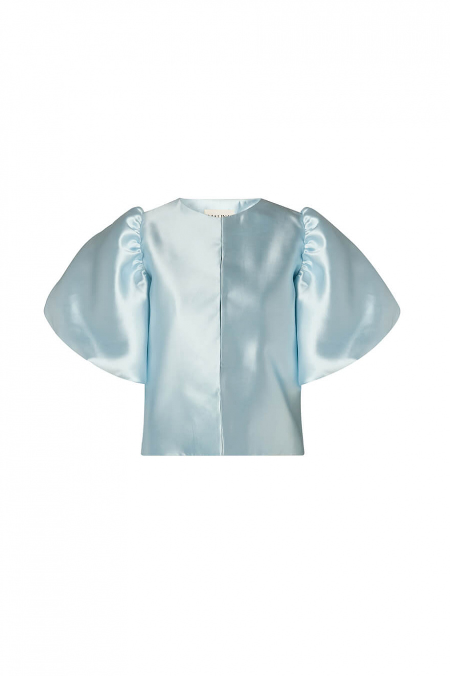 Denna isblå blus med voluminösa puffärmar och en skarp siluett är nyckeln till en uppdaterad look. Sofistikerad men lekfull – perfekt att styla med både jeans och skräddade byxor. En blus som alltid levererar.Blus i fin glans med puffig ballongärm, stängs med hyskor fram och ledig passform från Malina.