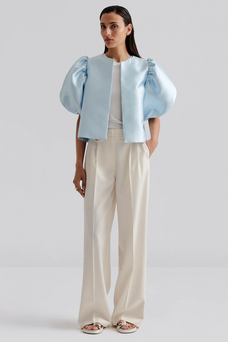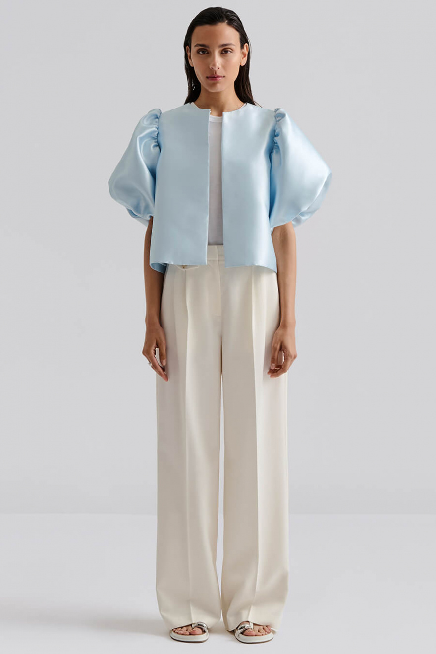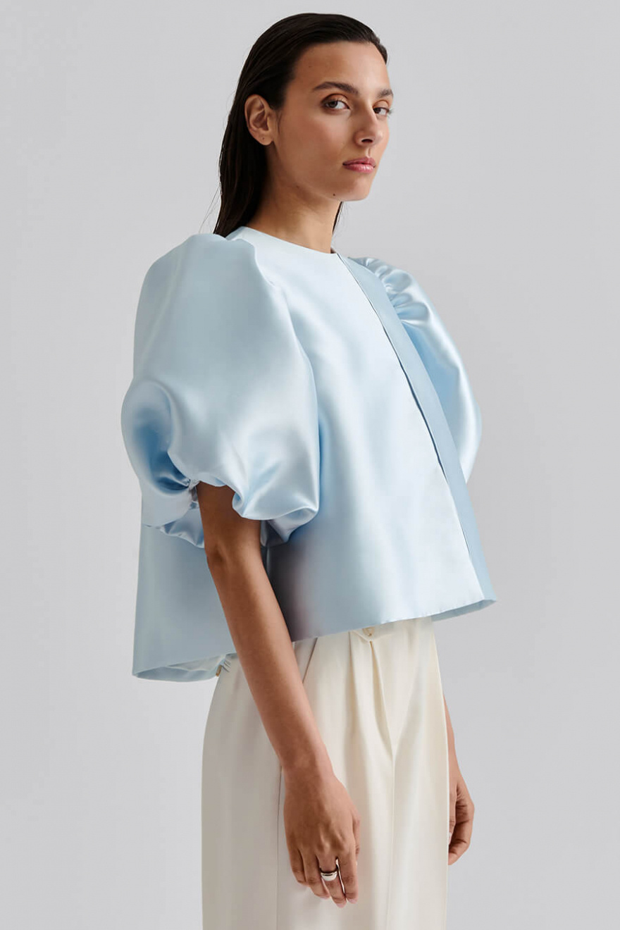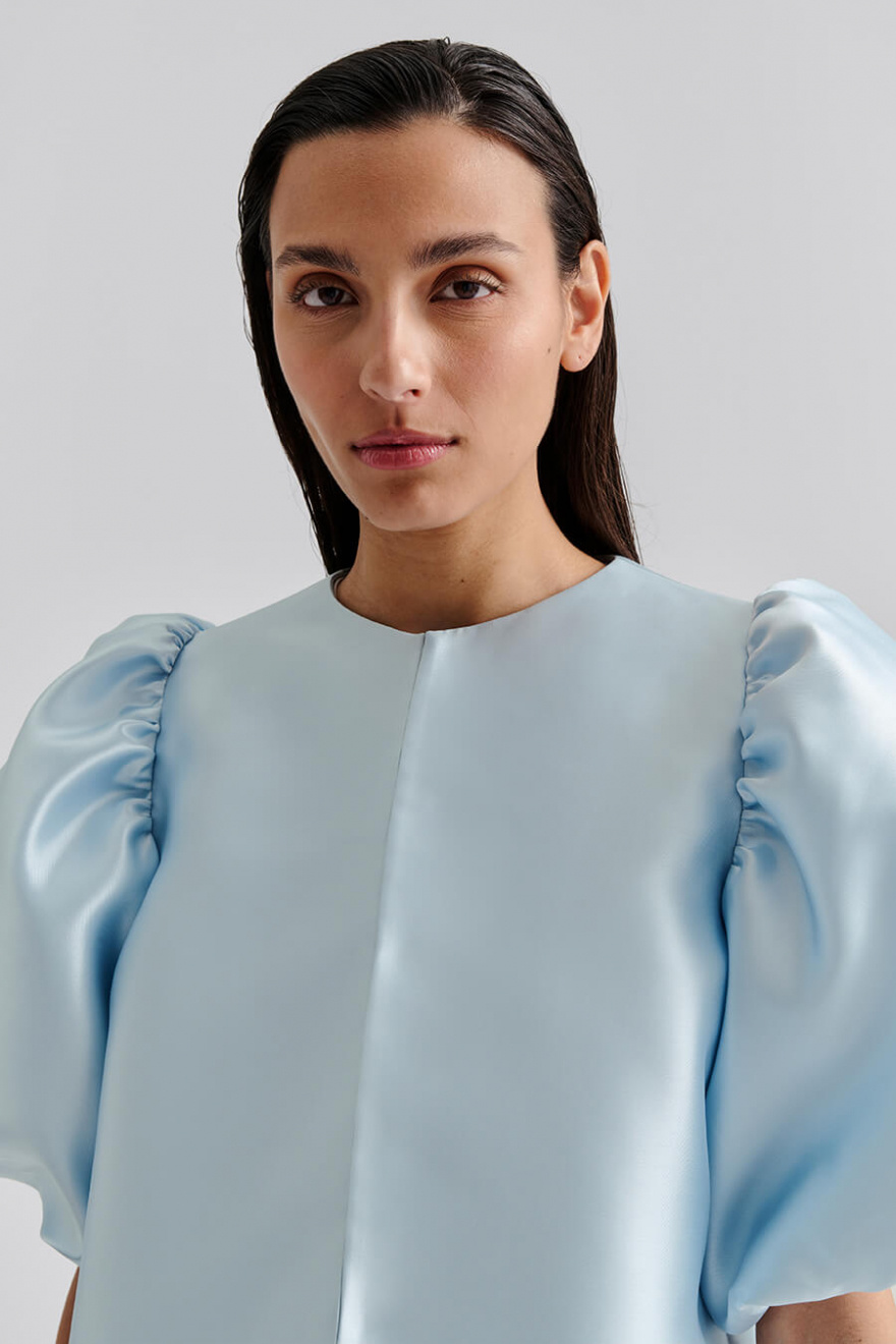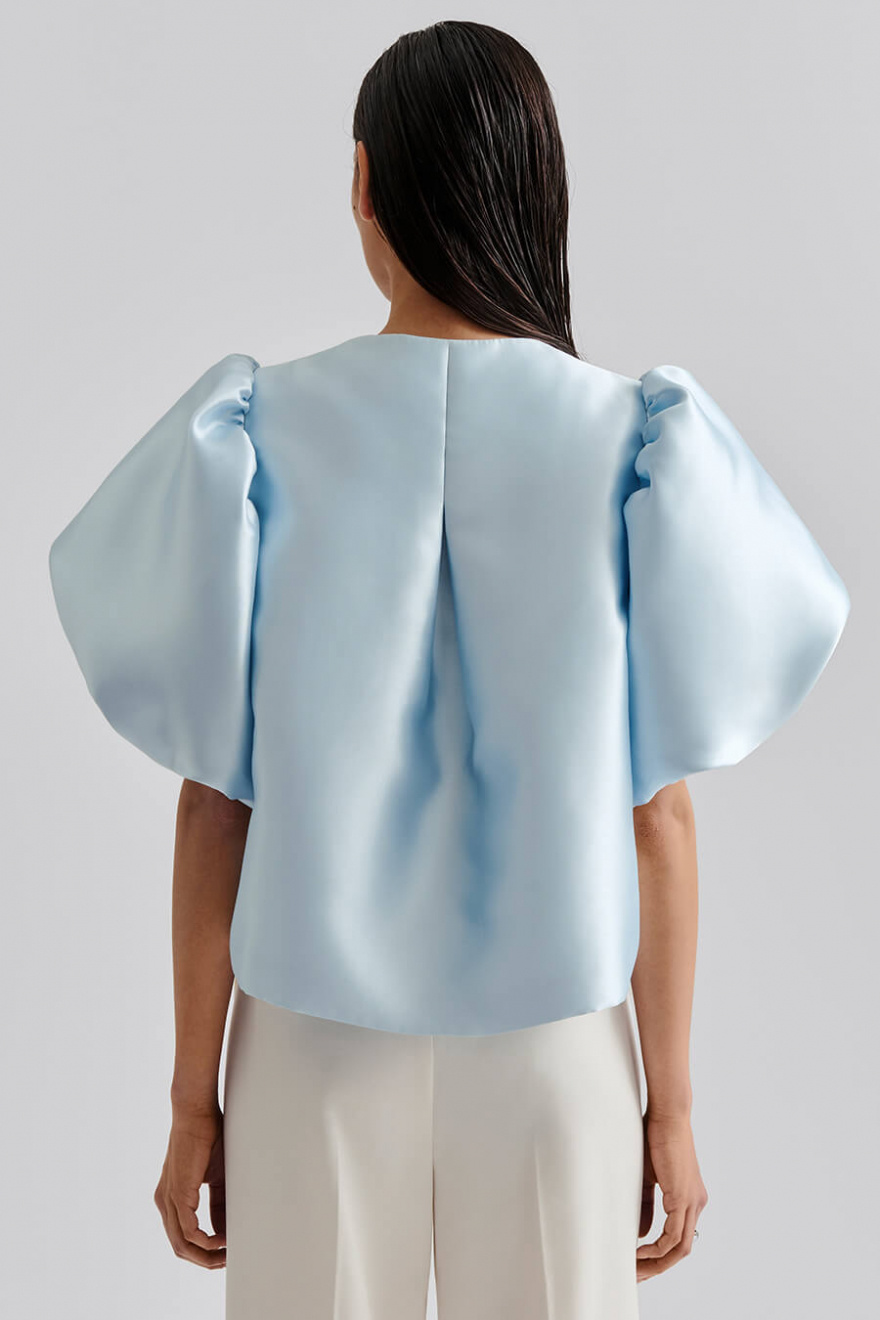 Denna isblå blus med voluminösa puffärmar och en skarp siluett är nyckeln till en uppdaterad look. Sofistikerad men lekfull – perfekt att styla med både jeans och skräddade byxor. En blus som alltid levererar.Blus i fin glans med puffig ballongärm, stängs med hyskor fram och ledig passform från Malina.