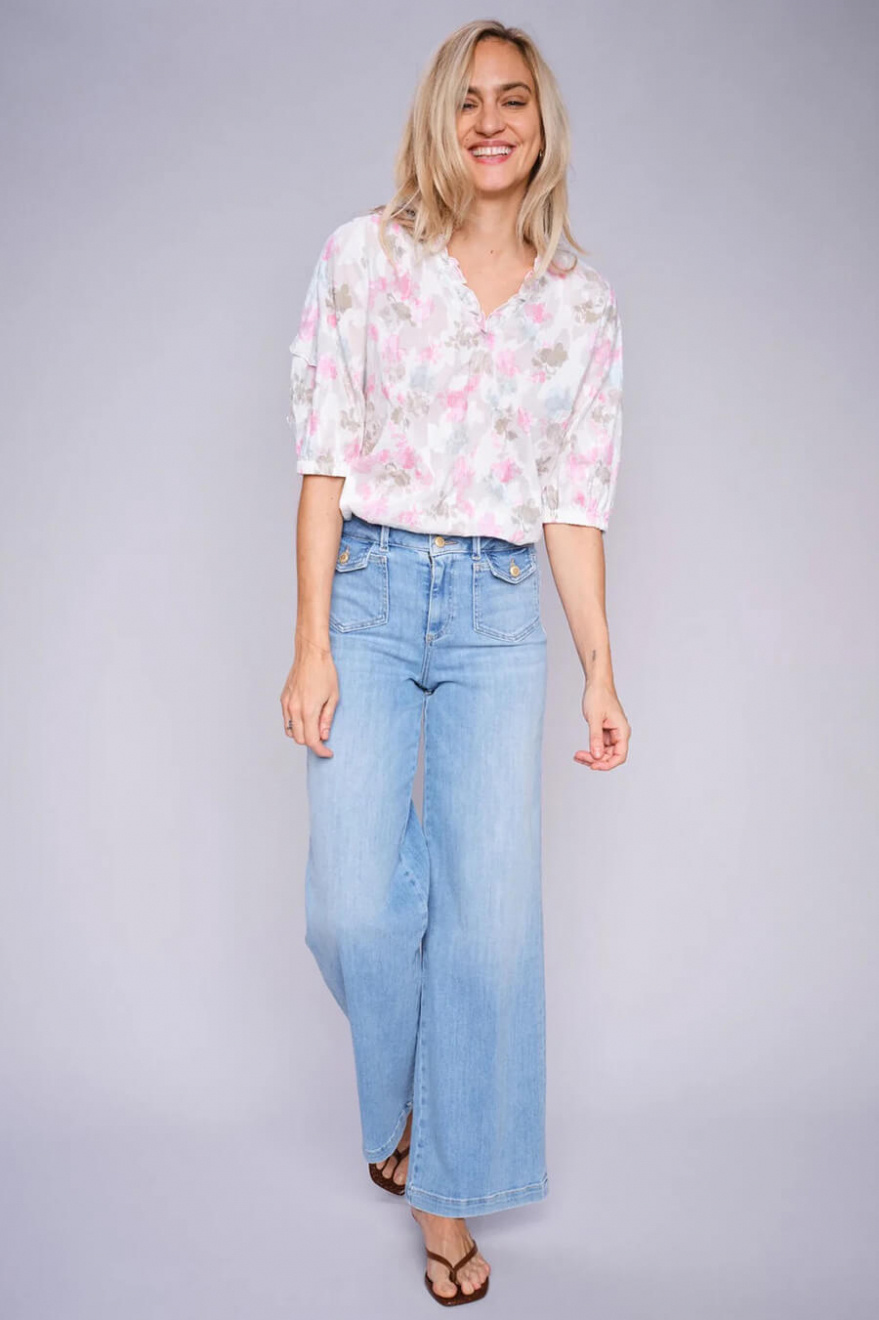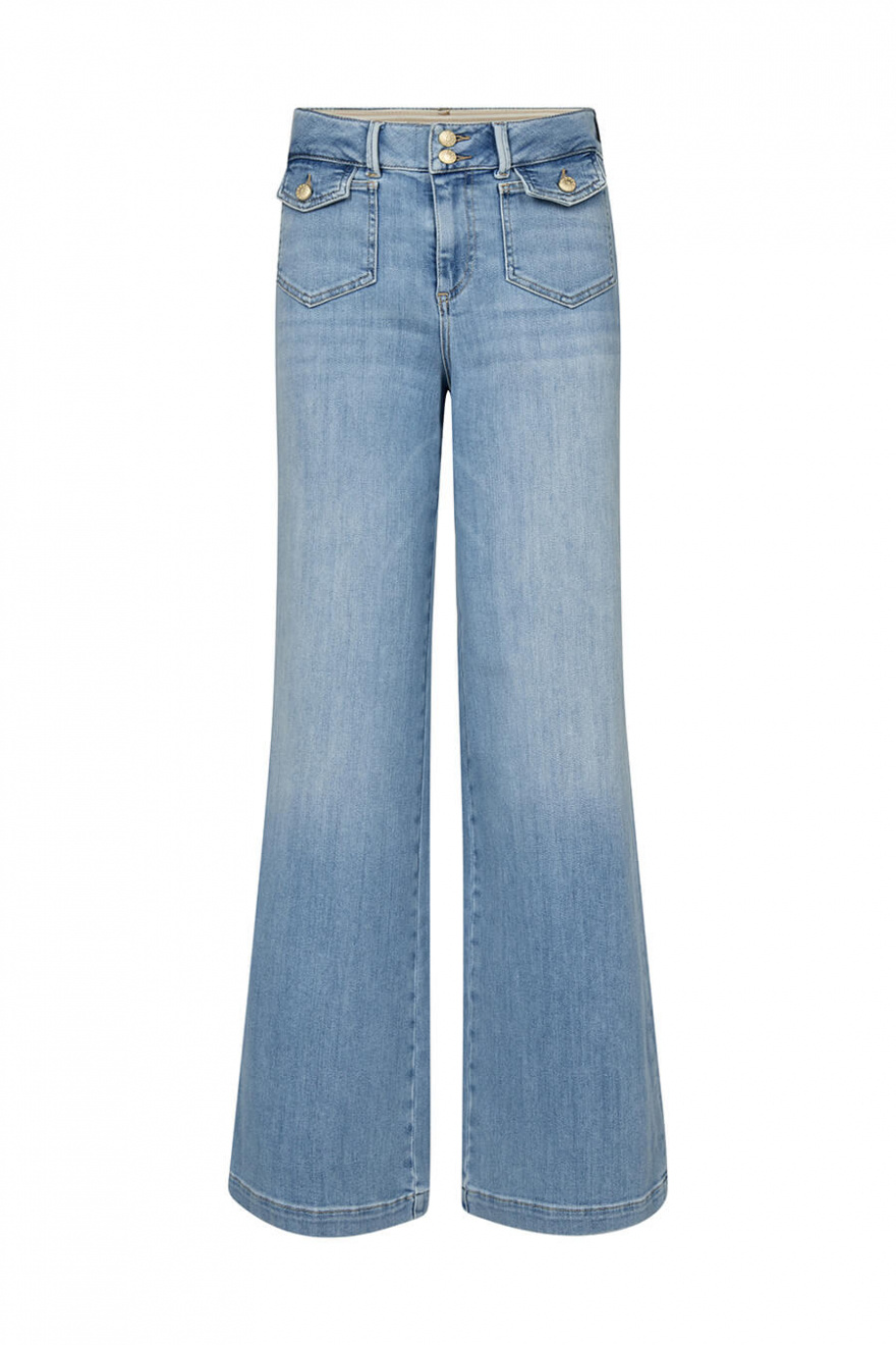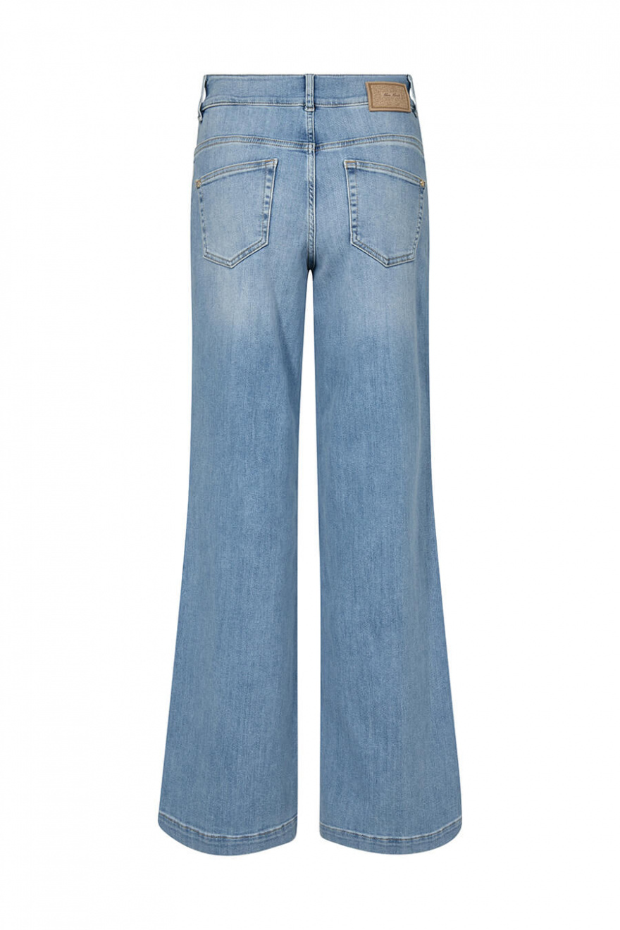 Denimdrömmen du letat efter. Ljusblå jeans med hög midja och vida, ankelkorta ben – lika perfekta till loafers som klackar. En smickrande silhuett som ger rätt mängd edge och elegans.Jeans i en mjuk bomullsblandning med högmidja, stretch, dekorativa fickor fram, vida och ankelkorta ben från MosMosh.