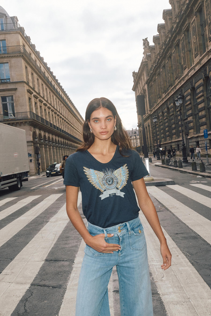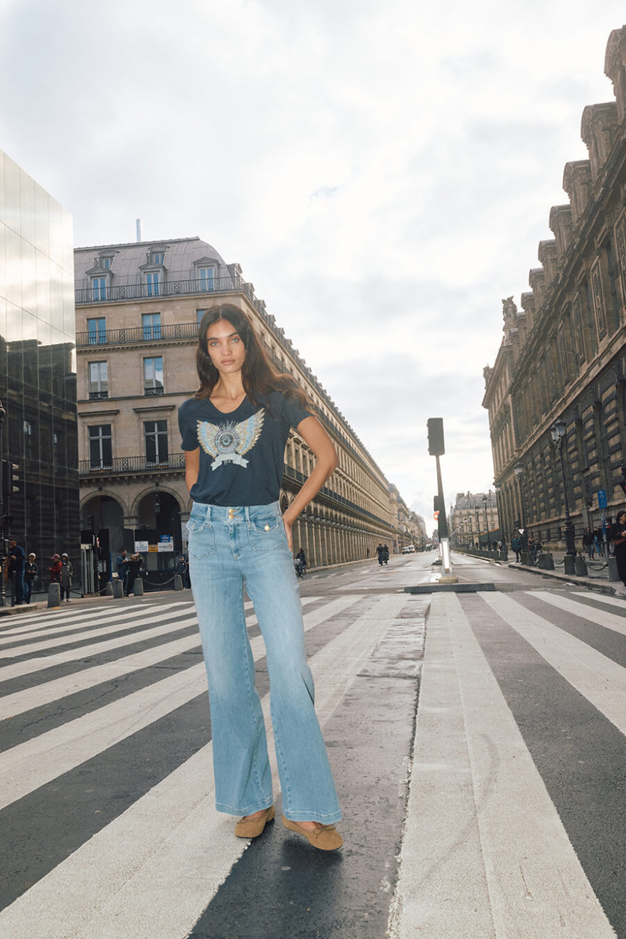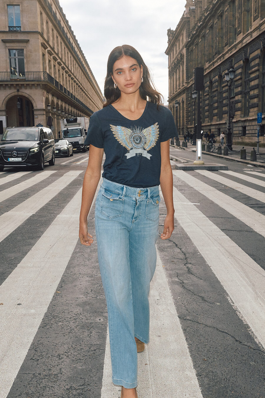 Denimdrömmen du letat efter. Ljusblå jeans med hög midja och vida, ankelkorta ben – lika perfekta till loafers som klackar. En smickrande silhuett som ger rätt mängd edge och elegans.Jeans i en mjuk bomullsblandning med högmidja, stretch, dekorativa fickor fram, vida och ankelkorta ben från MosMosh.
