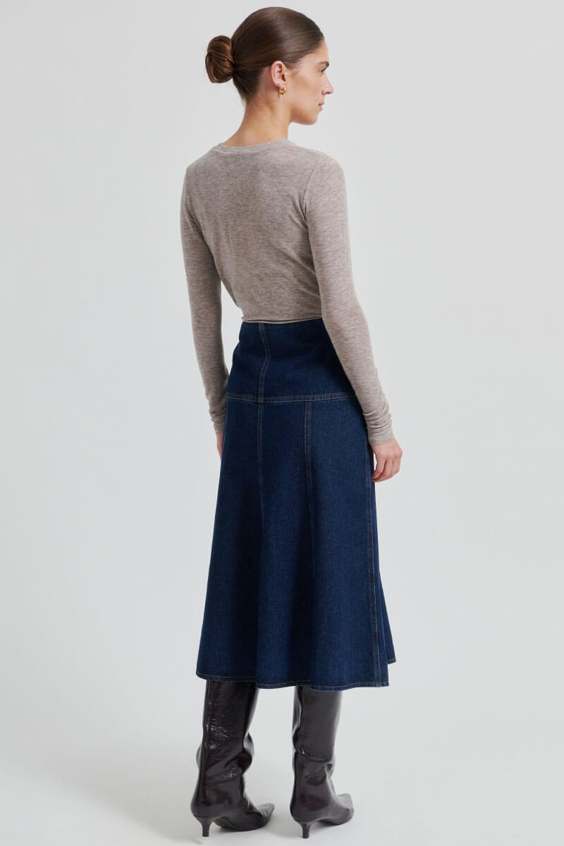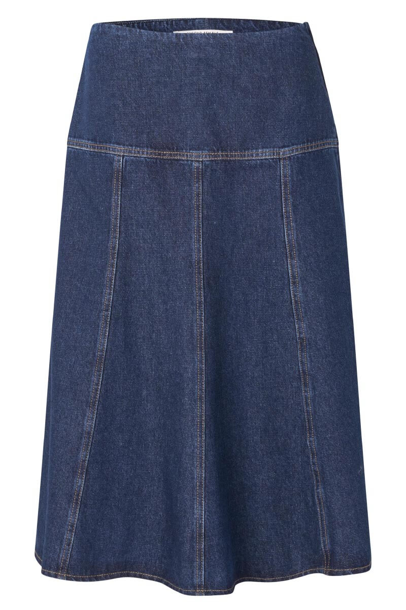 Denimkjol i mörkblå tvätt med kontrastsömmar, dold dragkedja baktill och vertikala sömdetaljer från Second Female.- Normal i storlek, figurnära i midjan med lätt utsvängd silhuett