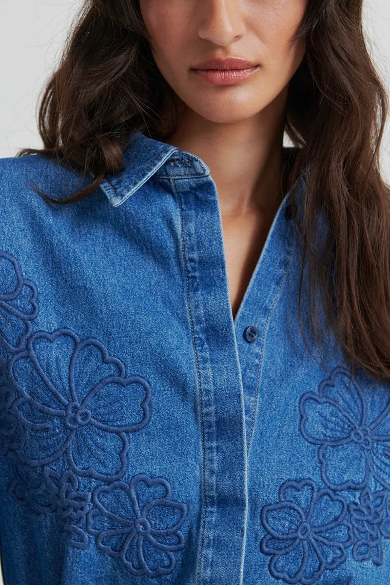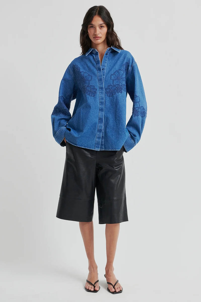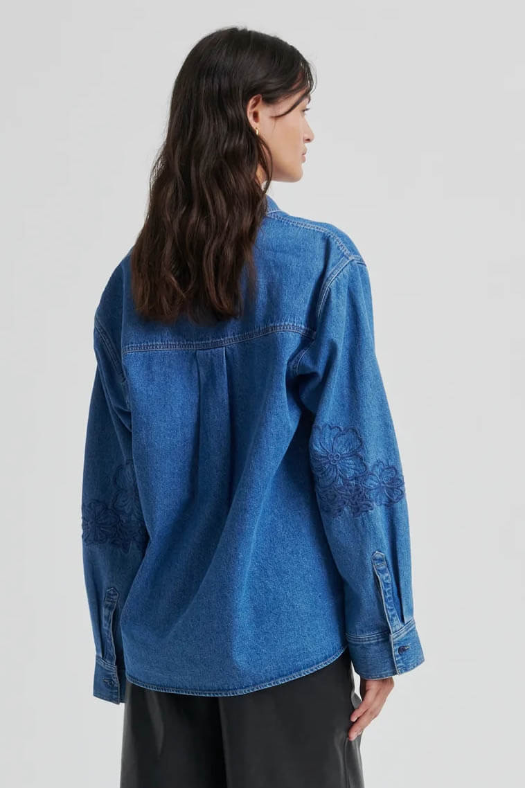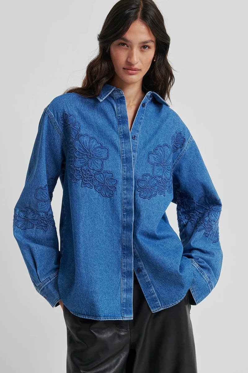 Denimskjorta från Second Female i mjuk bomullsdenim med en tvätt i vintageblå ton, snygg både knäppt som öppen över en vit t-shirt.Skjortan har ton-i-ton-broderade detaljer som ger ett subtilt och exklusivt uttryck.
