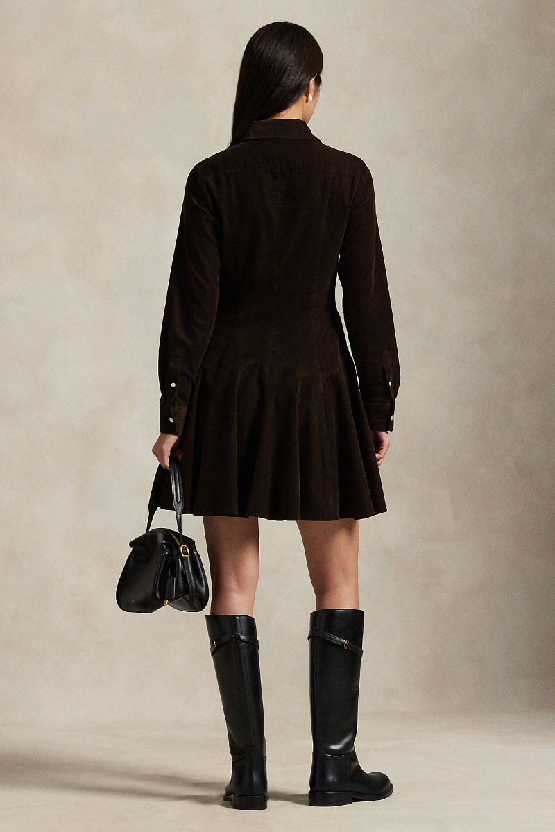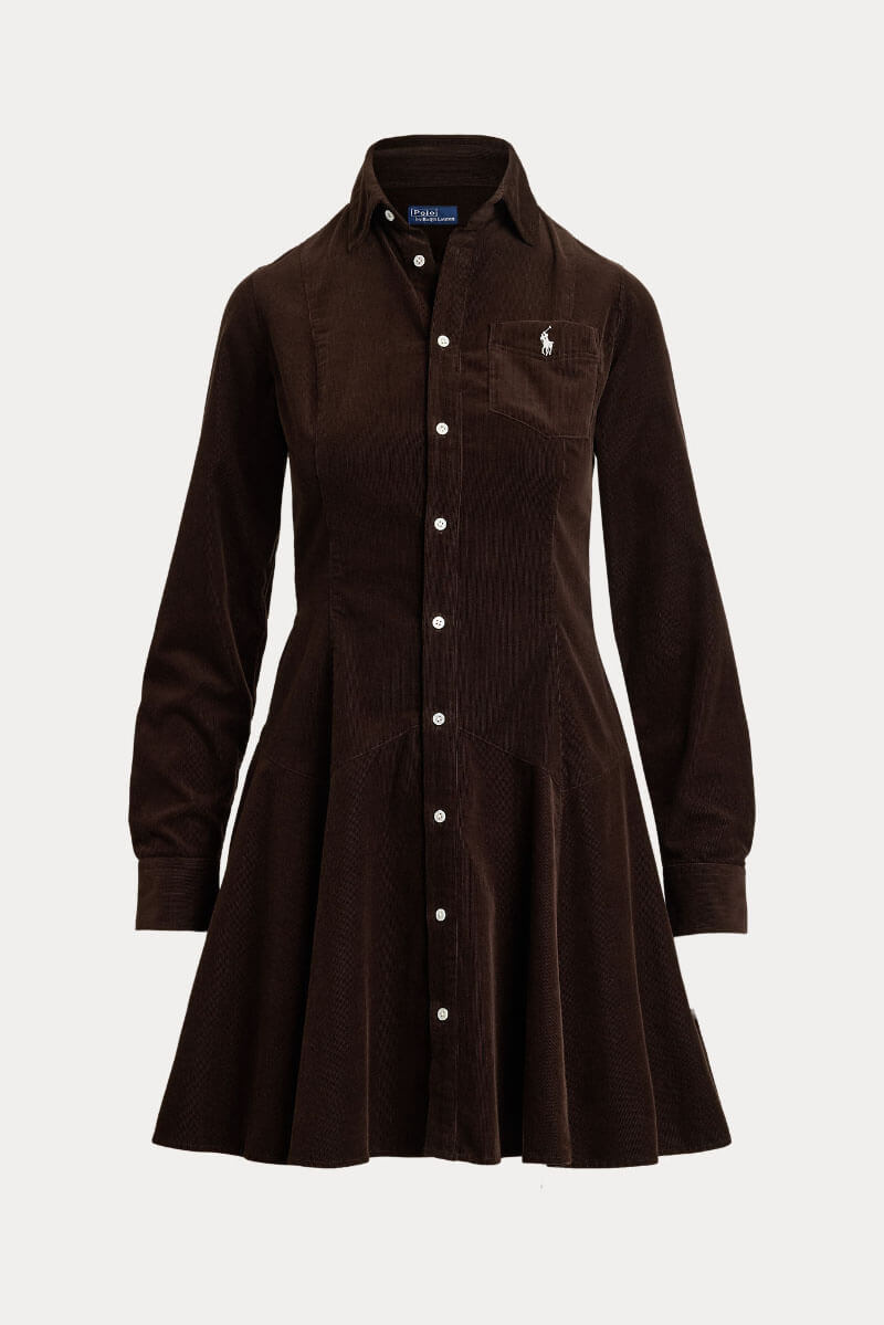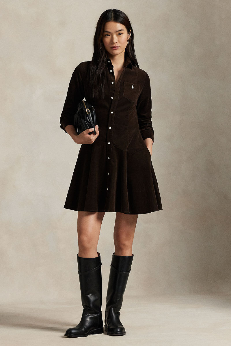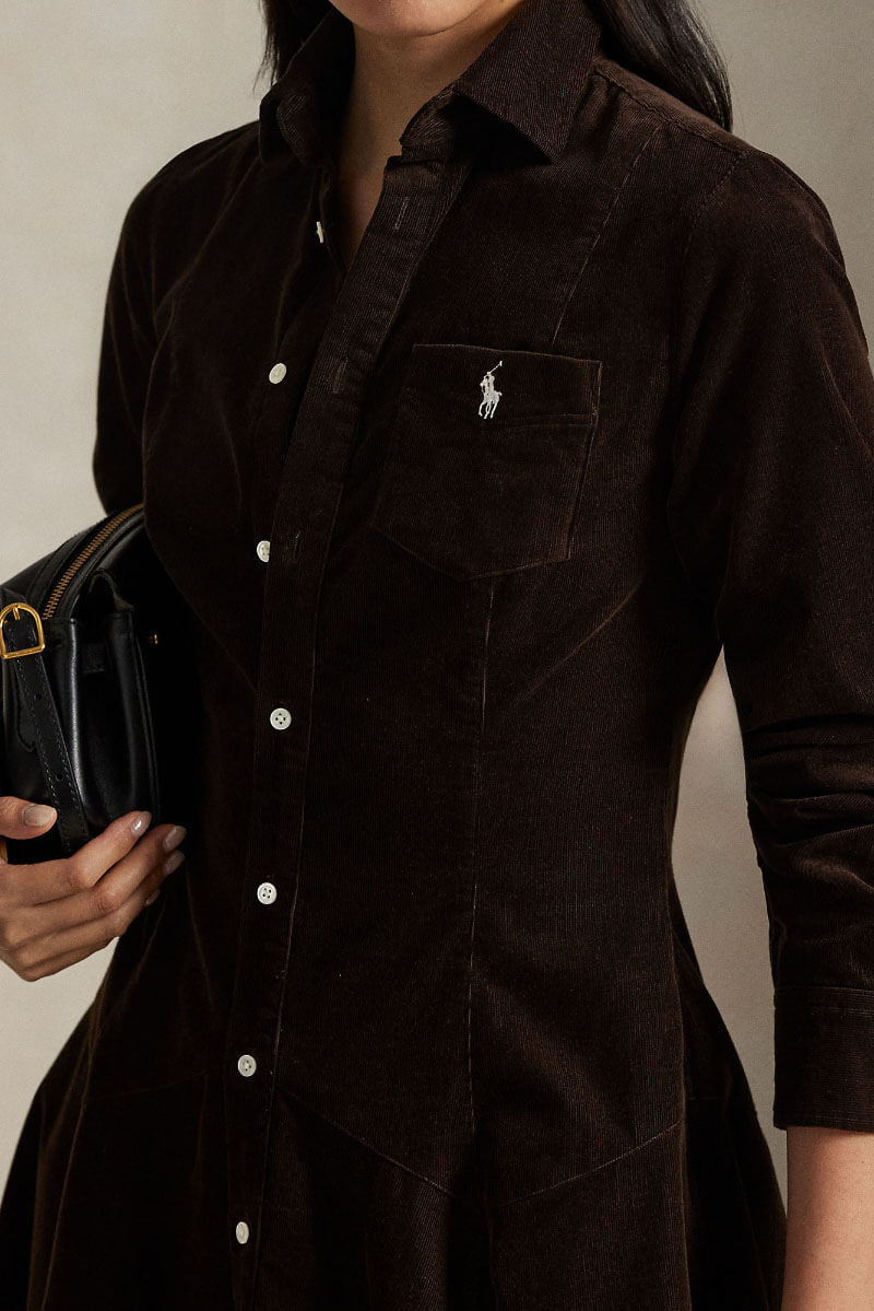 En brun manchesterklänning med krage och knälång silhuett är höstens mest avslappnat eleganta plagg. Styla med tjockare strumpbyxor och boots för vardagens enkelhet, eller addera smala läderbälten och höga stövlar för en mer sofistikerad look med retroton.Kort klänning i manchester med krage, insvängd modell, stängs med knappar fram och liten broderad logga på bröstfickan från Polo Ralph Lauren.