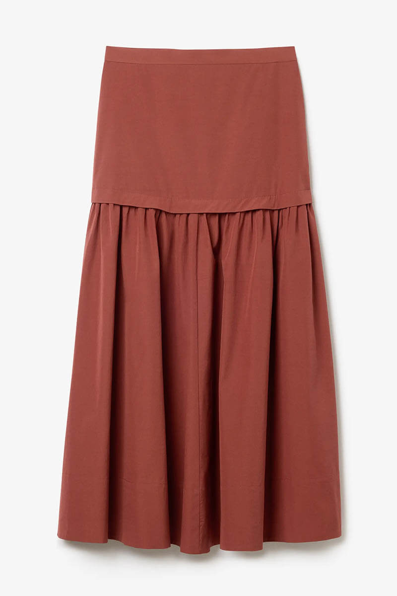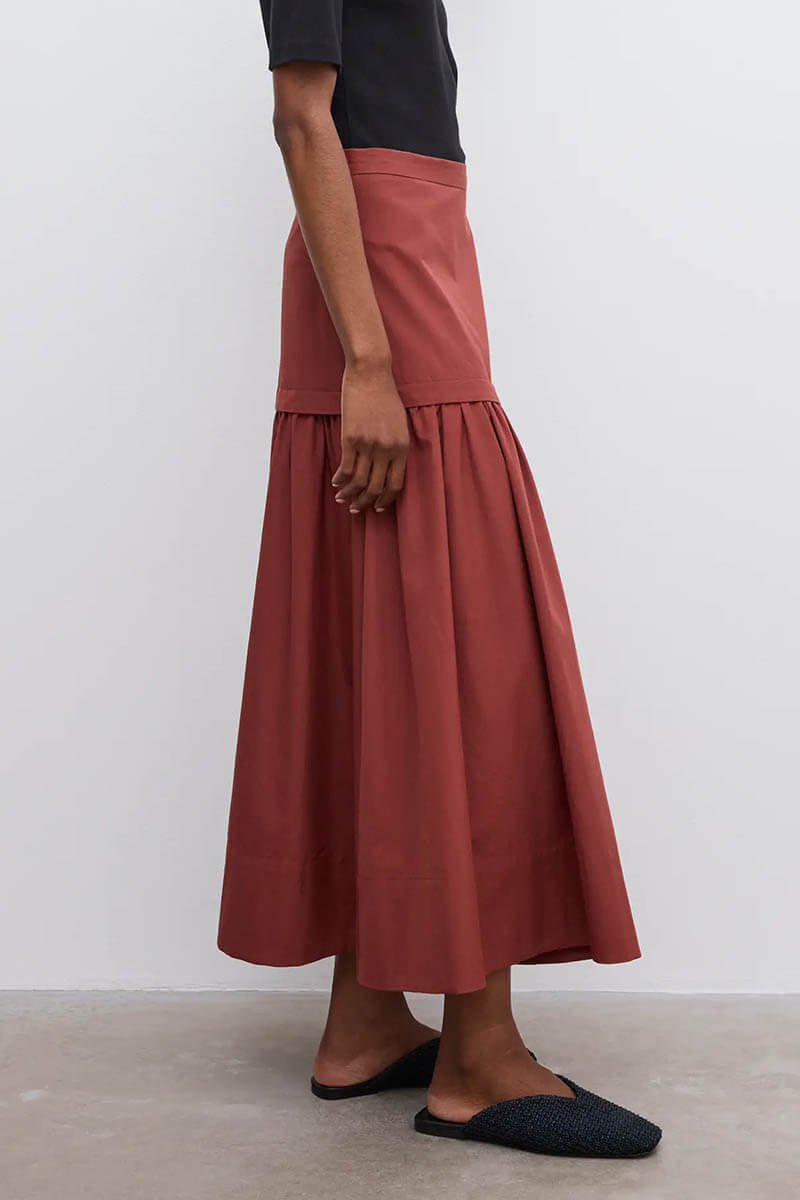 Fotlång kjol i exklusiv ekologisk bomullspoplin med silkeslen känsla.Designad med en sofistikerad dubbel konstruktion: en skräddad, fodrad midjedel i midjehöjd som möter en elegant, veckad nederdel med vackert fall. Försluts med diskret dragkedja baktill.