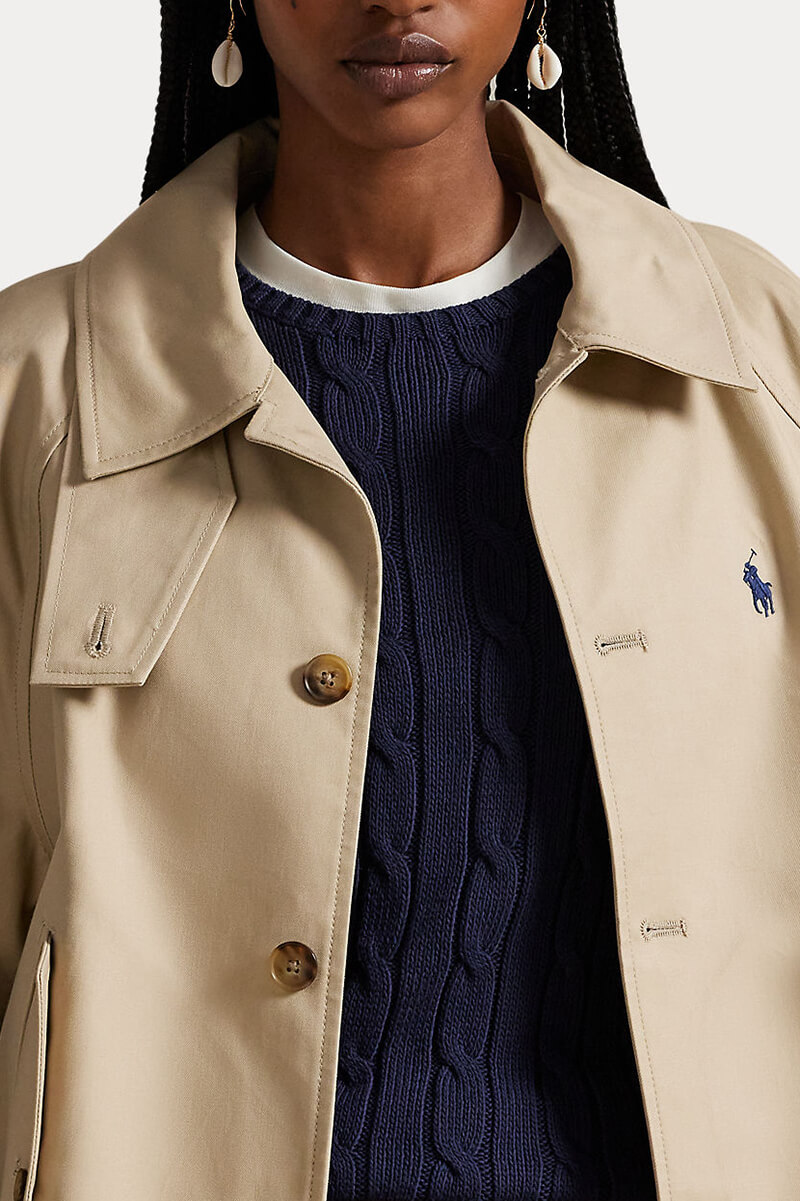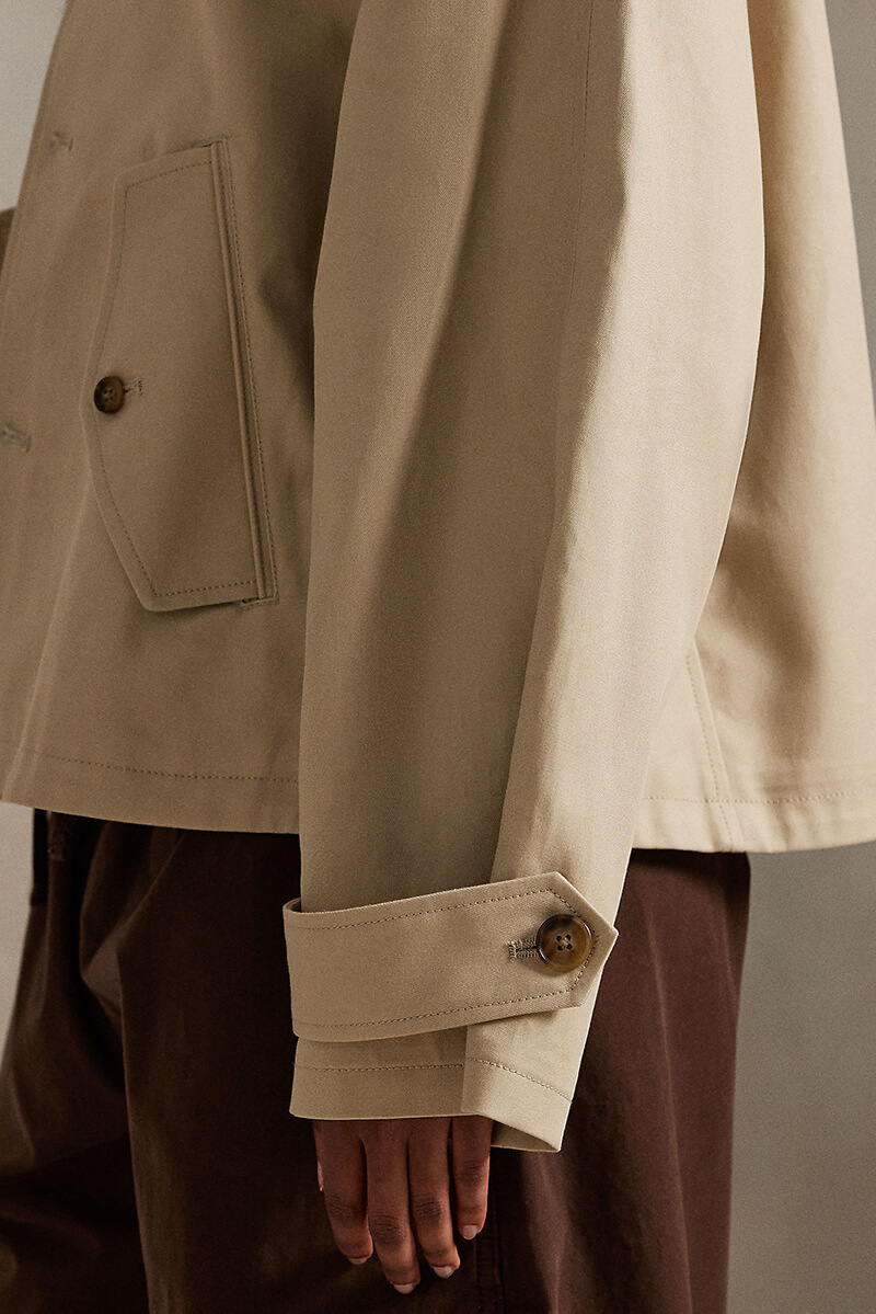 Jackan är designad att sluta vid höften och har genomtänkta detaljer som justerbar knapp vid halsen, långa raglanärmar samt justerbara knappdetaljer vid ärmsluten.
