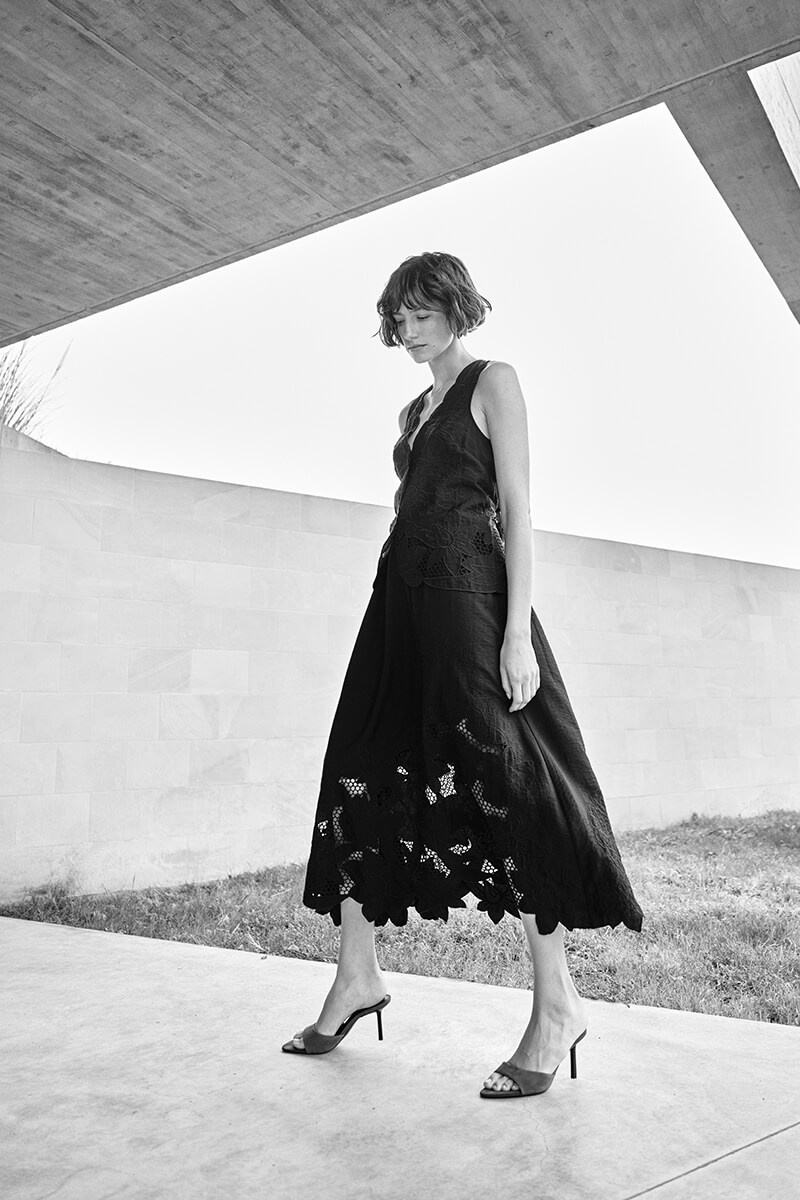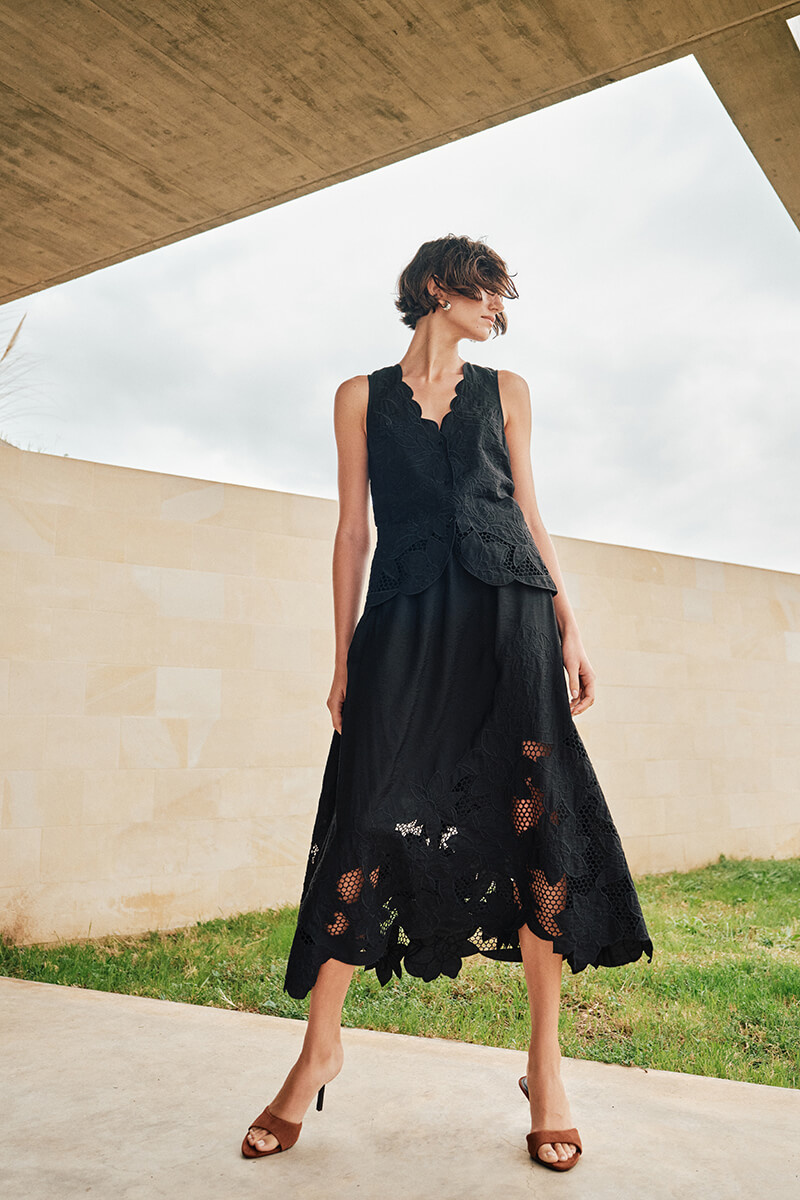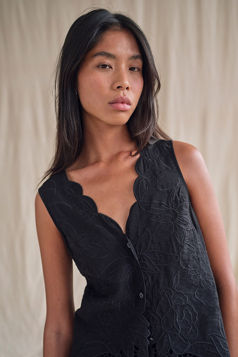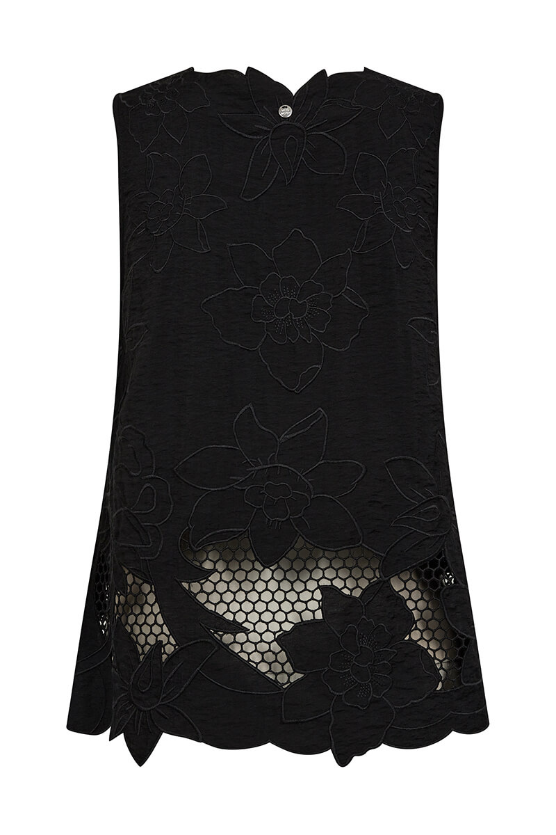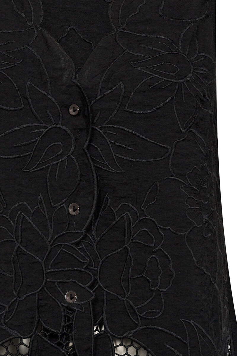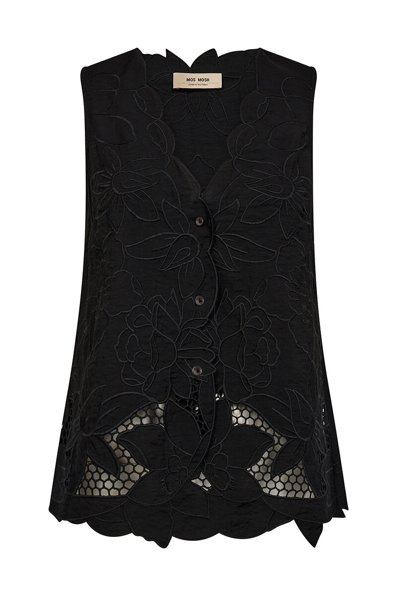 Låt din garderob tala med en svart ärmlös blus i exklusiv brodyr och skarpa detaljer. Perfekt till allt från linnebyxor till satinkjol. Tidlös, elegant och så rätt nu!Ärmlös blus i en viskosblandning med broderat mönster, något transparent nedtill, v-ringning, stängs med knappar fram och vågade kanter från MosMosh.