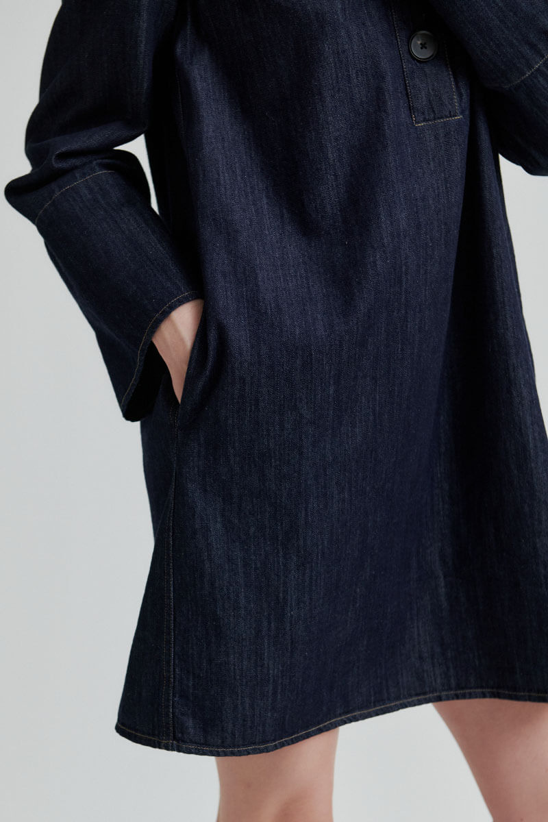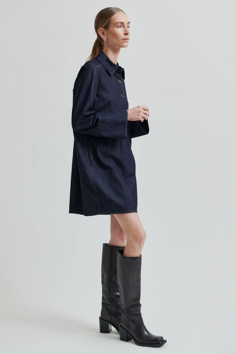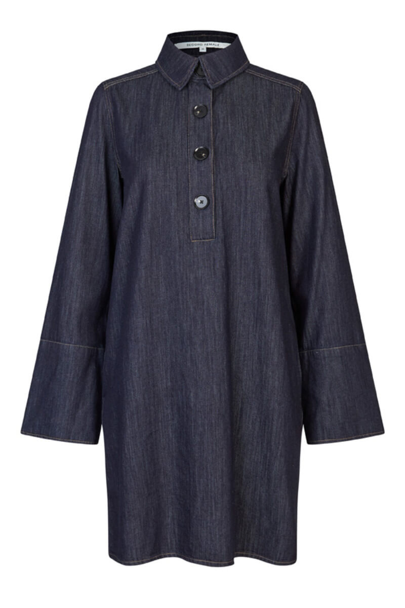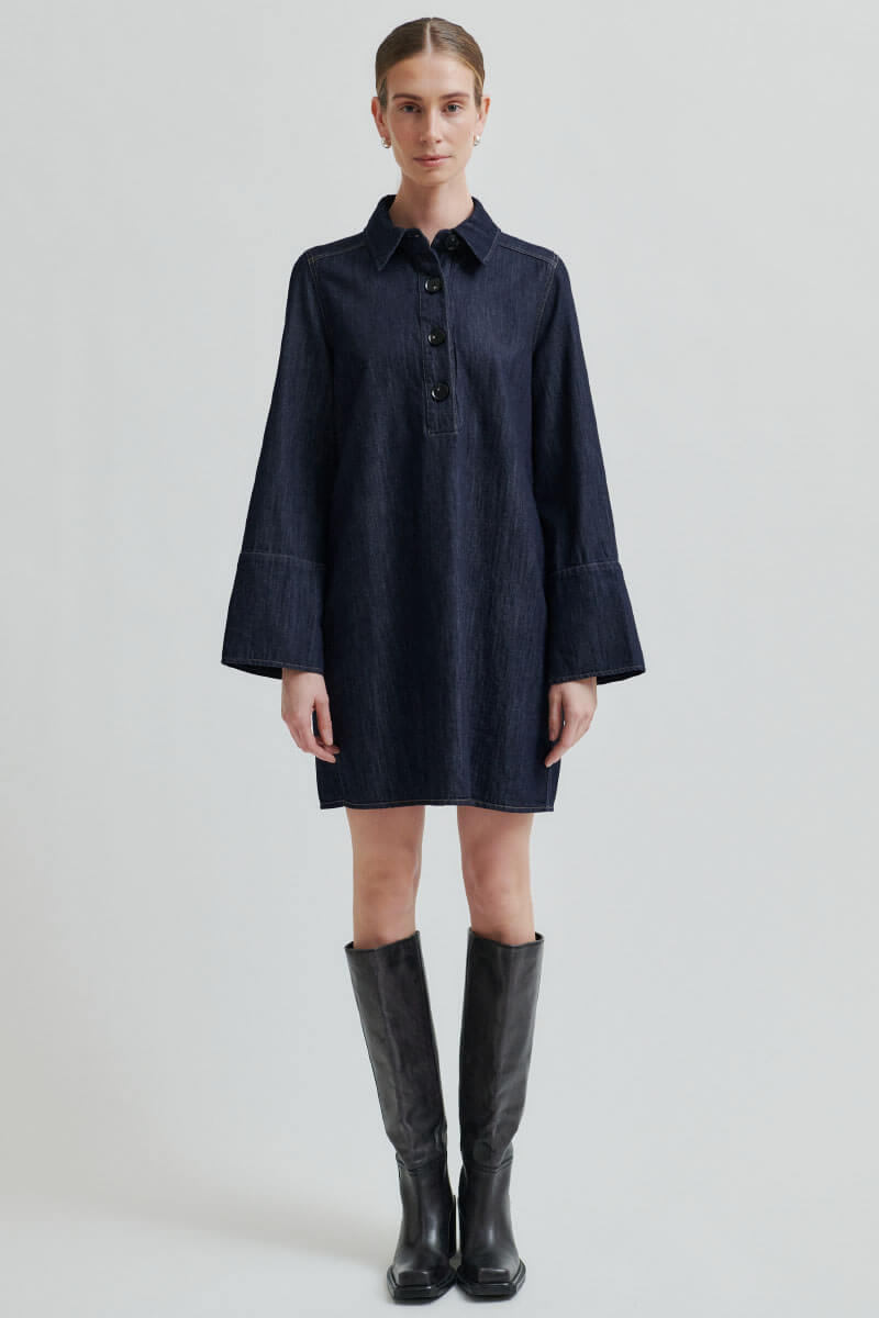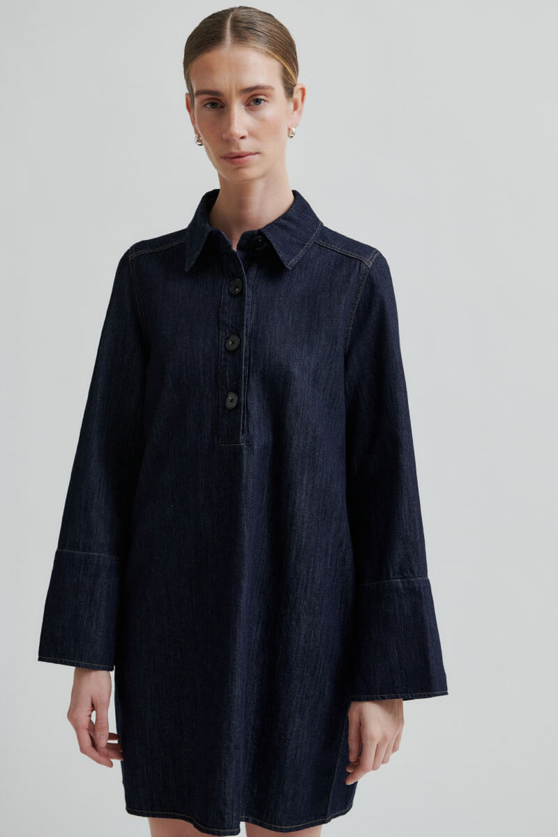 Denimklänningen som låter vardag möta stil med självsäkerhet. Bär den med loafers och färgglada strumpor för kontorstillfällen eller styla med höga stövlar och guldsmycken till middagen. Den avslappnade silhuetten gör varje rörelse till ett statement.Kort jeansklänning i bomull med krage, knappar fram, A-formad, långa vida ärmar och fickor i sidan från Second Female.
