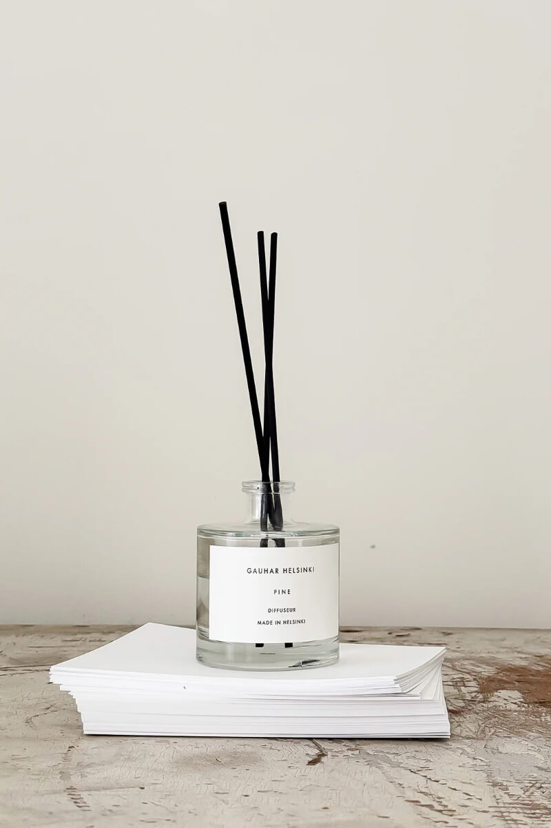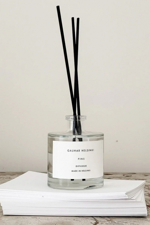 Doftpinnar i glasflaska med olja och frisk doft av tall skapar en elegant och lugn atmosfär hemma med en naturlig och inspirerande känsla i varje rum.Doftpinnar i glasflaska med olja doft av tall från Gauhar Helsinki.