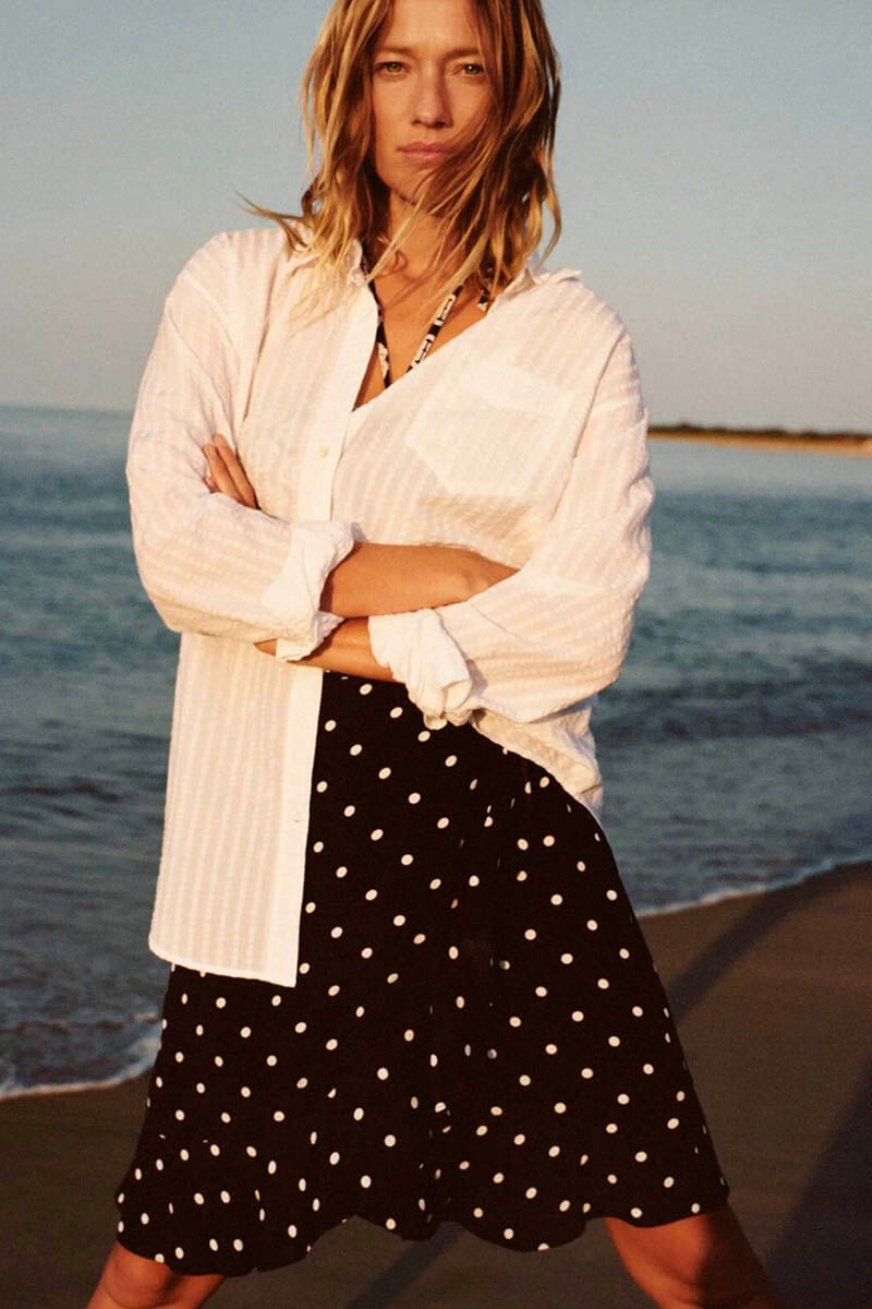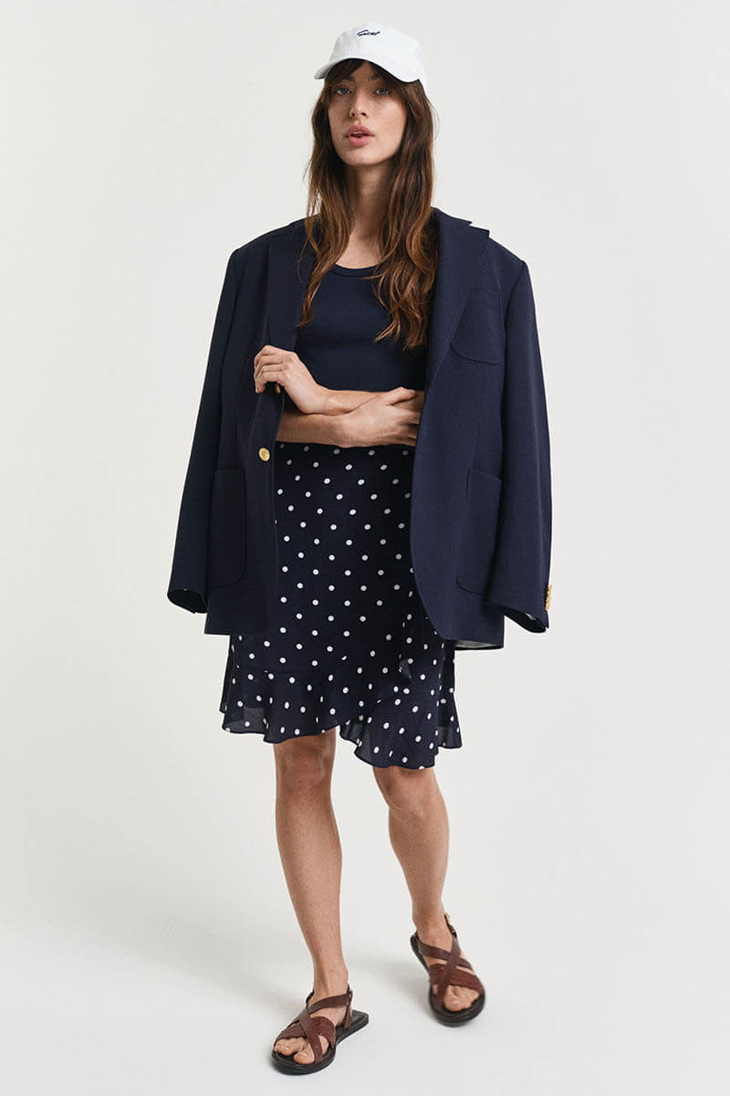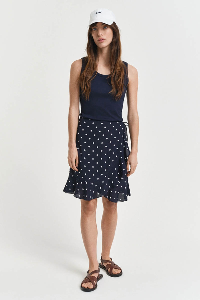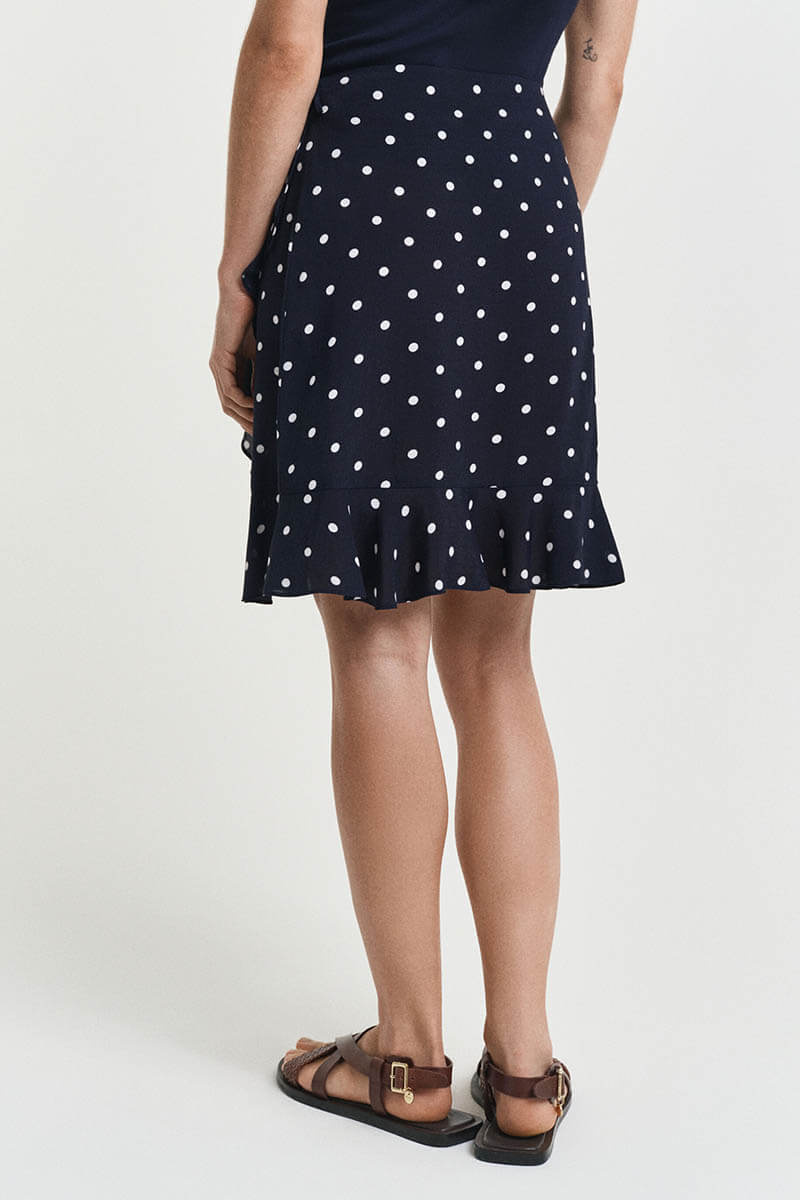 En prickig omlottkjol är ett evigt nyckelplagg. Denna tidlösa skönhet kombinerar klassisk design med feminin elegans. Perfekt till både vardag och sommarfest – en investering i stil som håller över tid.Prickig kjol i viskos med knyt i sidan, klockad modell och volangkant från Gant.