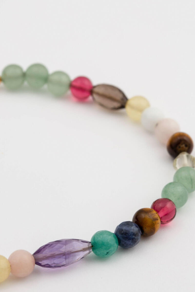 - De stenar som används är jade, rubinkvarts, rökkvarts, gul jade, vit agat, rosa opal, tigeröga, citronkvarts, sodalit, amazonit och ametist